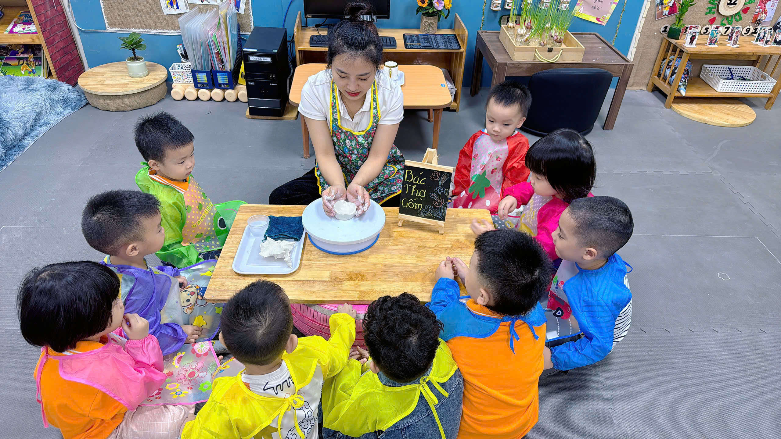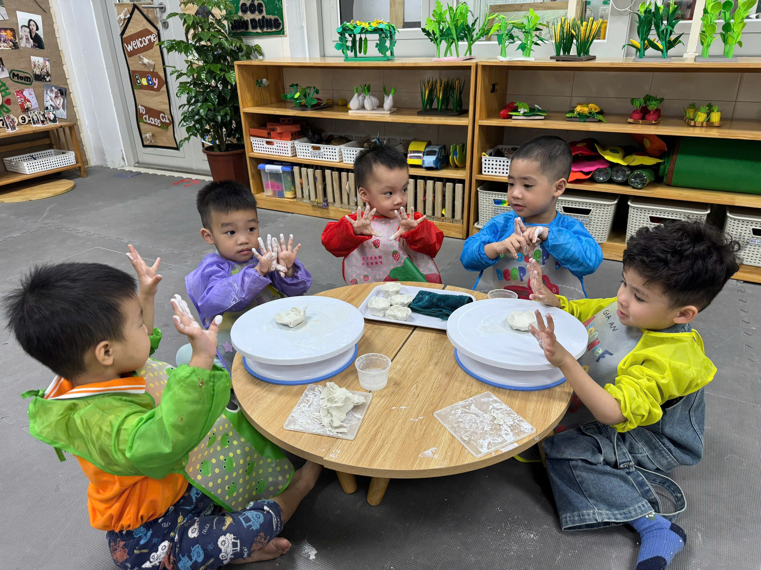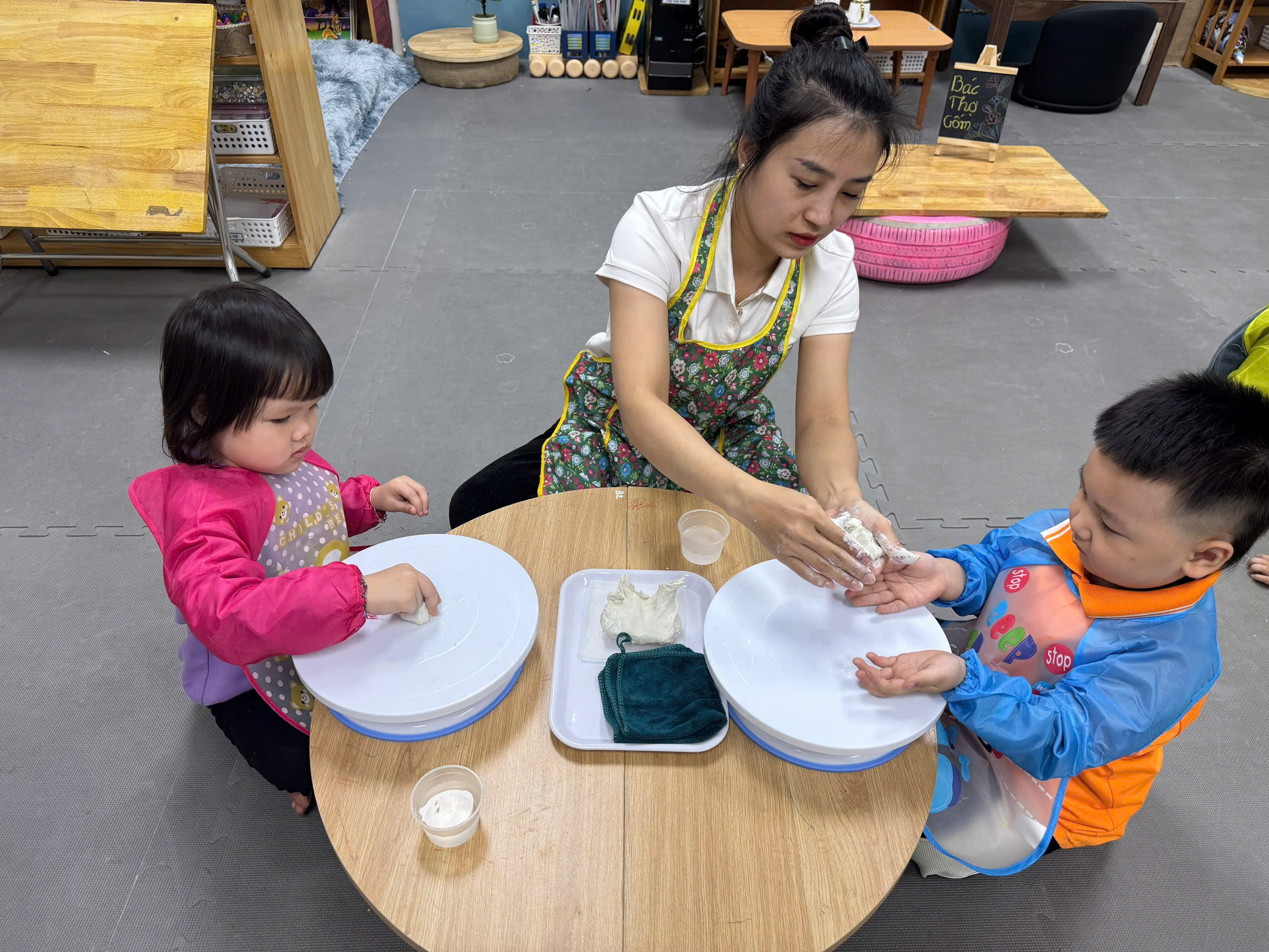 Ngay từ khi bắt đầu, đôi mắt tròn xoe của các con đã ánh lên sự tò mò khi được sờ, nắn và cảm nhận sự mềm mịn của đất sét. Dưới sự hướng dẫn nhẹ nhàng của cô, các bé được học cách vo tròn, ấn dẹt, kéo dài, rồi thử tạo nên những sản phẩm nhỏ xinh như chiếc bát, cái cốc.