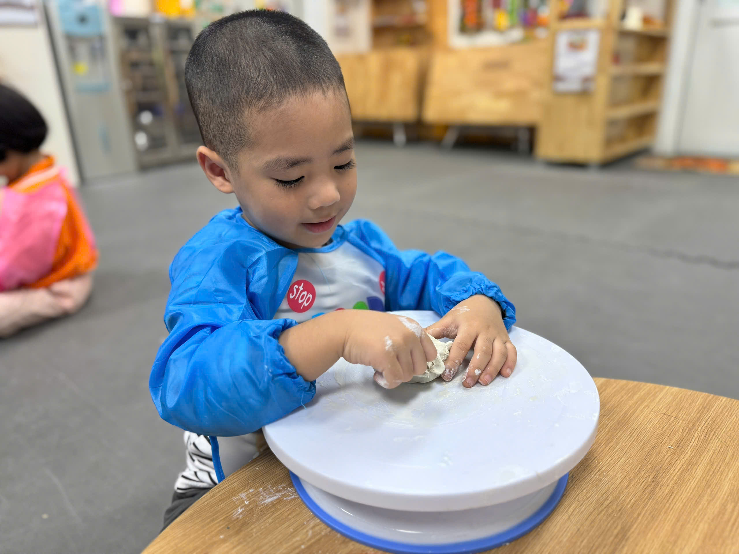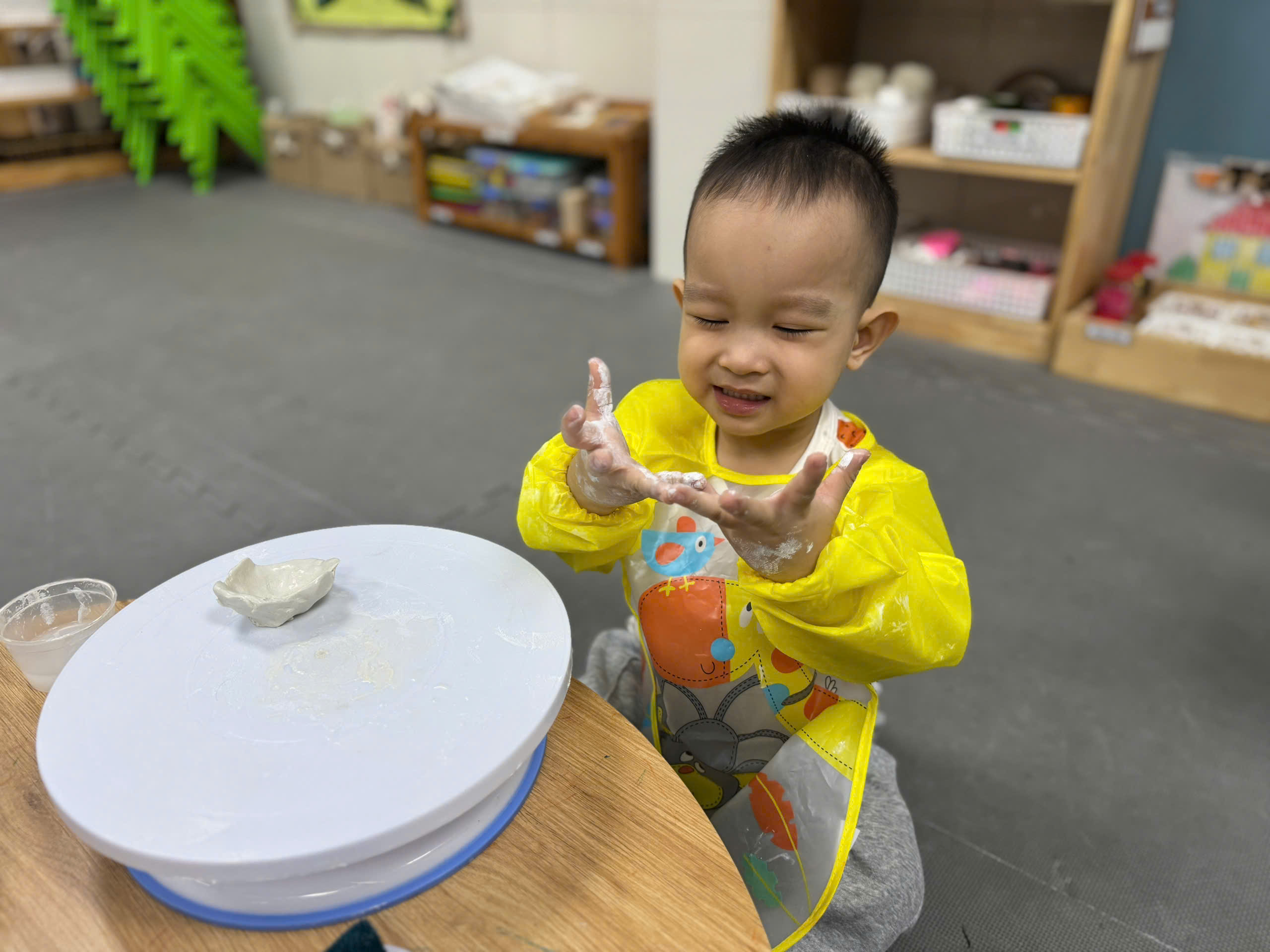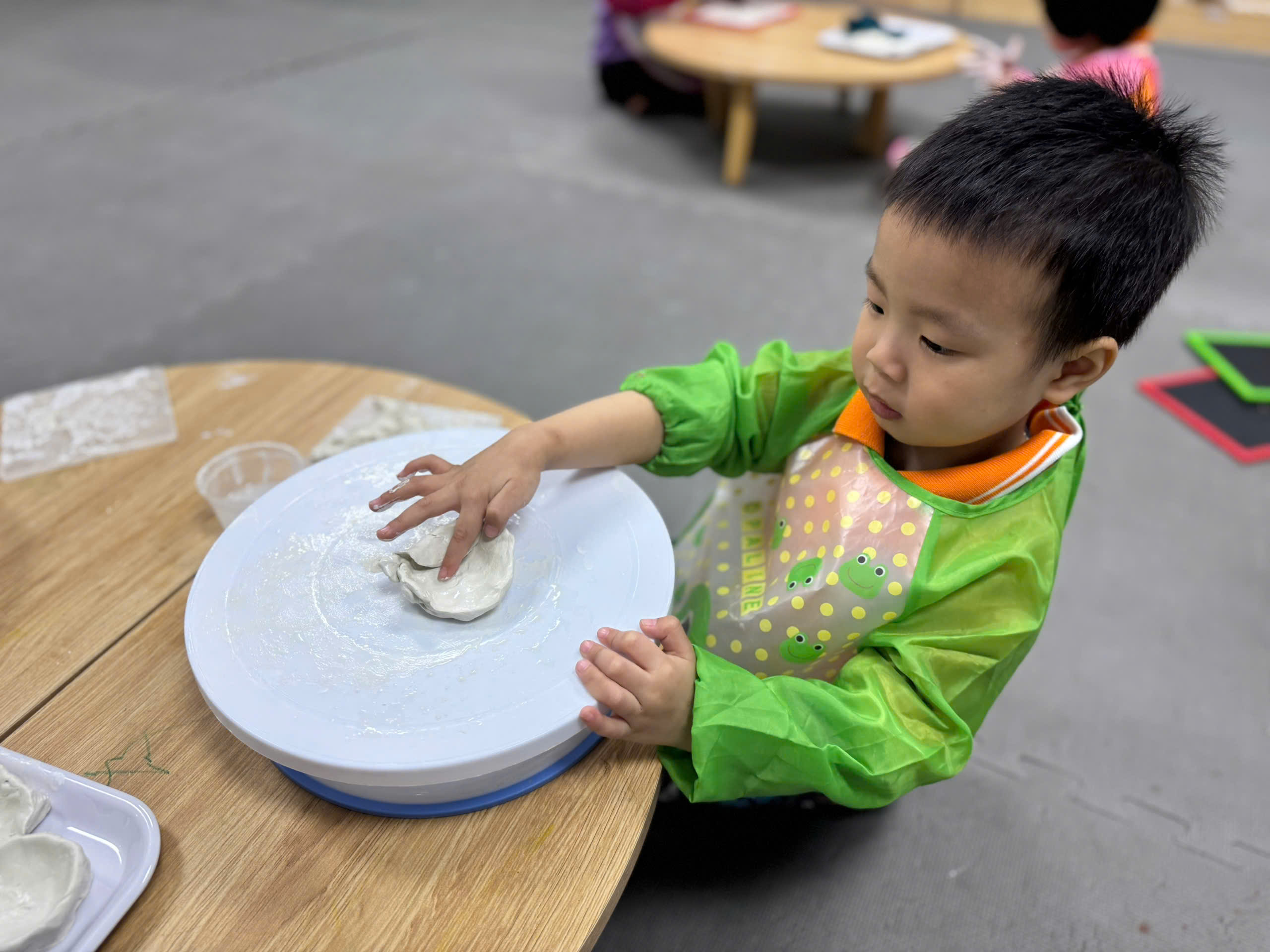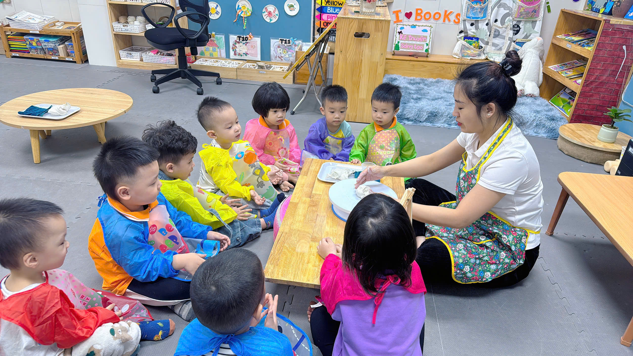 Ngay từ khi bắt đầu, đôi mắt tròn xoe của các con đã ánh lên sự tò mò khi được sờ, nắn và cảm nhận sự mềm mịn của đất sét. Dưới sự hướng dẫn nhẹ nhàng của cô, các bé được học cách vo tròn, ấn dẹt, kéo dài, rồi thử tạo nên những sản phẩm nhỏ xinh như chiếc bát, cái cốc.