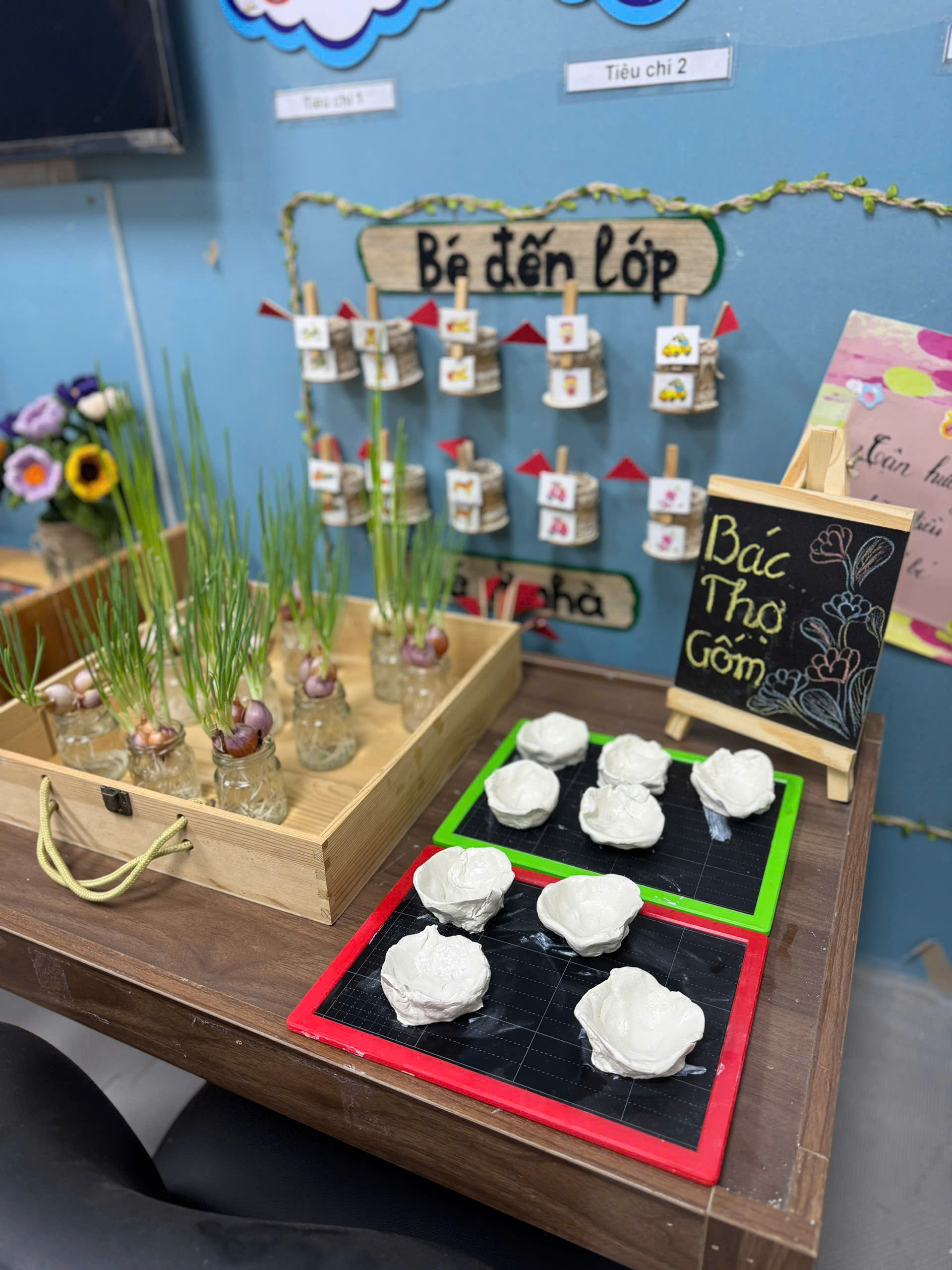 Kết thúc buổi trải nghiệm, những “tác phẩm gốm đầu đời” của các bé đã được trưng bày ngay trong lớp học. Bé nào cũng tự hào nâng niu thành quả của mình và háo hức khoe với cô, với bạn.