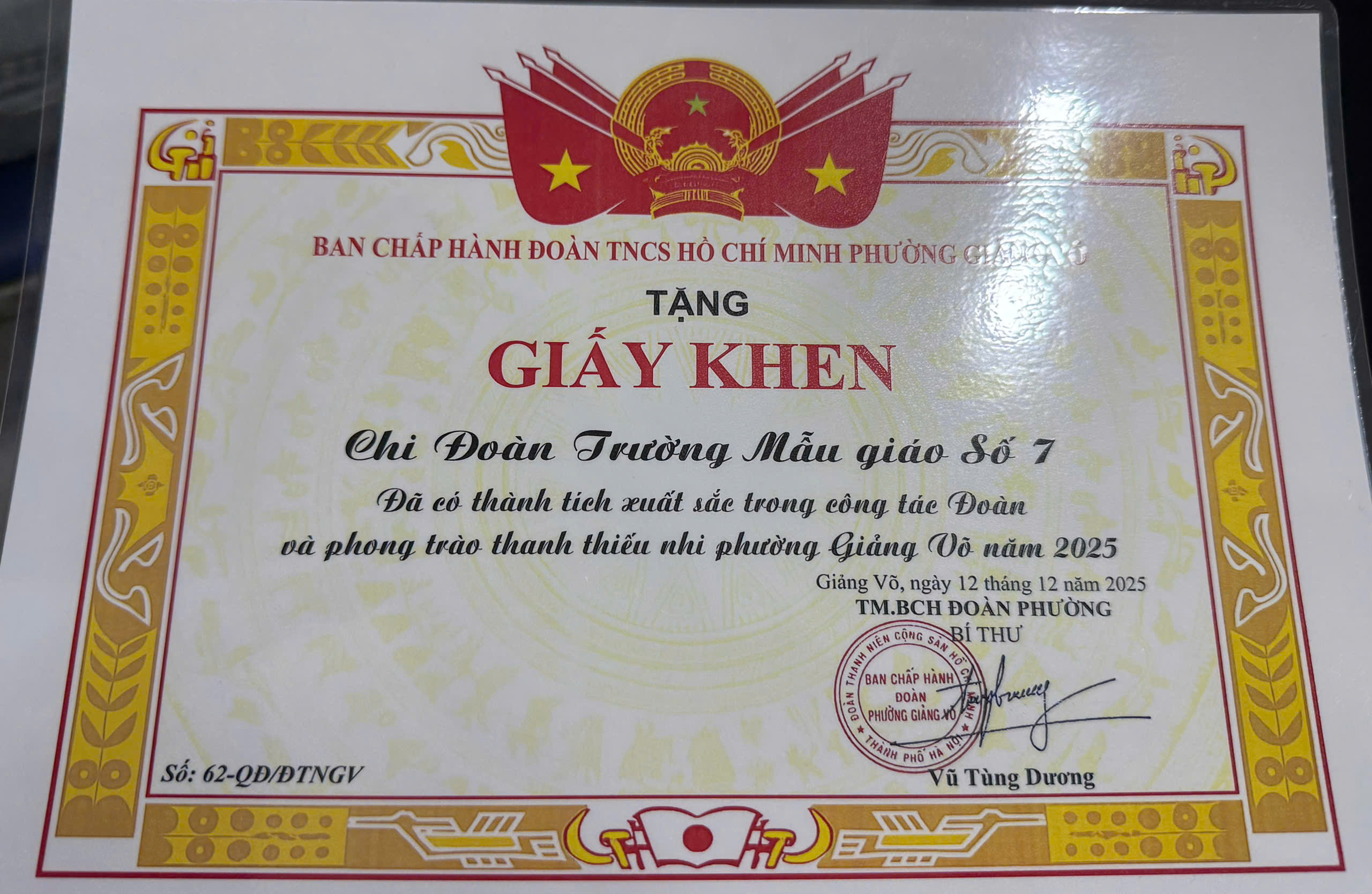 🎉 Vinh dự và tự hào, tại Hội nghị, Chi đoàn Trường Mẫu giáo số 7 đã được trao tặng Giấy khen vì đã có thành tích xuất sắc trong công tác Đoàn và phong trào thanh thiếu nhi phường Giảng Võ năm 2025. Đây là sự ghi nhận xứng đáng cho tinh thần trách nhiệm, sự đoàn kết, sáng tạo và những đóng góp tích cực của tập thể đoàn viên chi đoàn trong các phong trào, hoạt động tại địa phương.