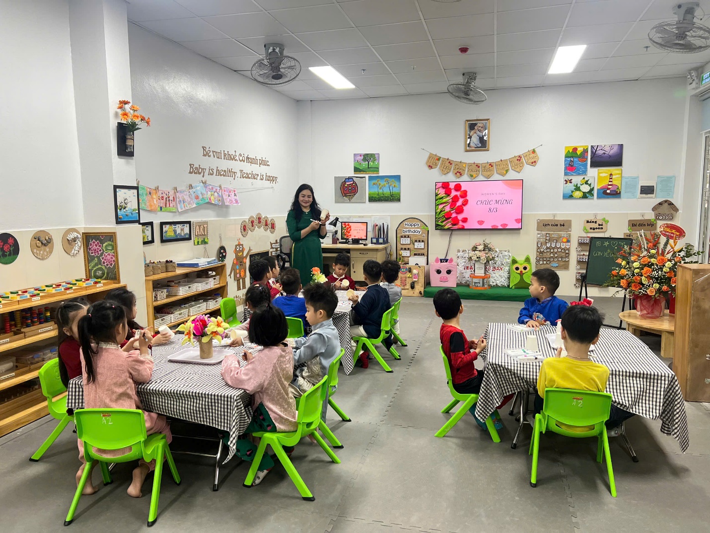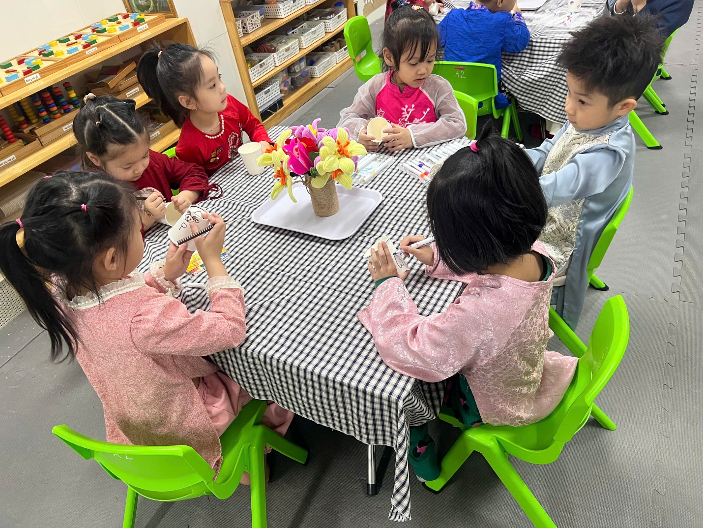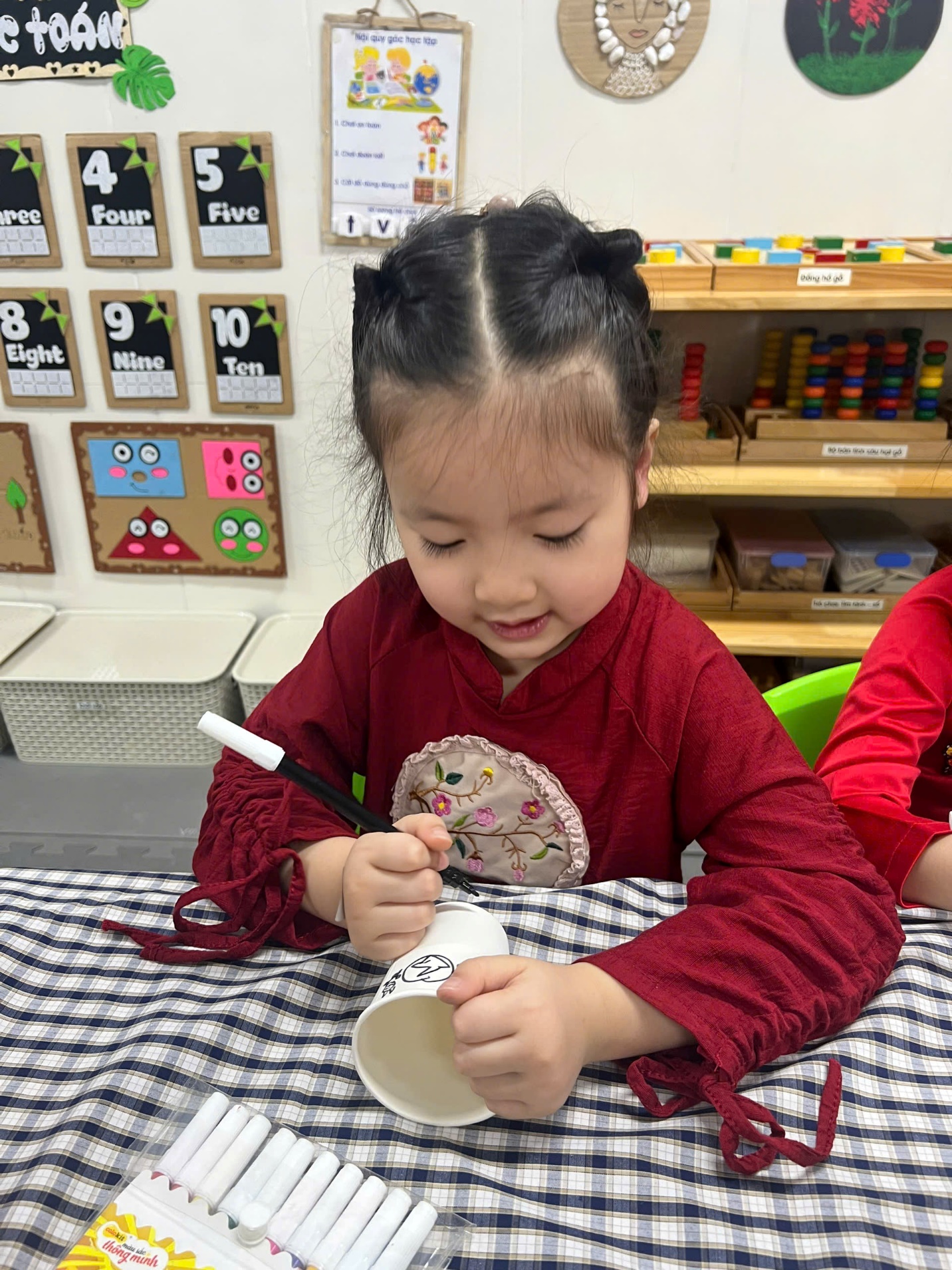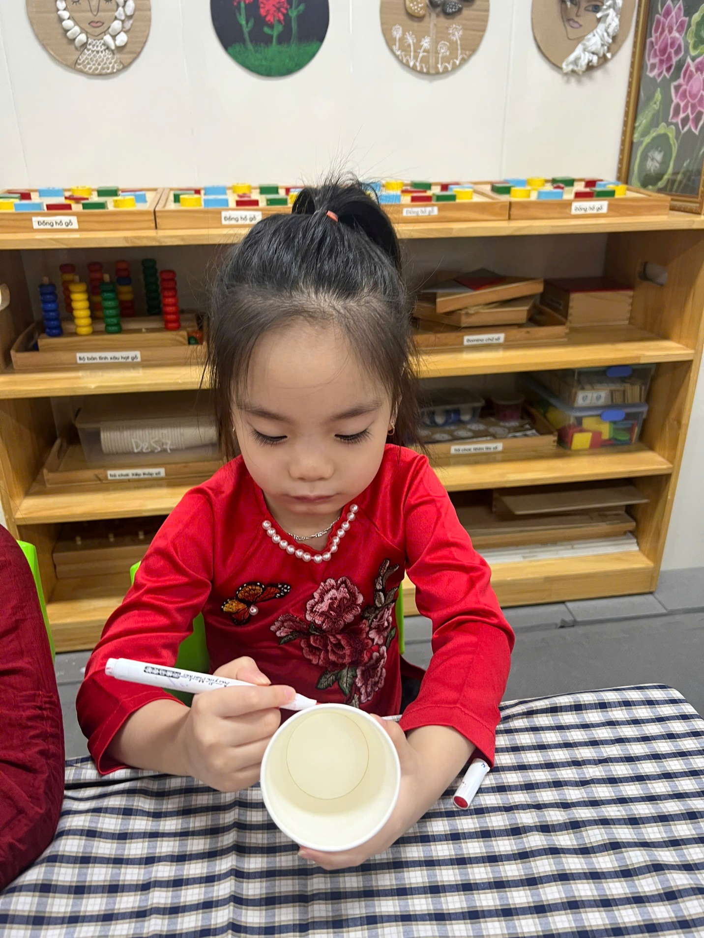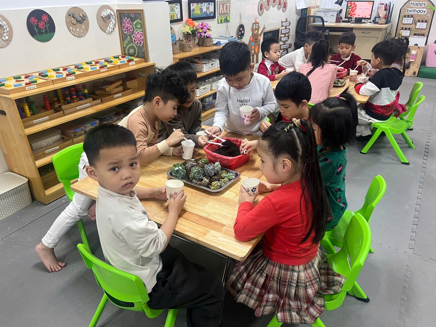 Mỗi bé được phát một chiếc cốc giấy trắng tinh. Với màu vẽ, bút dạ và những hình dán ngộ nghĩnh, các bé đã biến chiếc cốc đơn giản thành những tác phẩm nghệ thuật nhỏ xinh. Có bạn vẽ mặt cười, có bạn trang trí bằng hoa lá, có bạn lại sáng tạo với những đường nét đầy màu sắc. Những chiếc cốc trở thành “ngôi nhà” riêng biệt cho cây sen đá, mang dấu ấn cá nhân của từng bé.