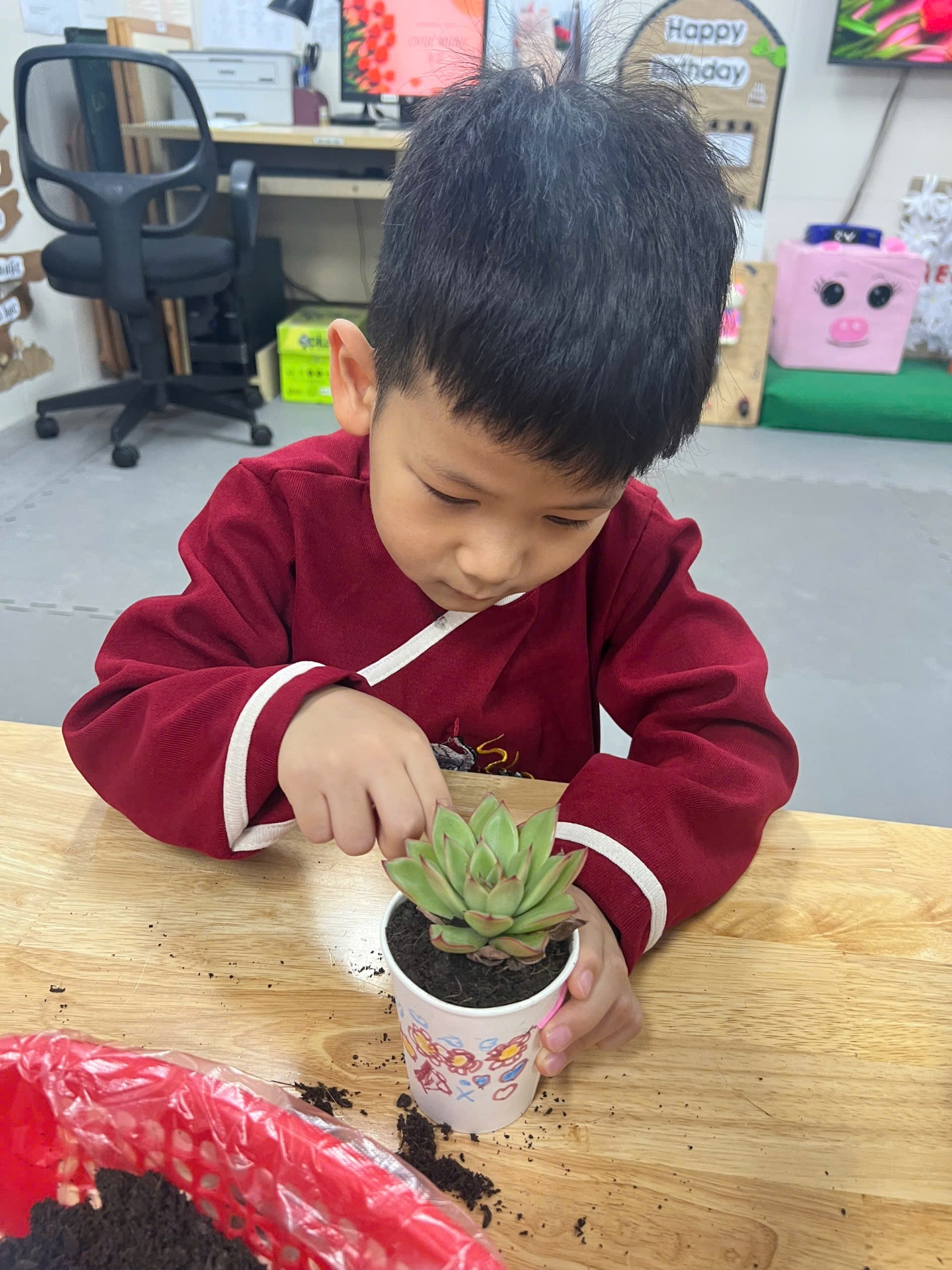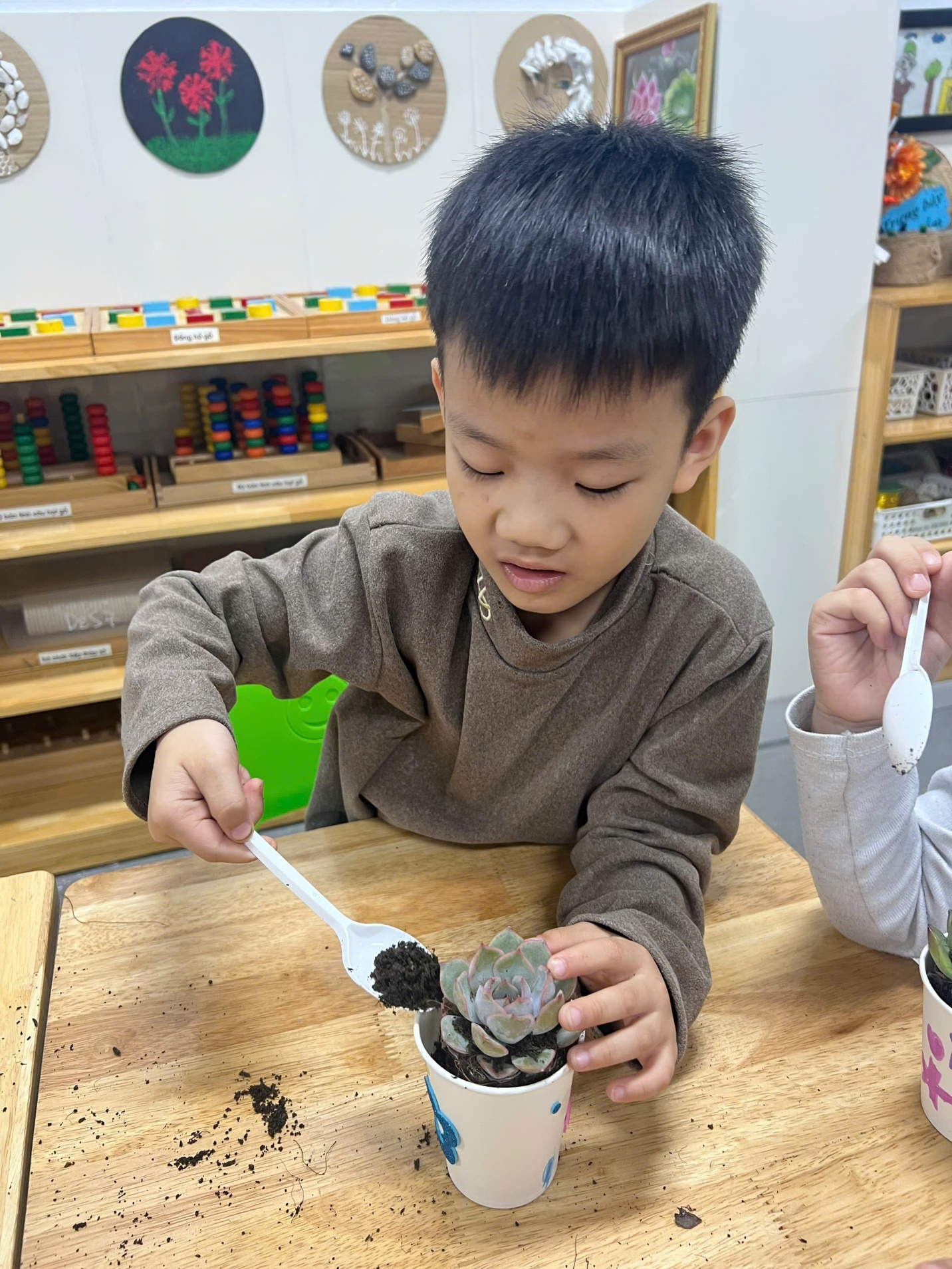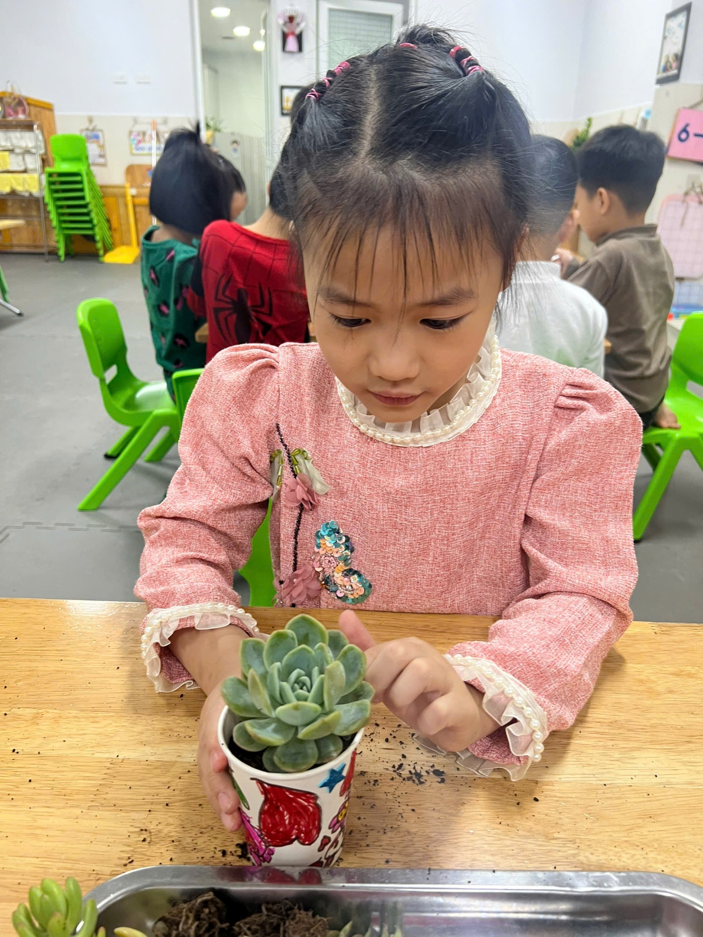 Sau khi trang trí xong, các bé được cô giáo hướng dẫn cách cho đất vào cốc, nhẹ nhàng đặt cây sen đá vào và vun đất xung quanh. Đôi bàn tay nhỏ bé nhưng đầy cẩn thận đã nâng niu từng nhánh cây. Các bé còn được học cách tưới nước vừa đủ, không quá nhiều để cây có thể phát triển tốt.