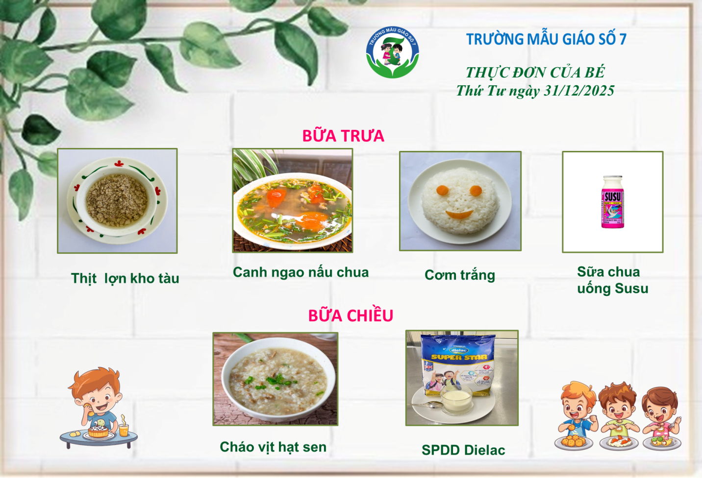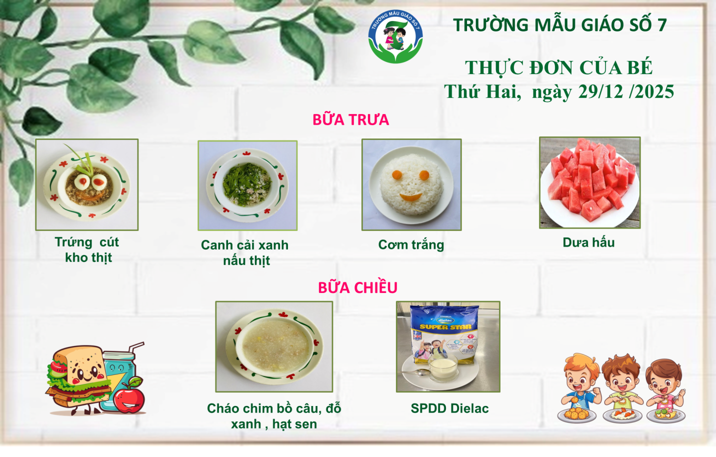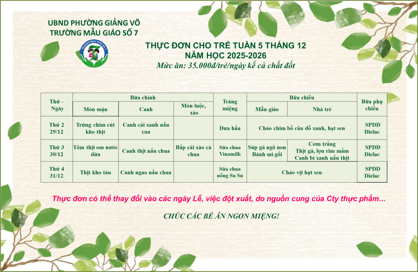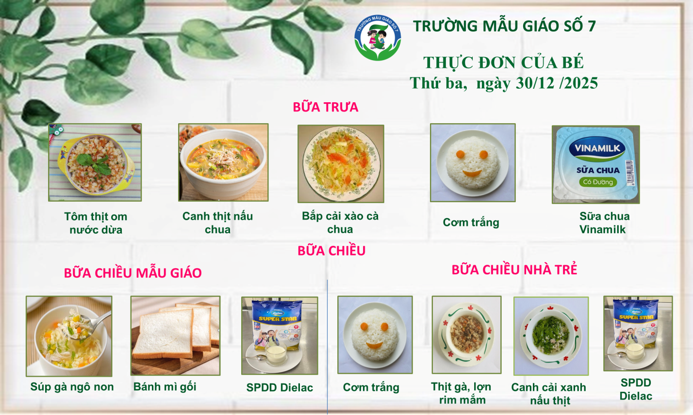 Trường Mẫu giáo Số 7 kính gửi đến Quý Phụ huynh thực đơn của bé tuần 5 tháng 12/2025 (từ ngày 29/12/2025 đến ngày 31/12/2025)