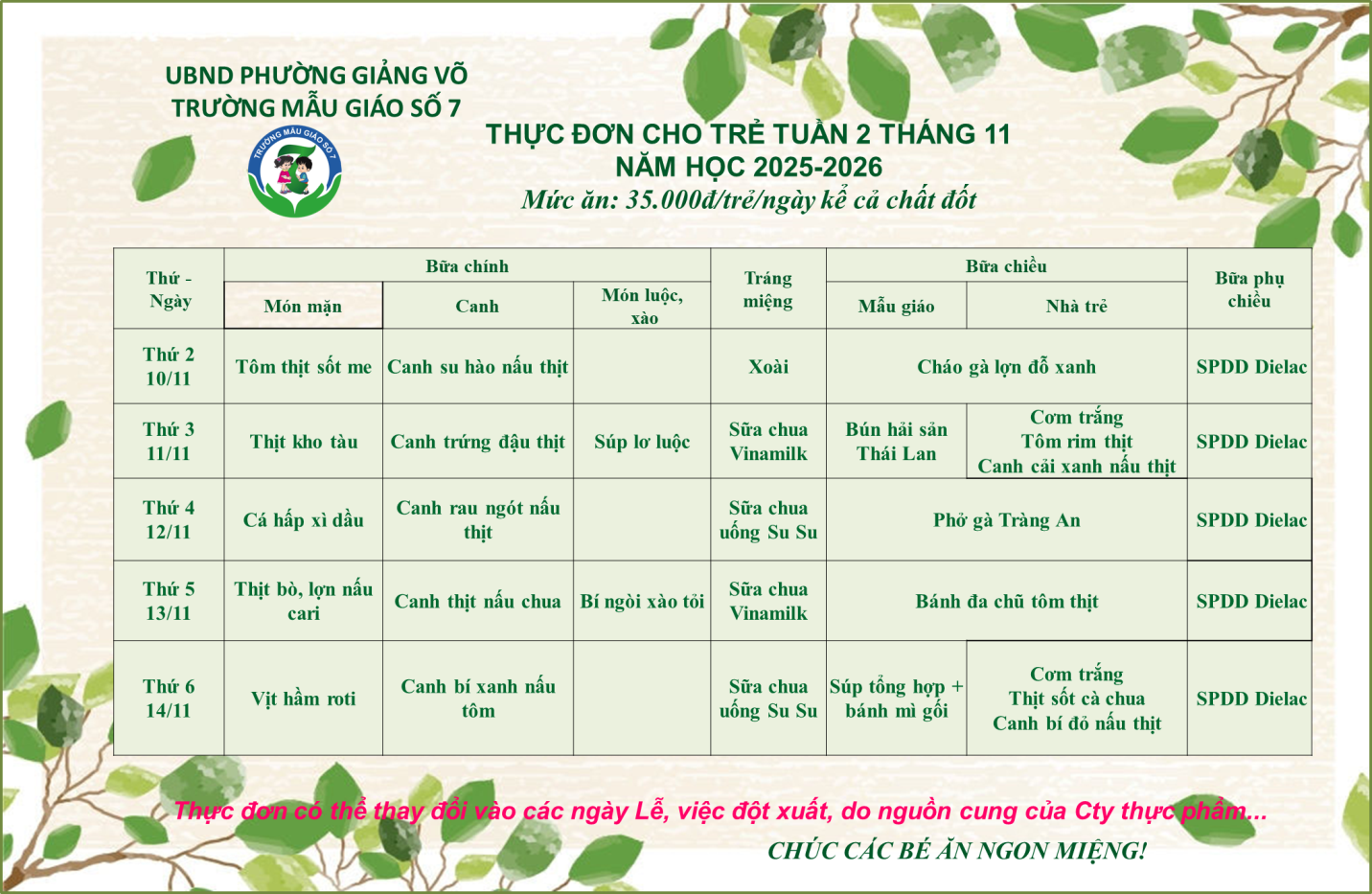 Dưới đây là thực đơn của bé tuần 2 tháng 11/2025: