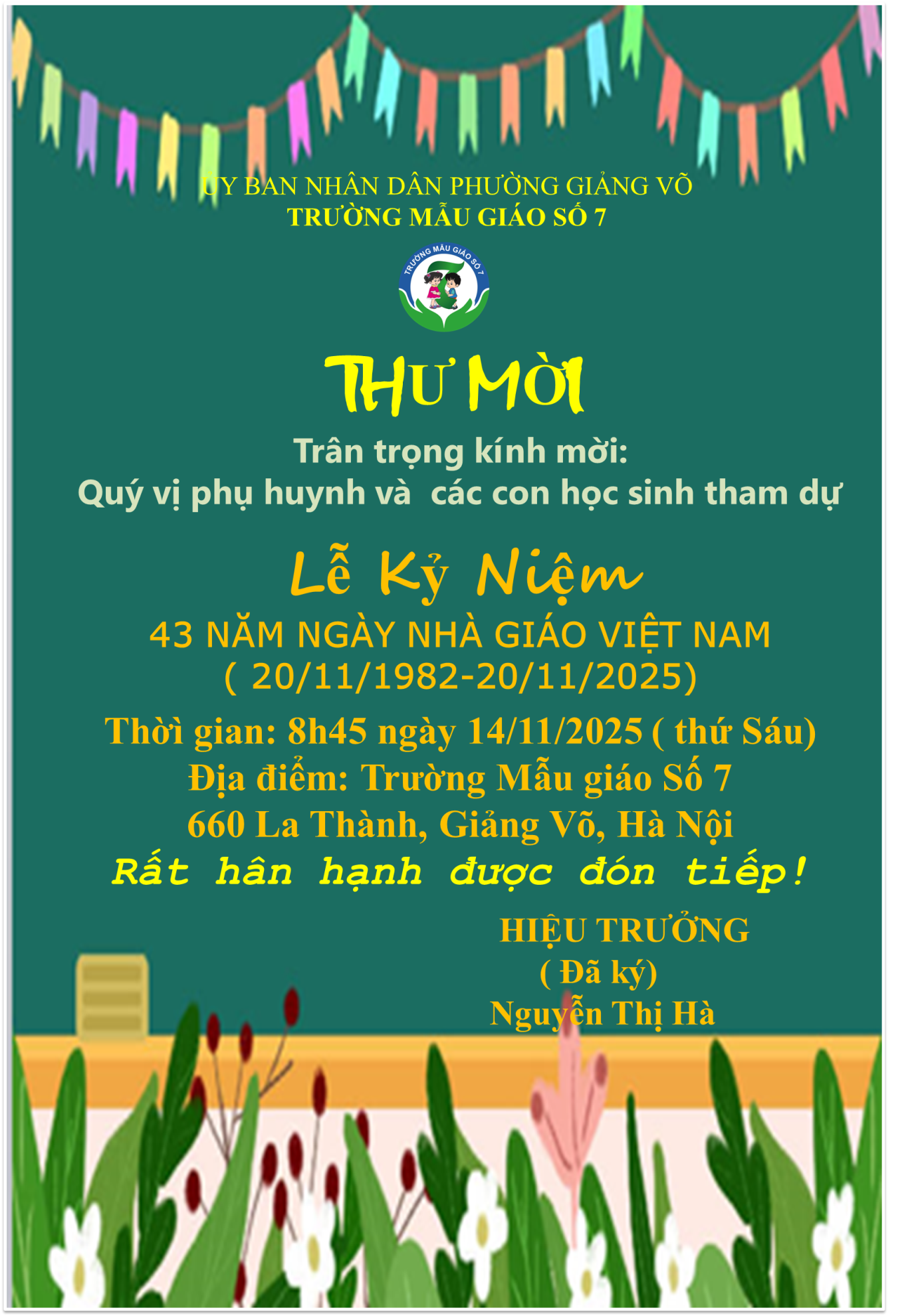 Trường Mẫu giáo Số 7 kính mời Quý Phụ huỵnh và các con học sinh đến dự Lễ kỷ niệm 43 năm ngày Nhà Giáo Việt Nam 20/11/2025