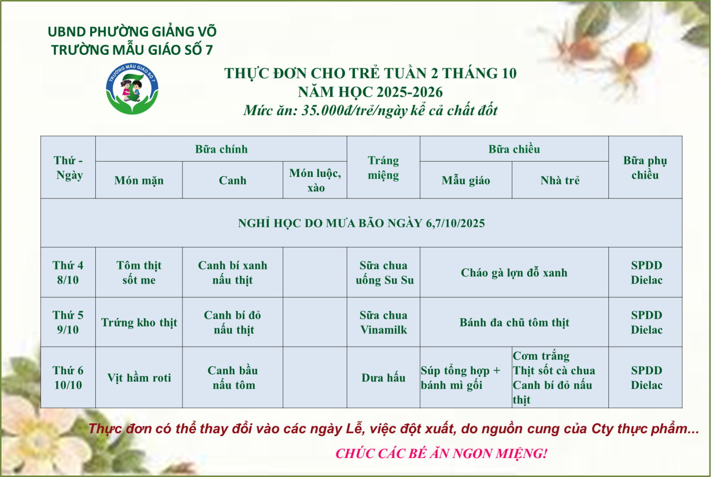 Trường Mẫu giáo Số 7 kính gửi đến Quý Phụ huynh thực đơn của bé tuần 2 tháng 10/2025 (từ ngày 8/10/2025 đến ngày 10/10/2025)
