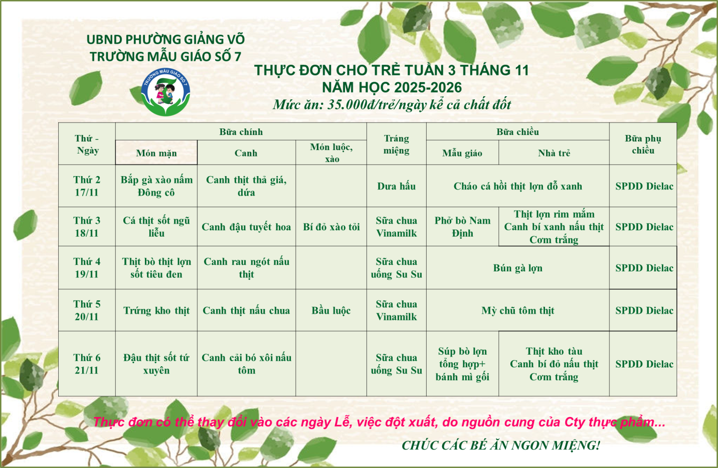 Dưới đây là thực đơn của bé tuần 3 tháng 11/2025