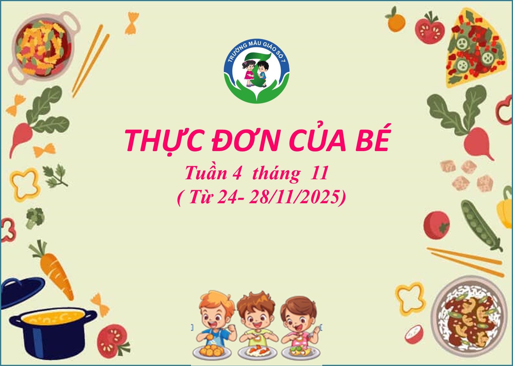 Trường Mẫu giáo Số 7 kính gửi đến Quý Phụ huynh thực đơn của bé tuần 4 tháng 11/2025 (từ ngày 24/11/2025 đến ngày 28/11/2025)