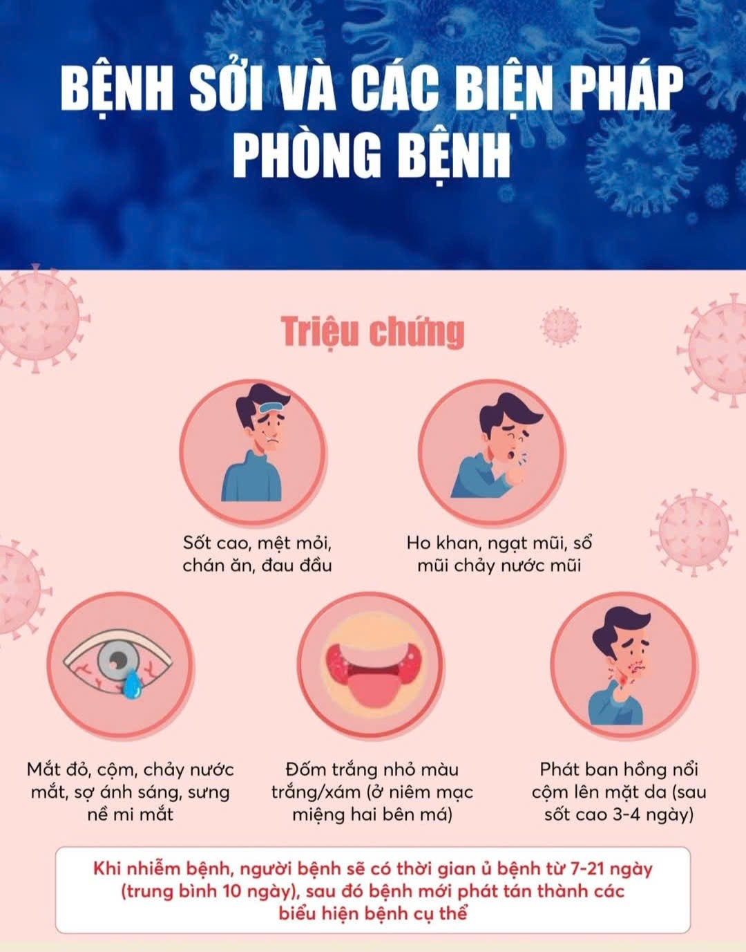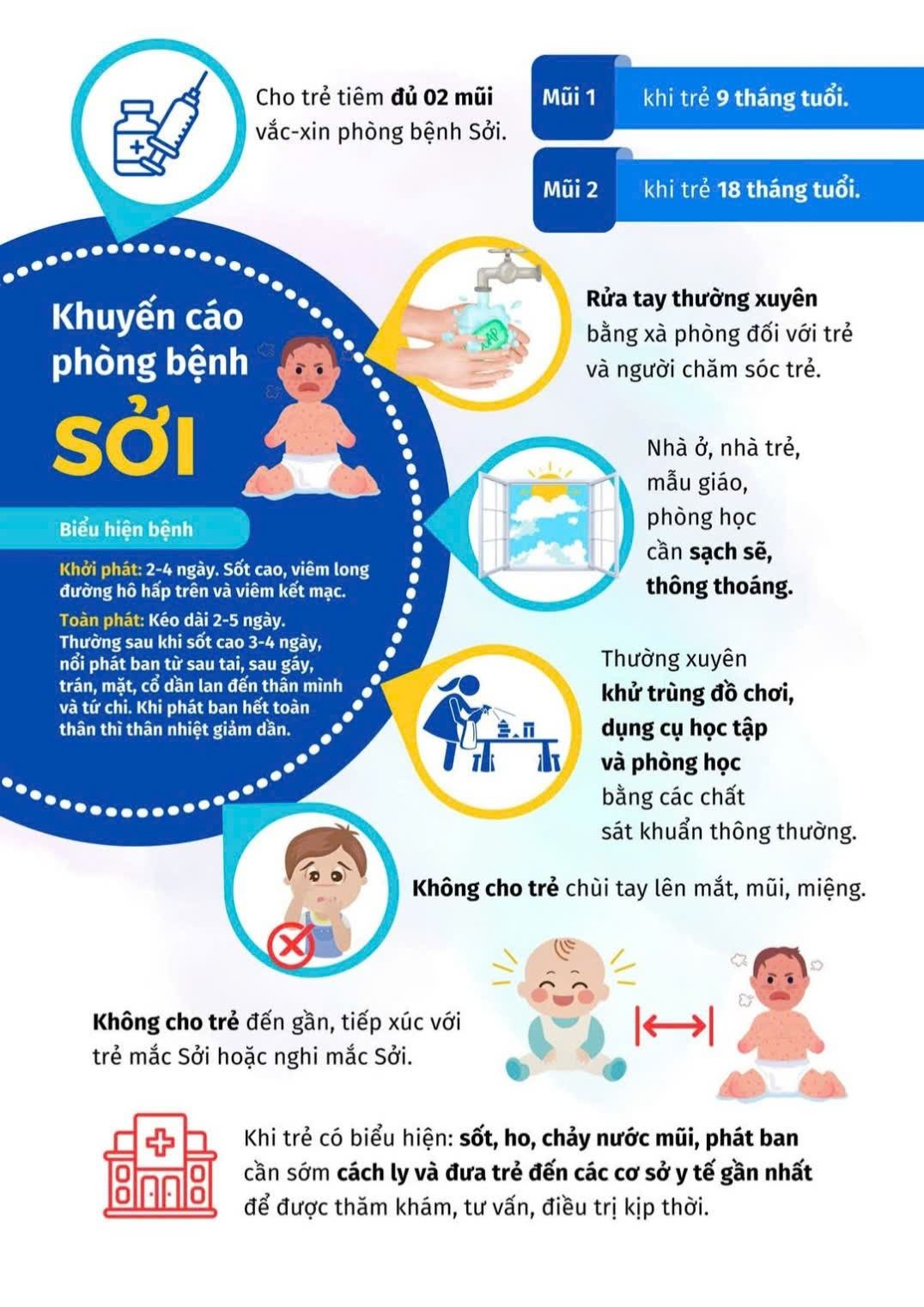 Tiêm phòng đầy đủ: Đây là biện pháp quan trọng nhất để phòng ngừa bệnh sởi. Hãy đảm bảo rằng tất cả chúng ta đều đã được tiêm phòng sởi đầy đủ và đúng lịch. Giữ vệ sinh cá nhân: Rửa tay thường xuyên bằng xà phòng và nước sạch, đặc biệt là trước khi ăn và sau khi đi vệ sinh. Che miệng và mũi khi ho hoặc hắt hơi. Tránh dùng chung đồ dùng cá nhân với người khác.Thường xuyên lau chùi các bề mặt tiếp xúc chung như bàn ghế, tay nắm cửa. Tránh tiếp xúc với người bệnh: Nếu bạn hoặc người thân có dấu hiệu sốt, phát ban, ho, sổ mũi, hãy đến ngay cơ sở y tế để được khám và điều trị kịp thời. Tránh tiếp xúc với người bệnh sởi để hạn chế lây lan. Tăng cường sức đề kháng: Ăn uống đầy đủ chất dinh dưỡng, đặc biệt là các loại rau xanh và trái cây tươi. Tập thể dục thường xuyên để nâng cao sức khỏe. Uống đủ nước mỗi ngày. Những dấu hiệu nhận biết bệnh sởi: Sốt cao, phát ban đỏ, ho, sổ mũi Viêm kết mạc (mắt đỏ)