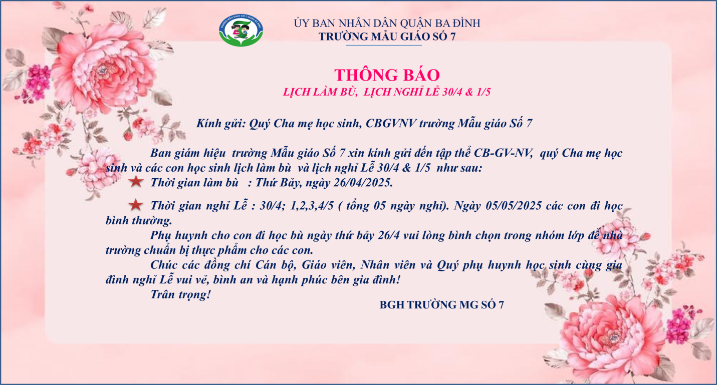 Ban giám hiệu trường Mẫu giáo Số 7 xin kính gửi đến tập thể CB-GV-NV, quý Cha mẹ học sinh và các con học sinh lịch làm bù và lịch nghỉ Lễ 30/4 & 1/5