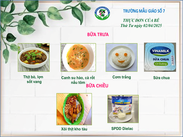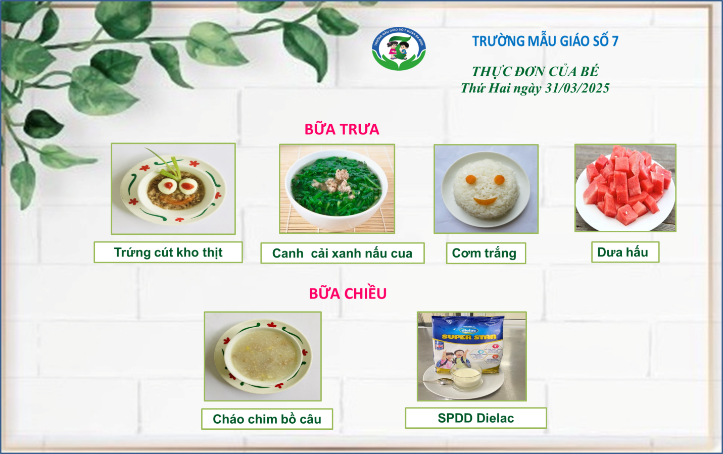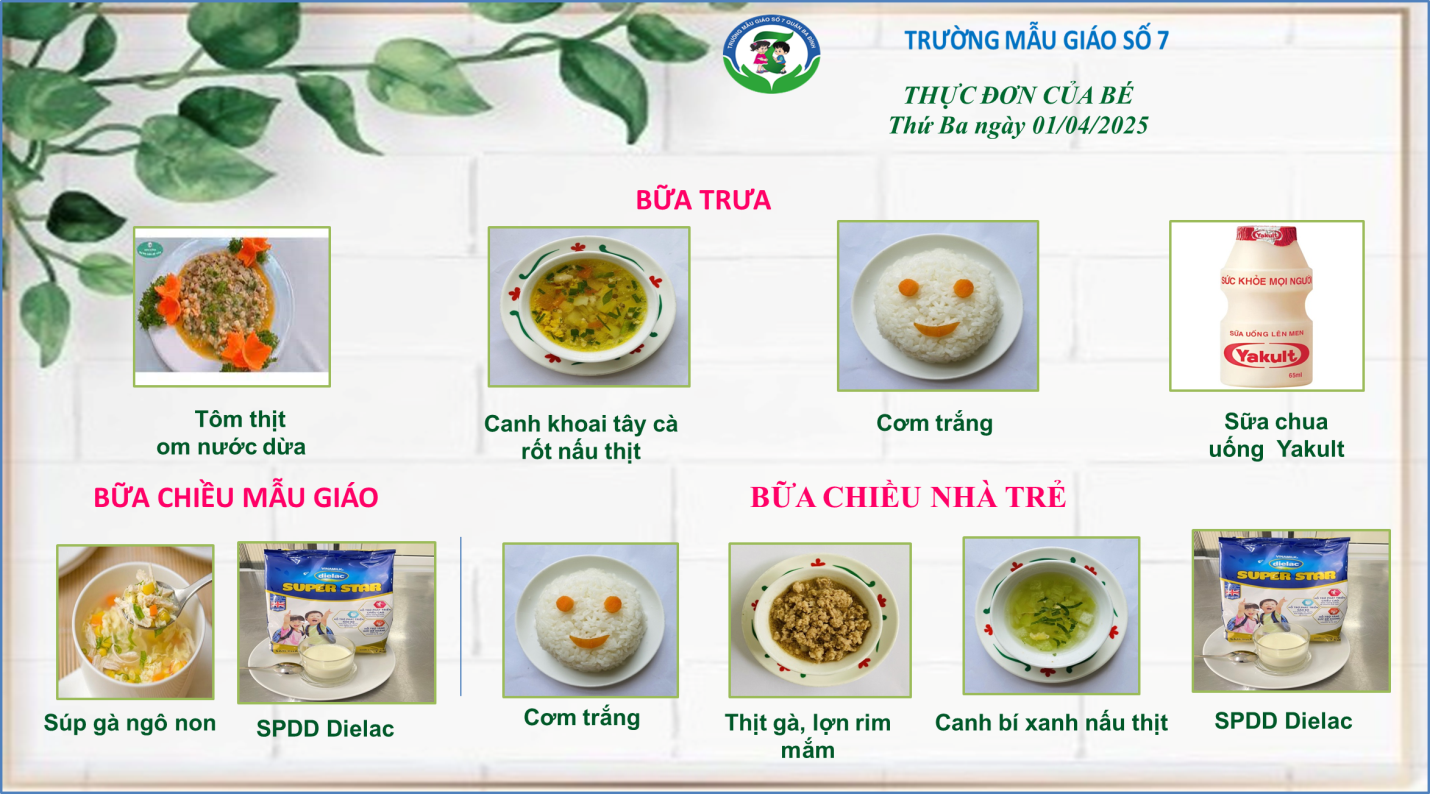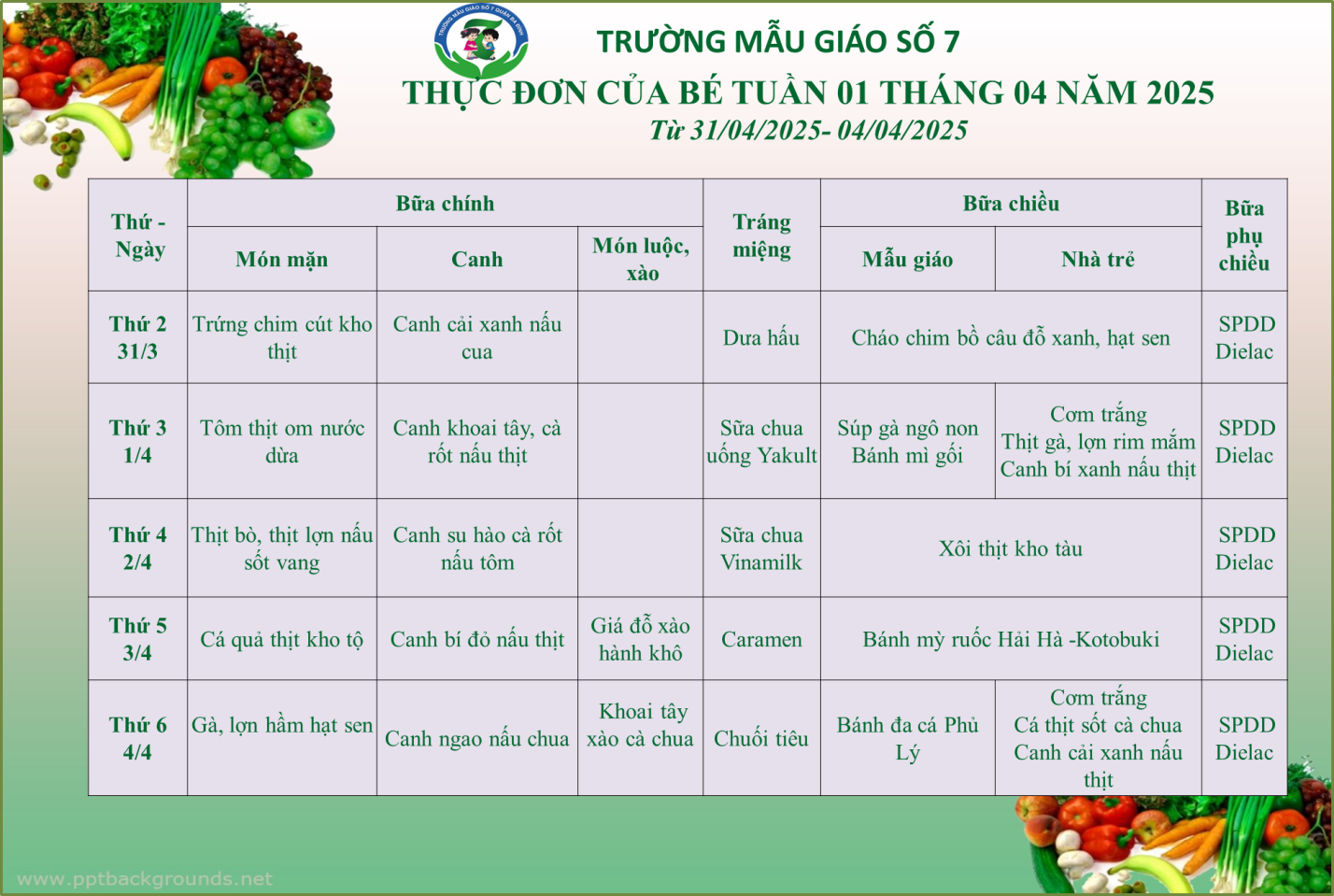 Dưới đây là thực đơn của bé tuần 1 tháng 04/2025: