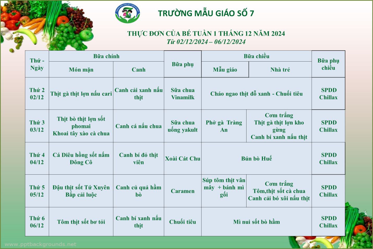 Dưới đây là thực đơn của bé tuần 1 tháng 12/2024: