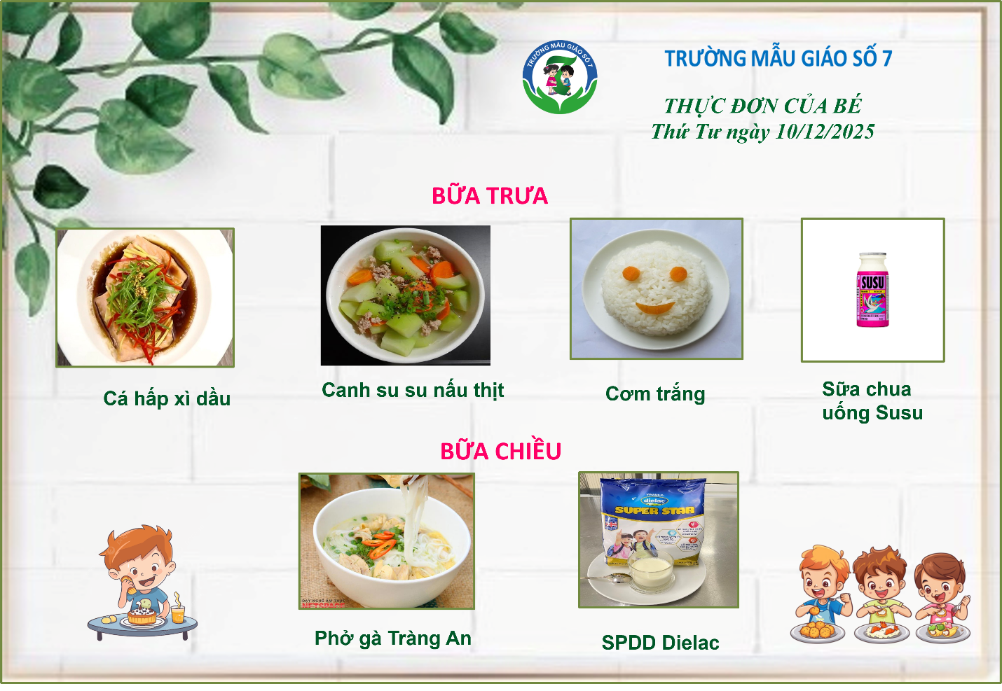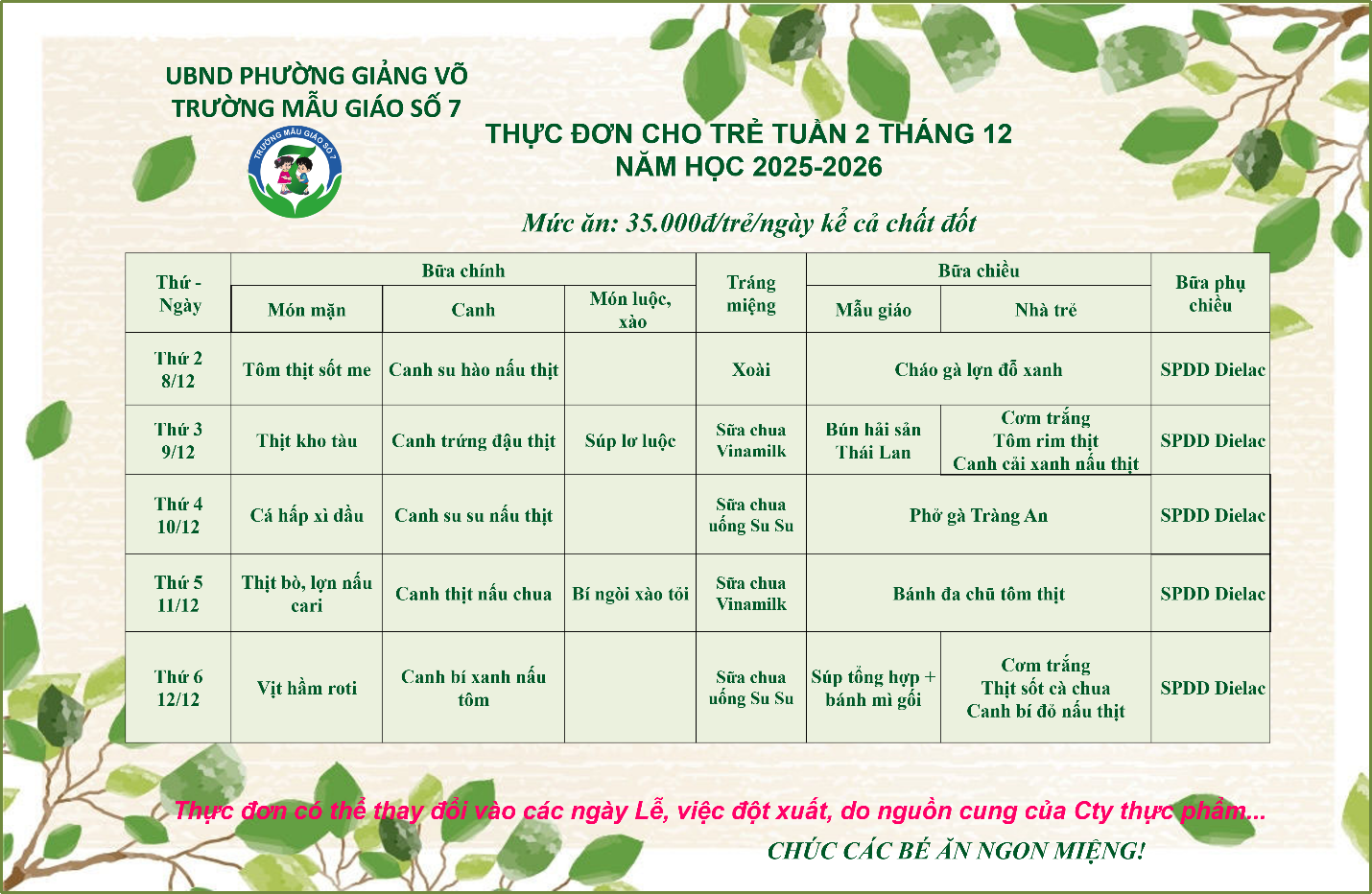 Thực đơn của các bé có thể được điều chỉnh tùy thuộc vào nguồn cung ứng thực phẩm.