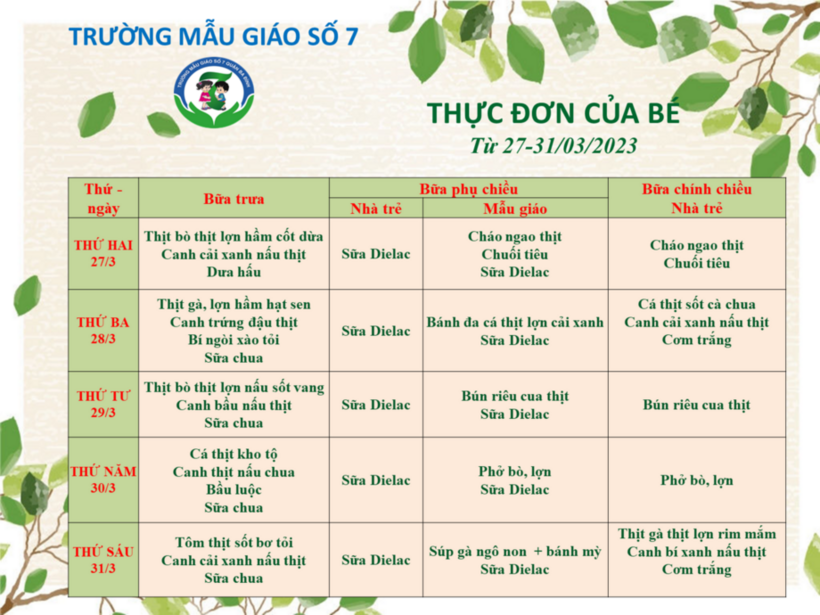 Dưới đây là thực đơn của bé tuần 5 tháng 3/2023: