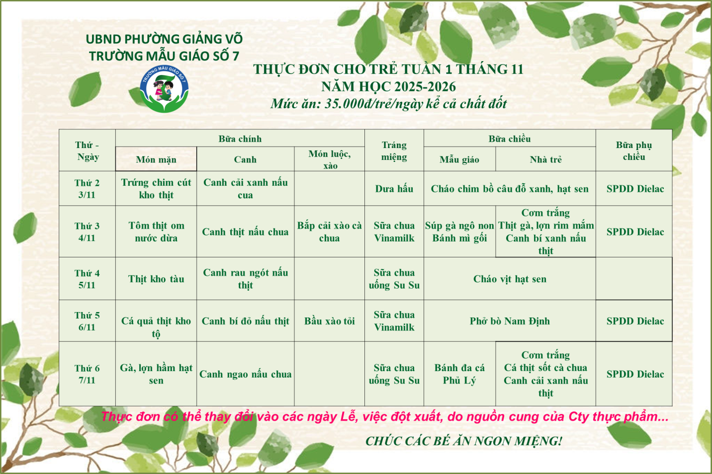 Thực đơn của các bé có thể được điều chỉnh tùy thuộc vào nguồn cung ứng thực phẩm.