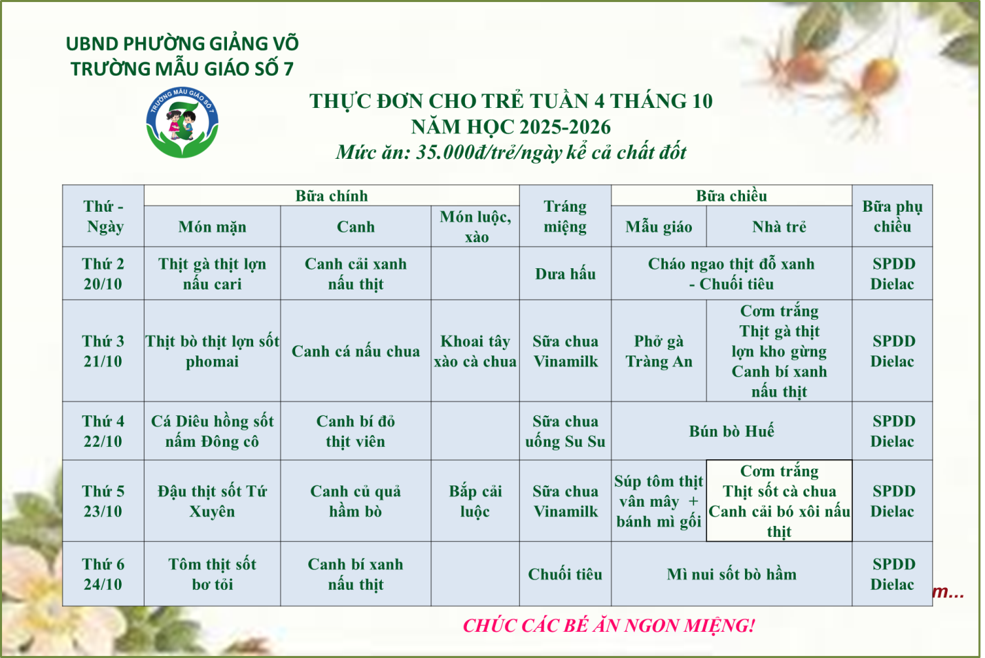Dưới đây là thực đơn của bé tuần 4 tháng 10/2025: