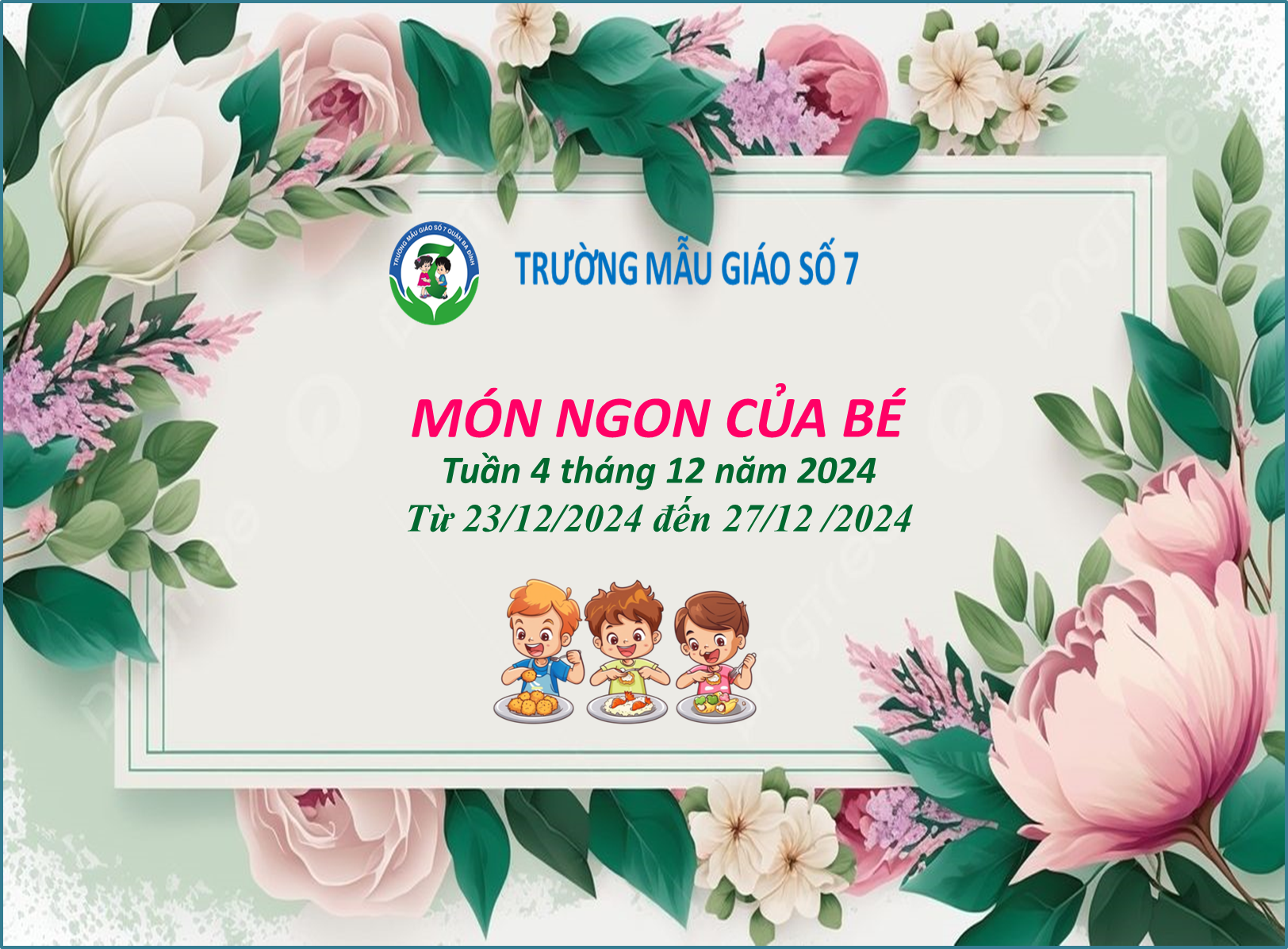 Trường Mẫu giáo Số 7 kính gửi đến quý phụ huynh thực đơn của bé tuần 4 tháng 12/2024 (từ ngày 23/12/2024 đến ngày 27/12/2024)