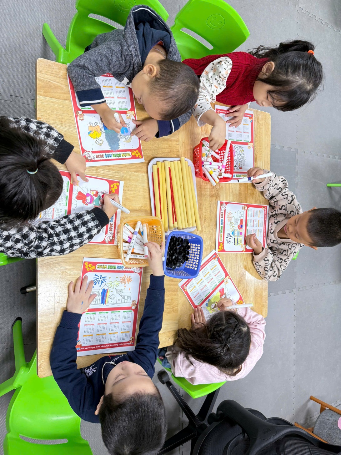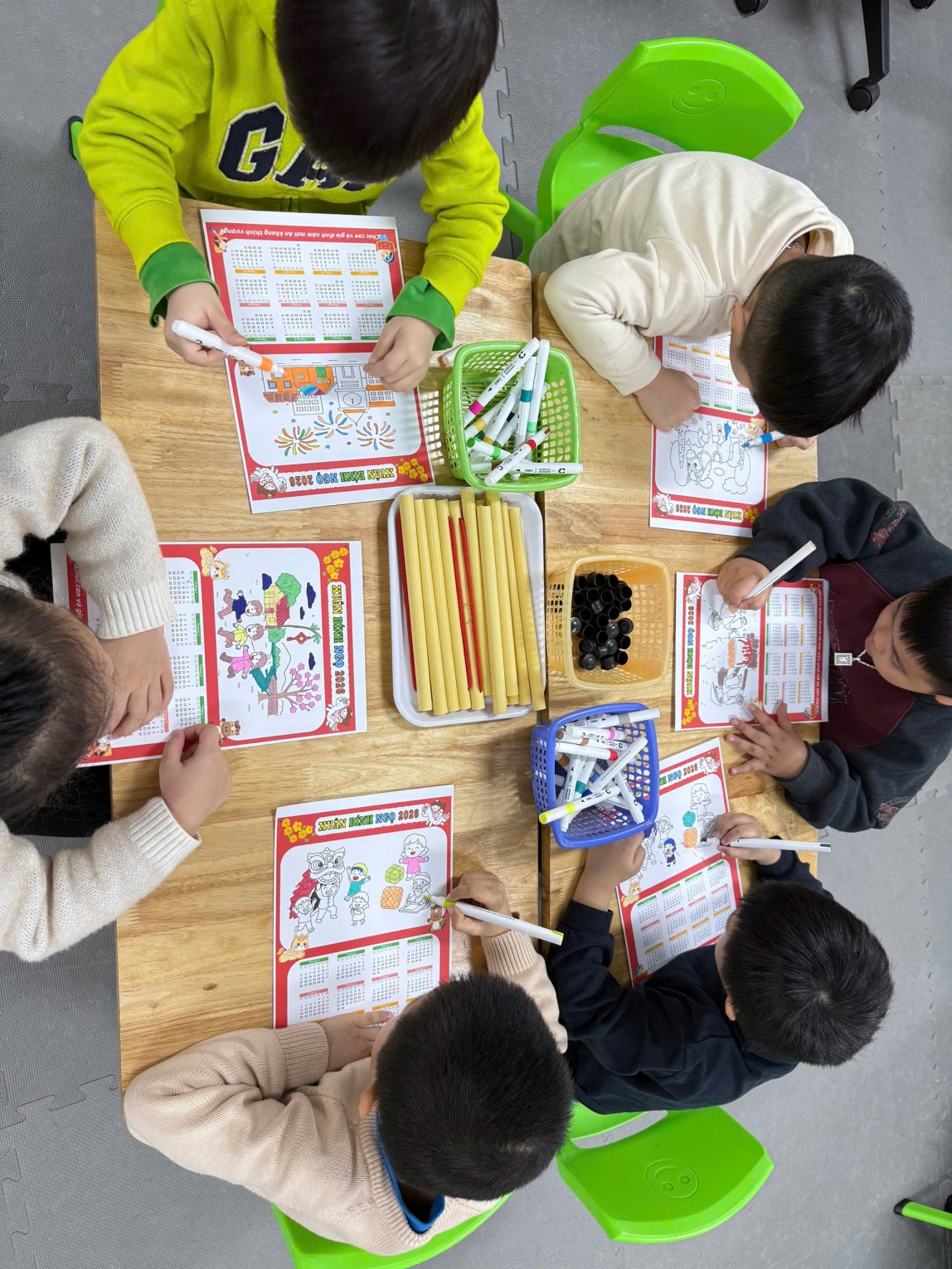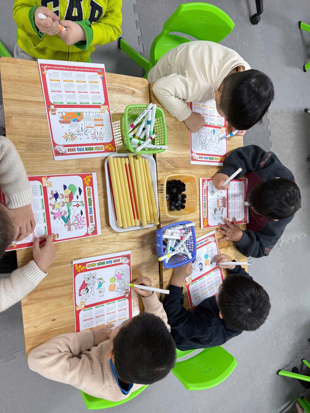Dưới sự hướng dẫn của giáo viên, các bé đã tự tay tô màu, trang trí lịch bằng hình ảnh minh họa, họa tiết mùa xuân. Mỗi tờ lịch mang một nét riêng, thể hiện sự sáng tạo và cảm xúc vui tươi của trẻ khi chào đón năm mới.