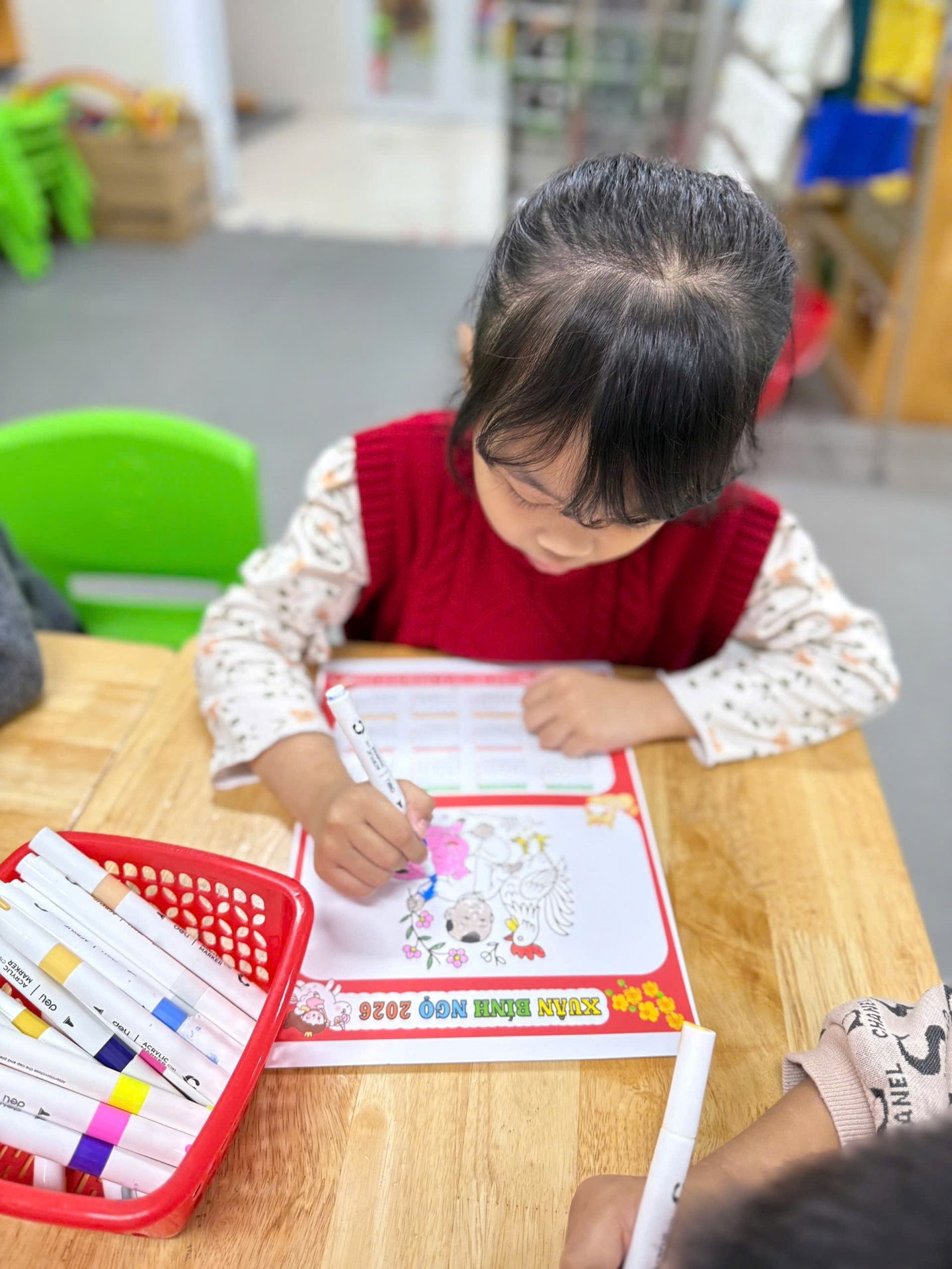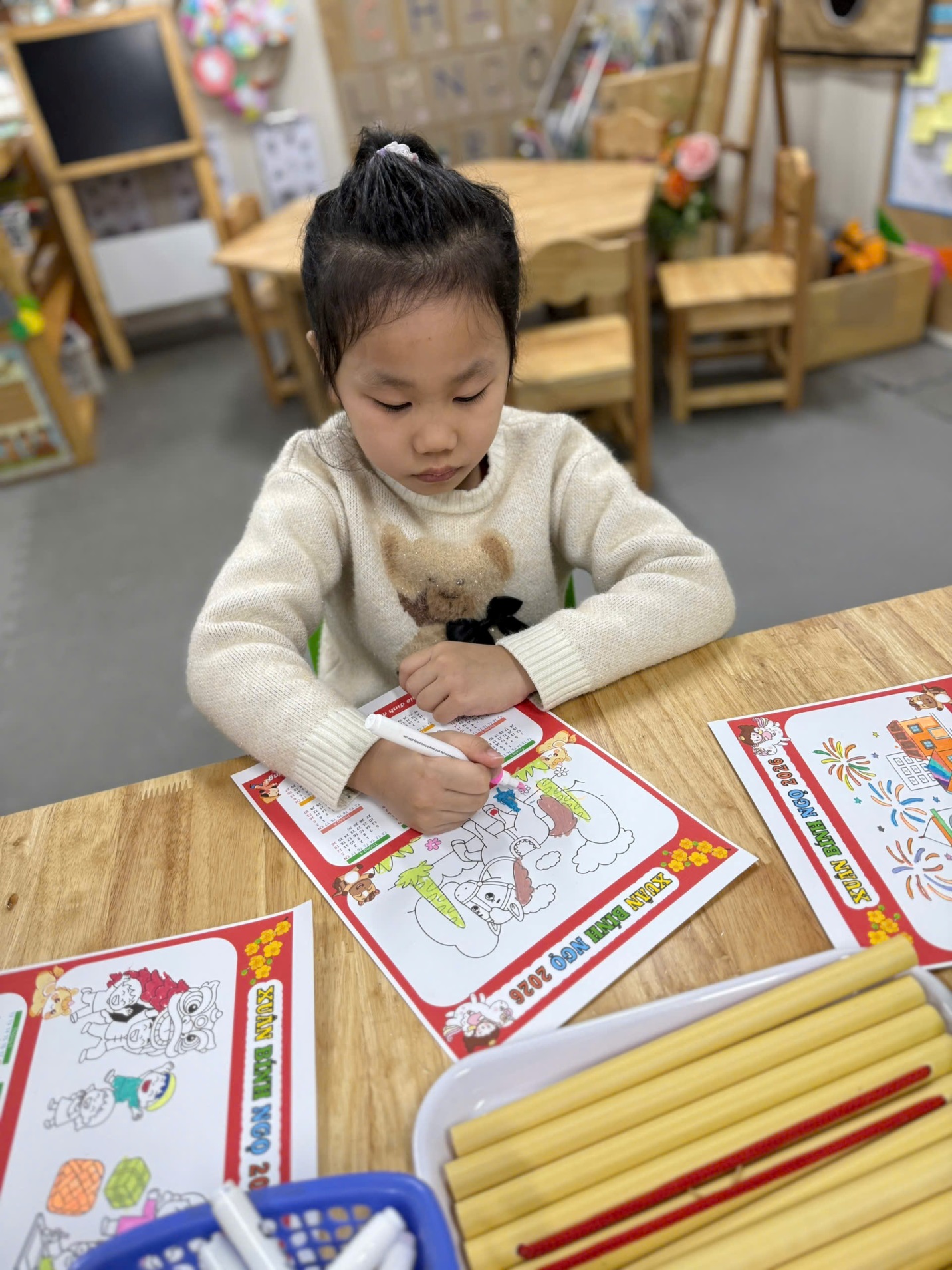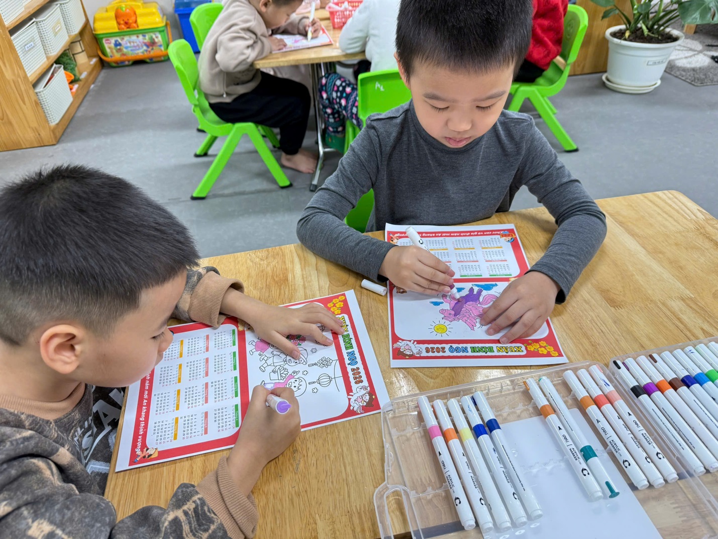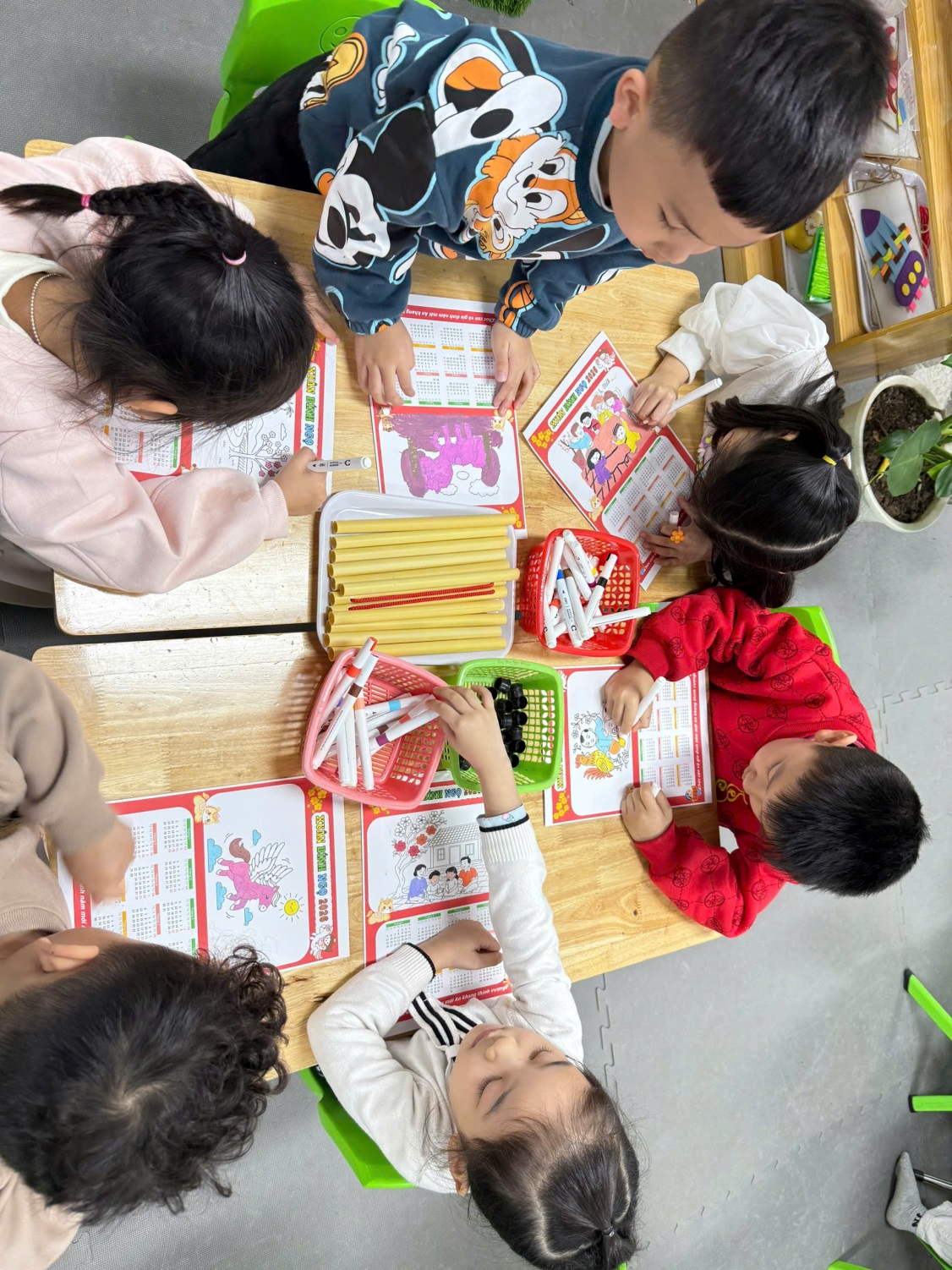 Dưới sự hướng dẫn của giáo viên, các bé đã tự tay tô màu, trang trí lịch bằng hình ảnh minh họa, họa tiết mùa xuân. Mỗi tờ lịch mang một nét riêng, thể hiện sự sáng tạo và cảm xúc vui tươi của trẻ khi chào đón năm mới.