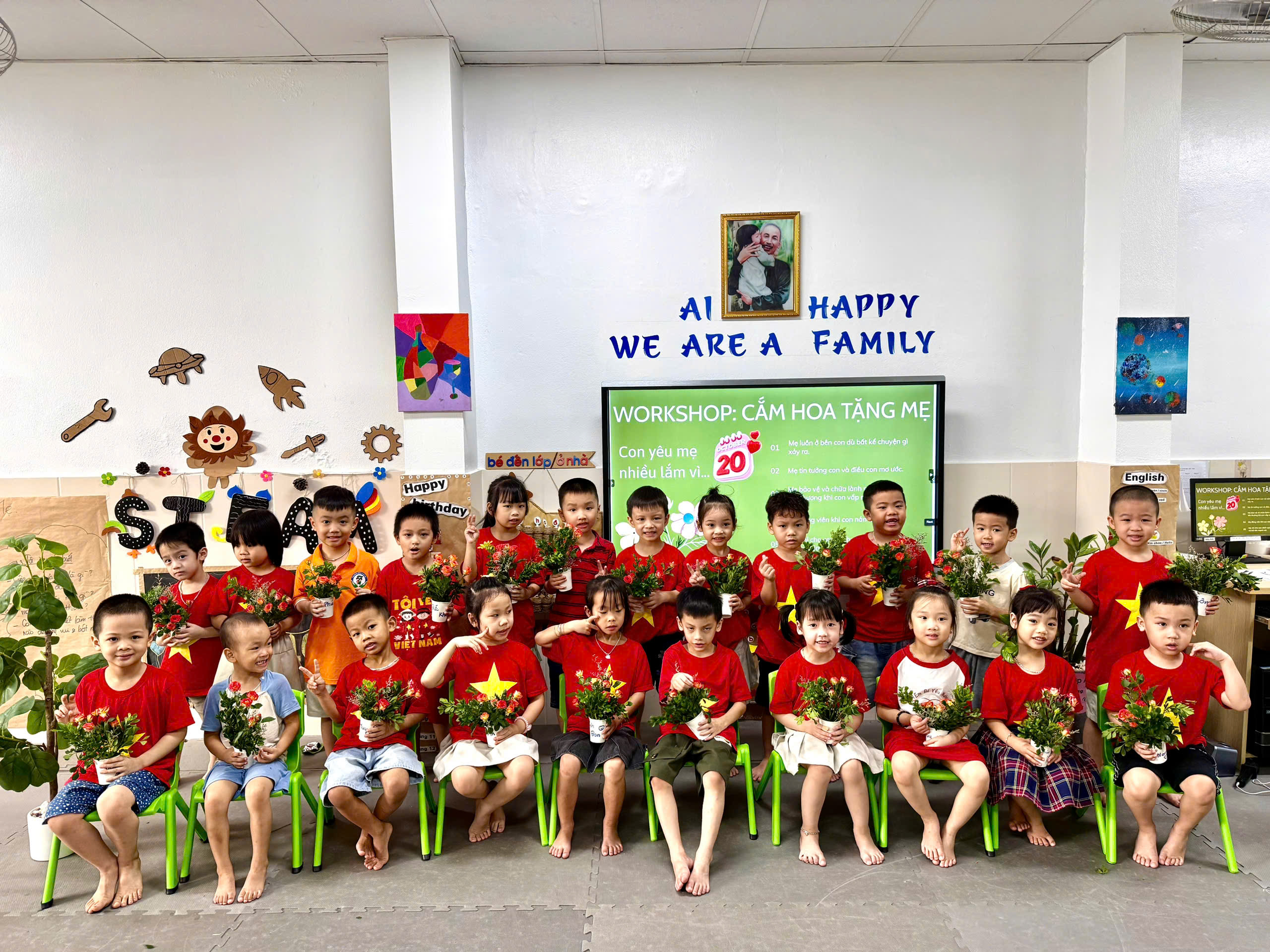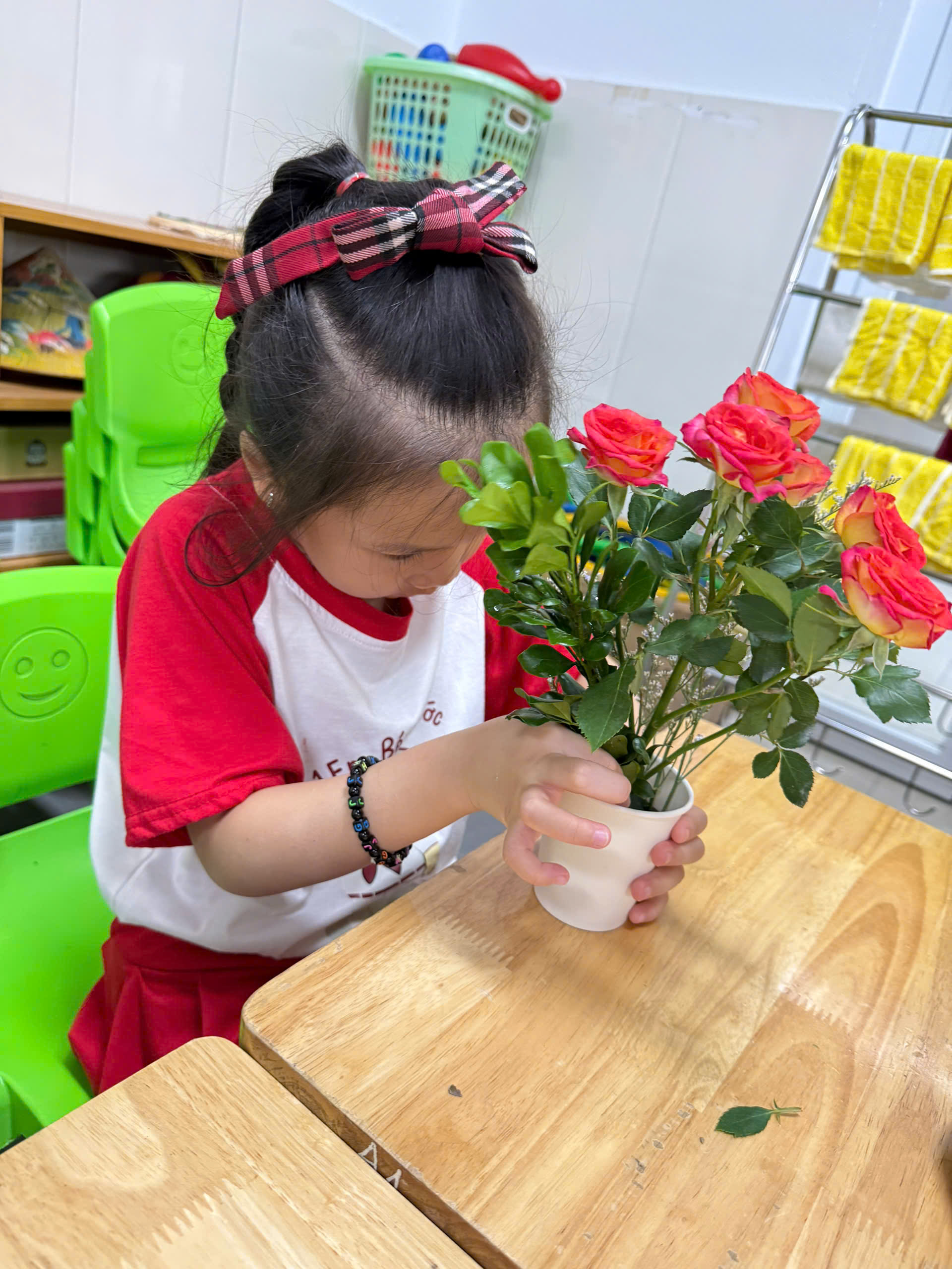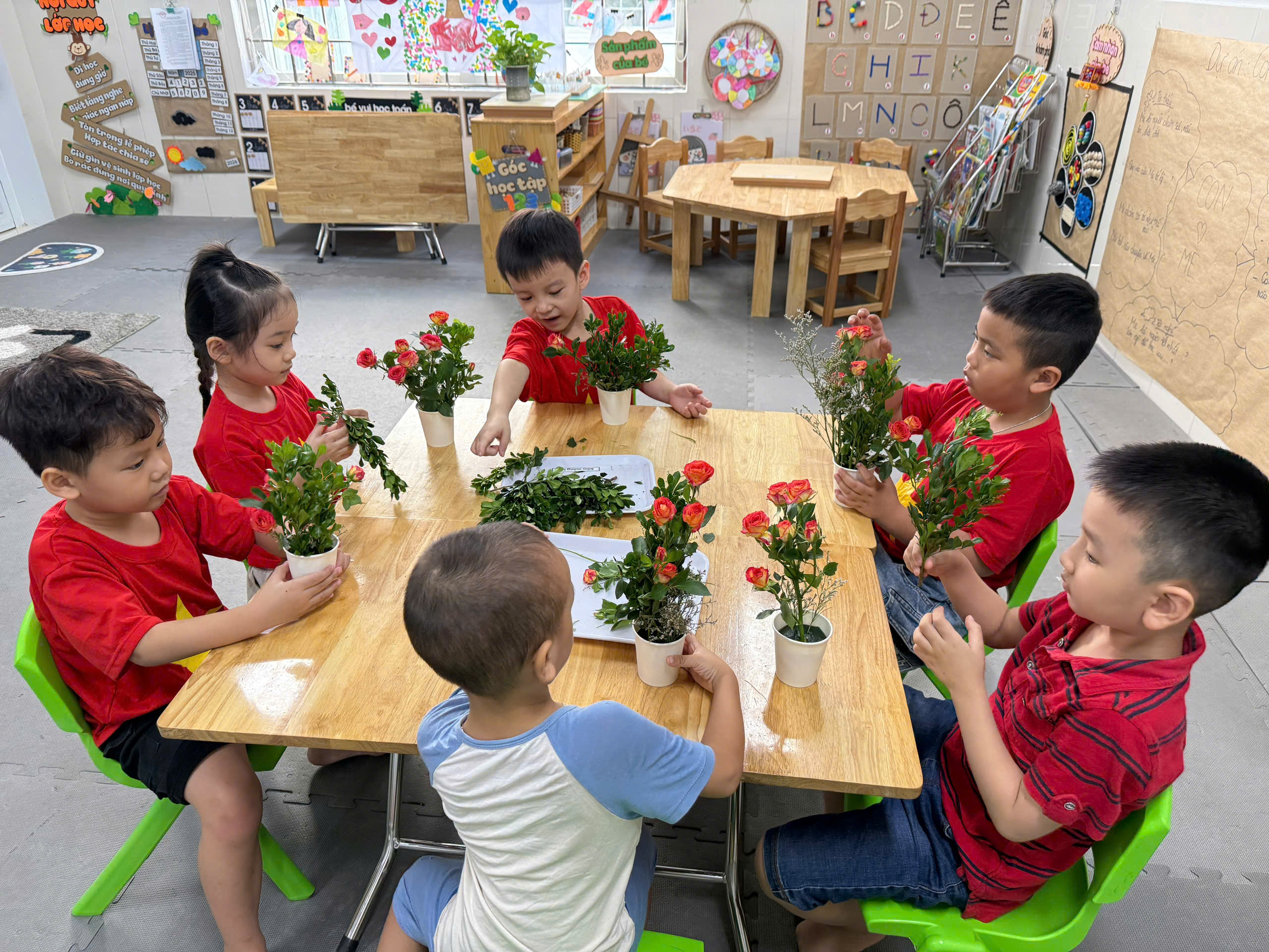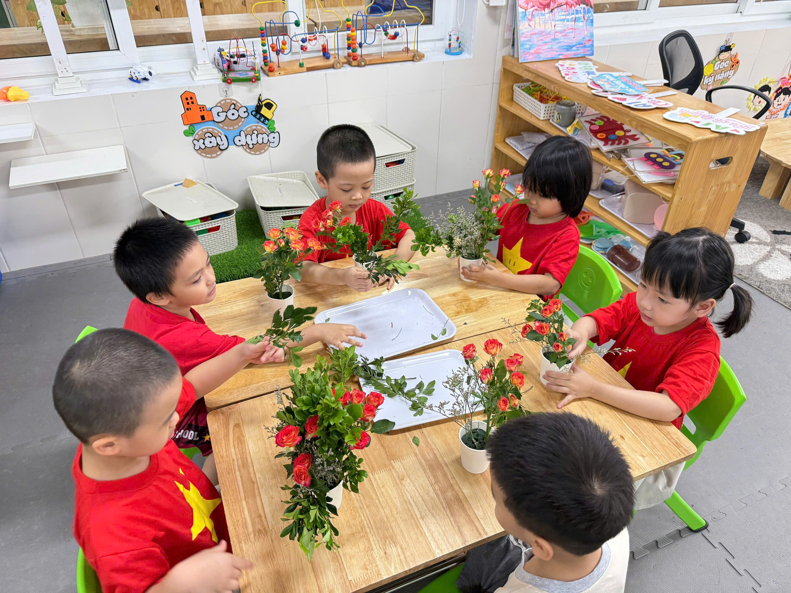 Dưới sự hướng dẫn của cô giáo, các bạn nhỏ được tự tay chọn hoa, cắm hoa và theo sở thích. Mỗi cốc hoa là một món quà chứa đựng tình yêu trong sáng mà các bé dành tặng mẹ – người luôn dịu dàng chăm sóc từng bữa ăn, giấc ngủ.