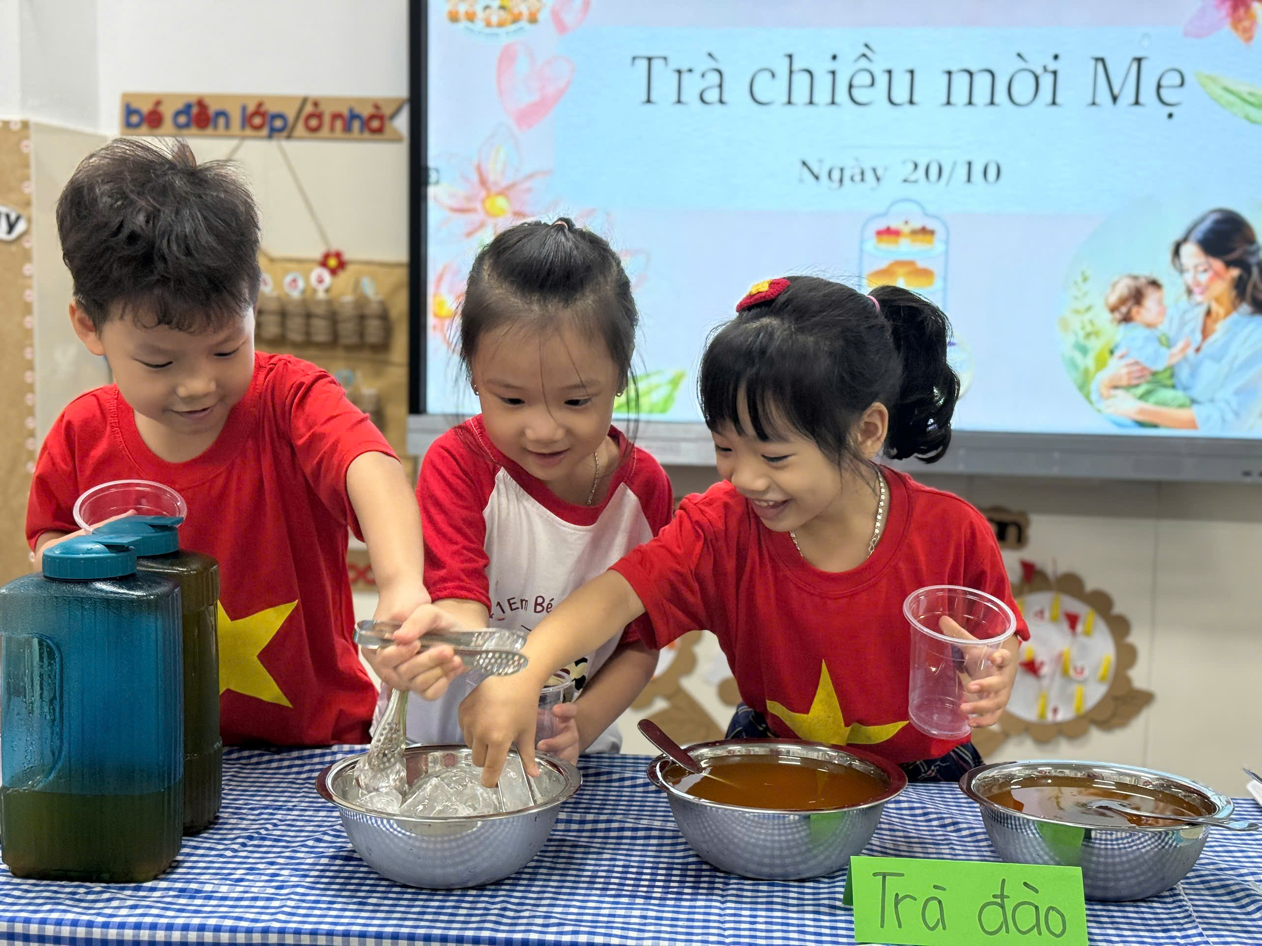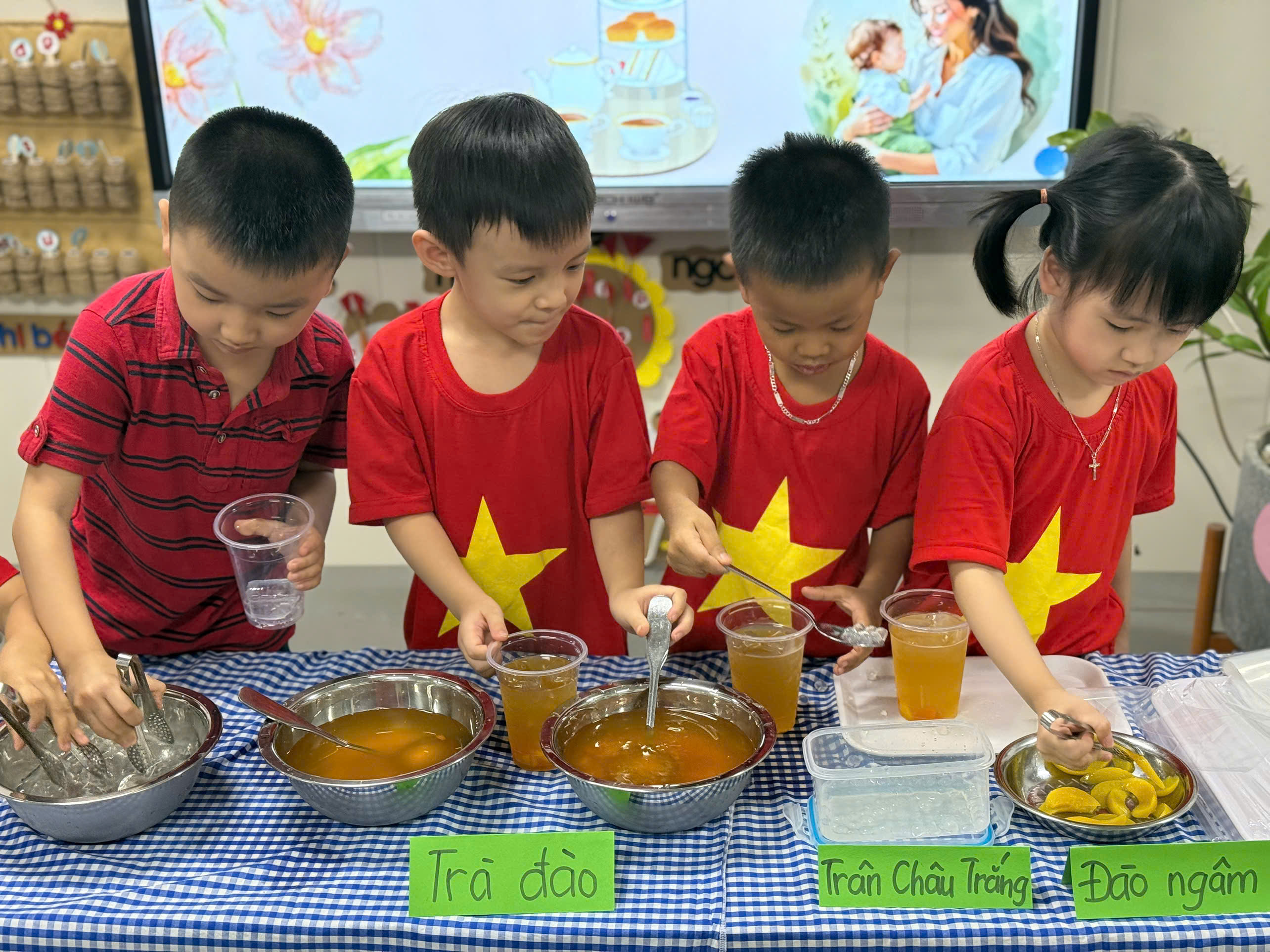 Không chỉ khéo tay, các bé A1 còn được trải nghiệm pha chế “Trà đào nhiệt đới” – món đồ uống mát lành và đẹp mắt.
