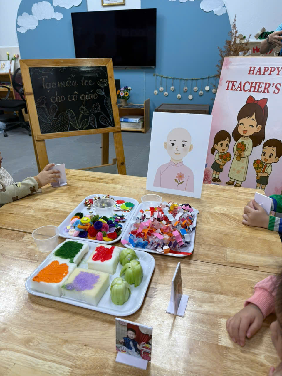 Mỗi bé được thỏa sức sáng tạo khi sử dụng nhiều nguyên vật liệu khác nhau để làm nên những mái tóc rực rỡ, ngộ nghĩnh và nhiều màu sắc.