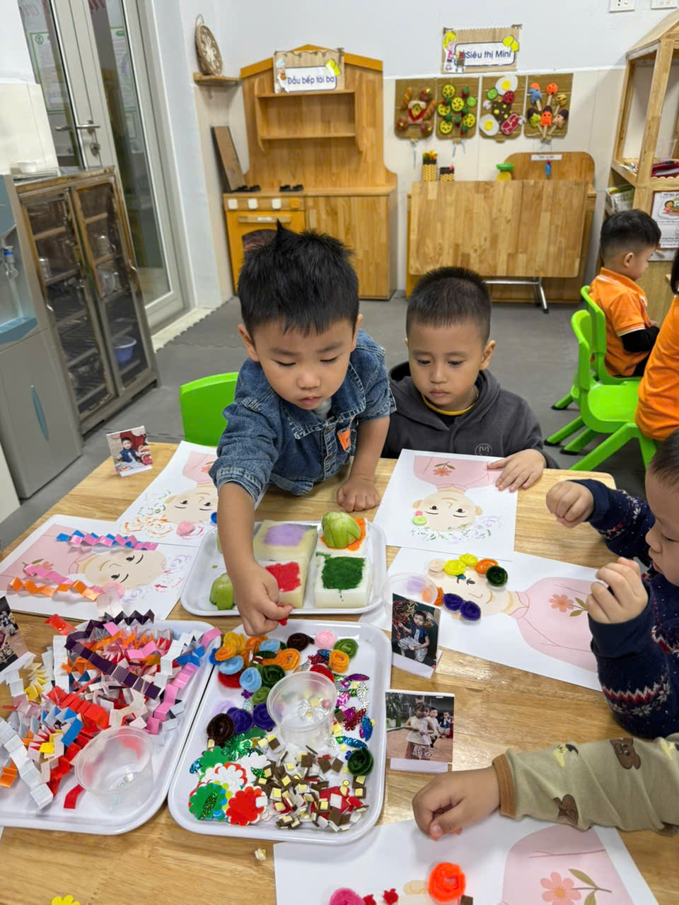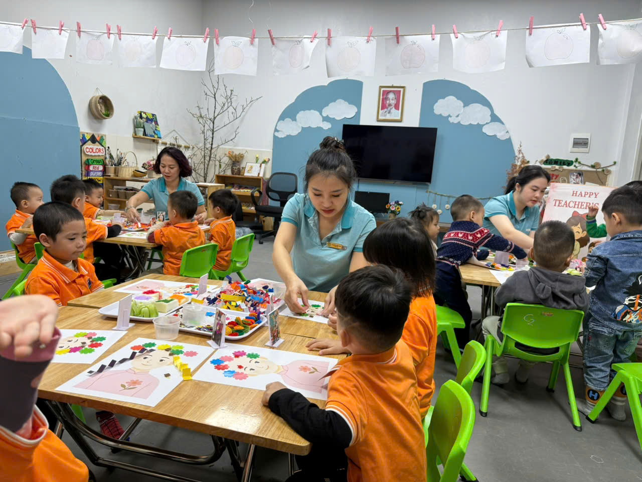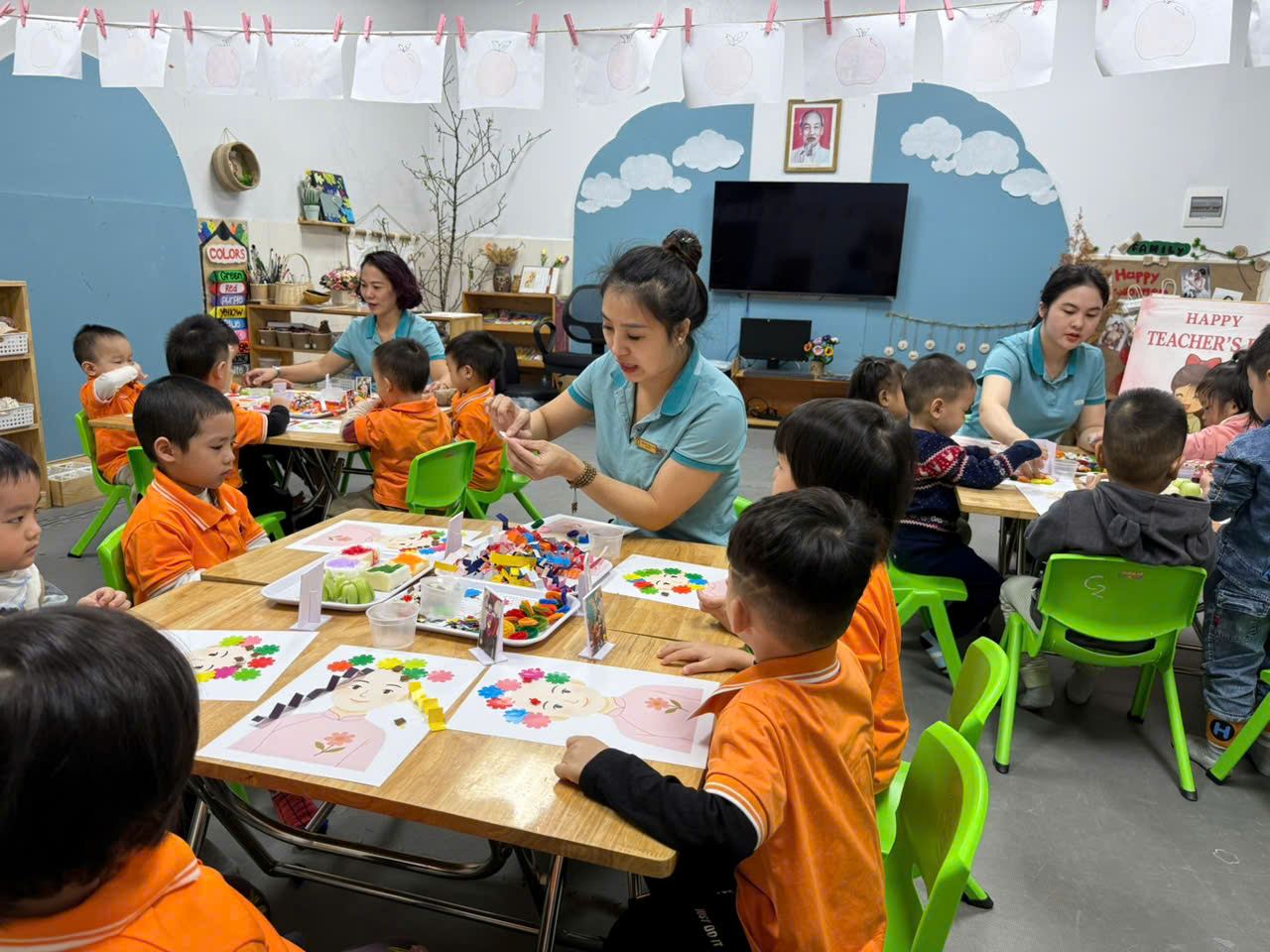 Với đôi bàn tay nhỏ xinh và sự hồn nhiên trong từng nét dán, nét in các bé đã tạo ra những “tác phẩm nghệ thuật” mang đậm dấu ấn riêng. Mỗi bức tranh không chỉ là sản phẩm sáng tạo mà còn là món quà bé gửi đến cô – người đã yêu thương, chăm sóc và dạy dỗ mình mỗi ngày. Đây chắc chắn sẽ là những kỷ niệm thật đẹp và ấm áp trong hành trình yêu thương giữa cô và trò.