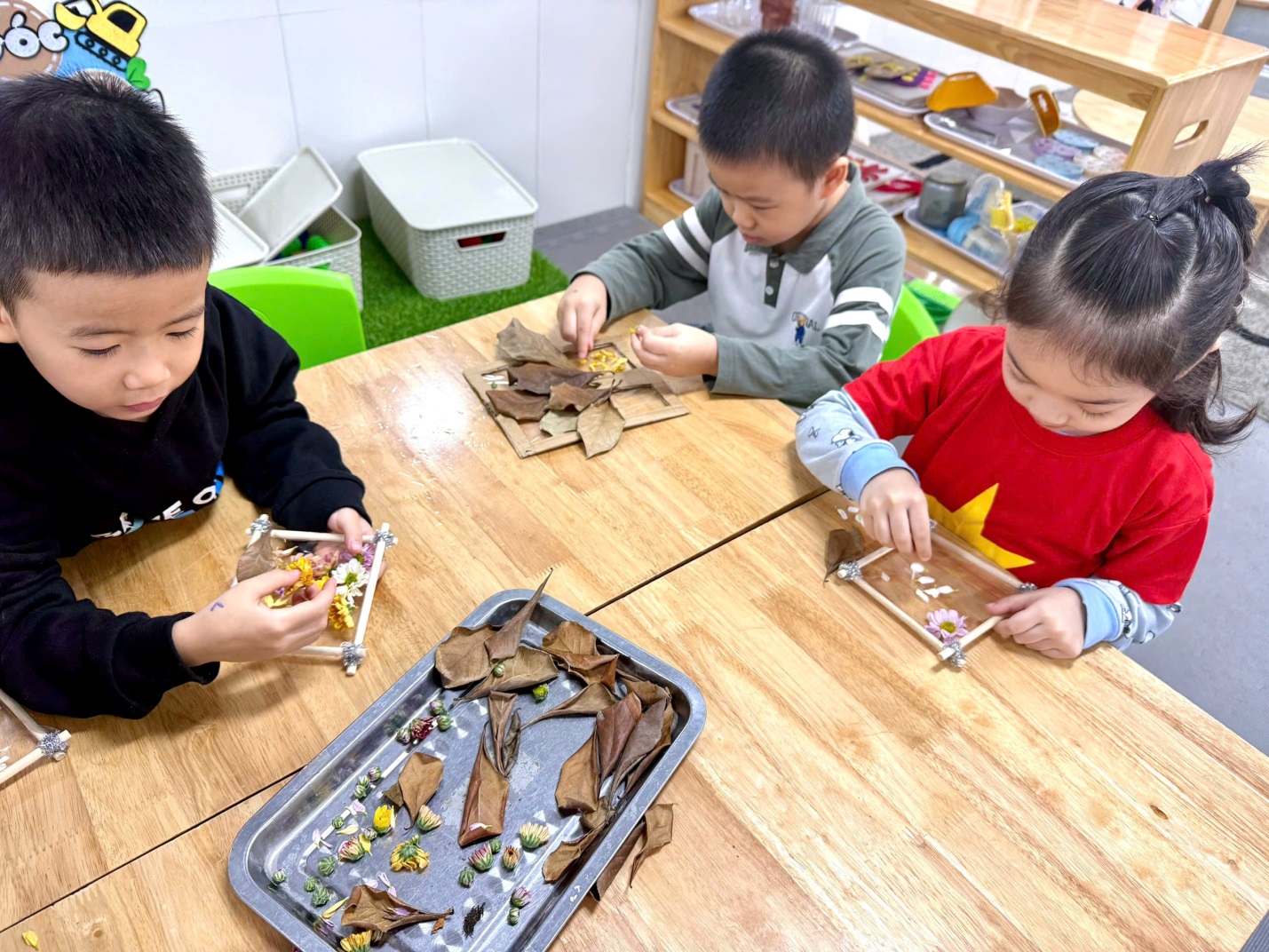 Với Reggio Emilia, trẻ được coi là những cá thể giàu năng lực tiềm ẩn và có khả năng tự tìm tòi khám phá thế giới xung quanh. Trong hoạt động lần này, các con được tự lựa chọn hoa khô, lá cây, cành nhỏ, hạt giống và nhiều chất liệu thiên nhiên khác để tạo nên bức tranh theo ý tưởng của riêng mình. Từ việc quan sát màu sắc, kết cấu đến việc sắp đặt bố cục, trẻ tự do thể hiện suy nghĩ, cảm xúc và câu chuyện nhỏ xinh của mình.