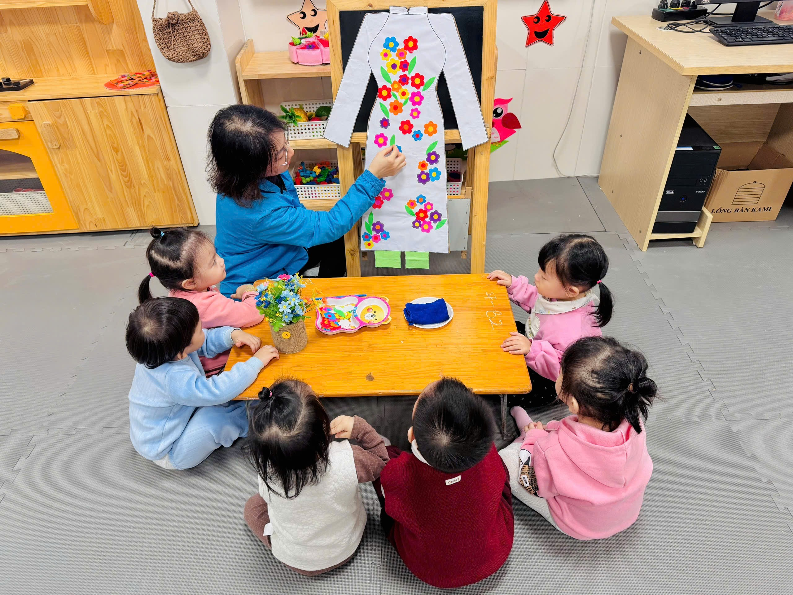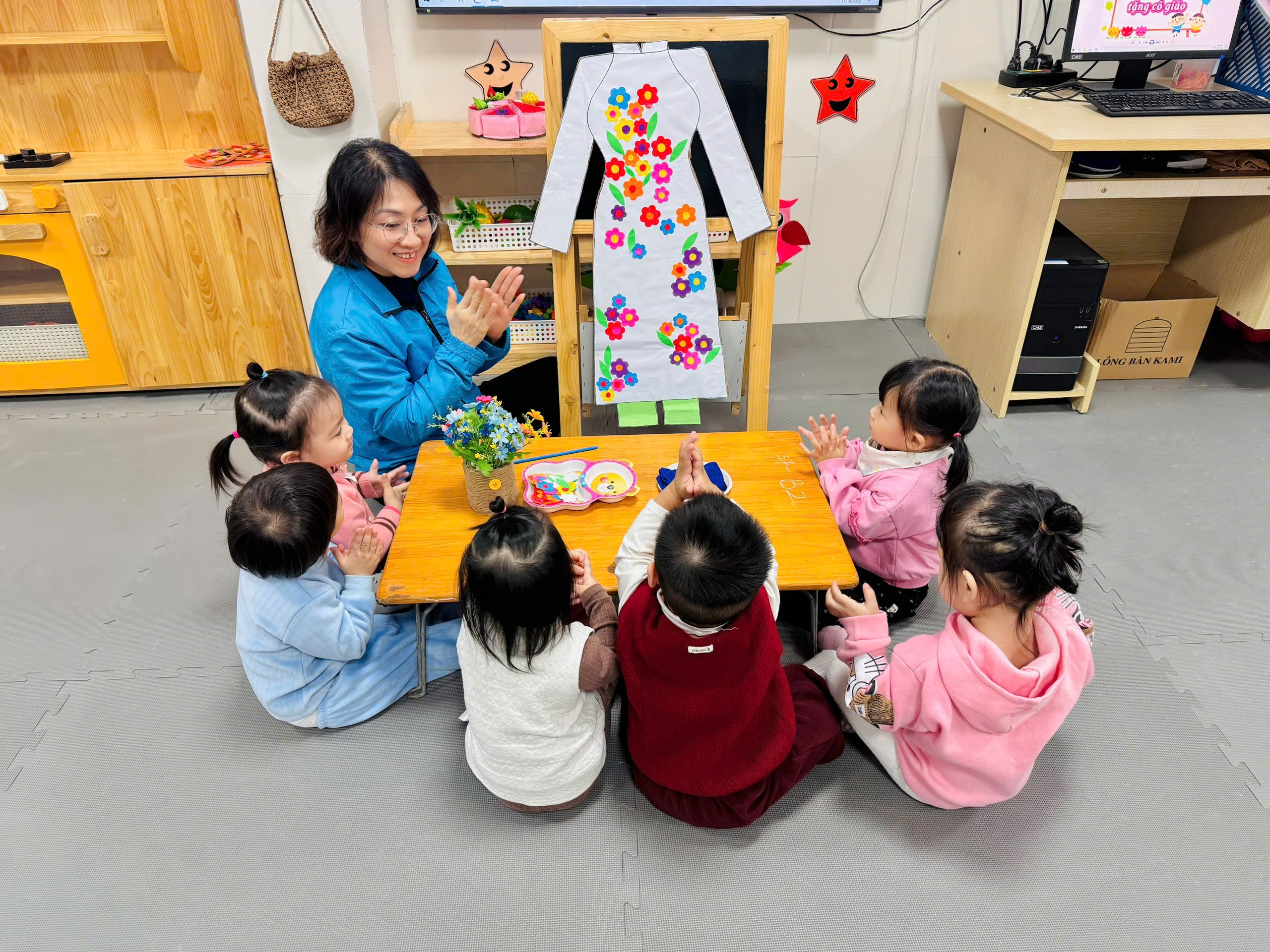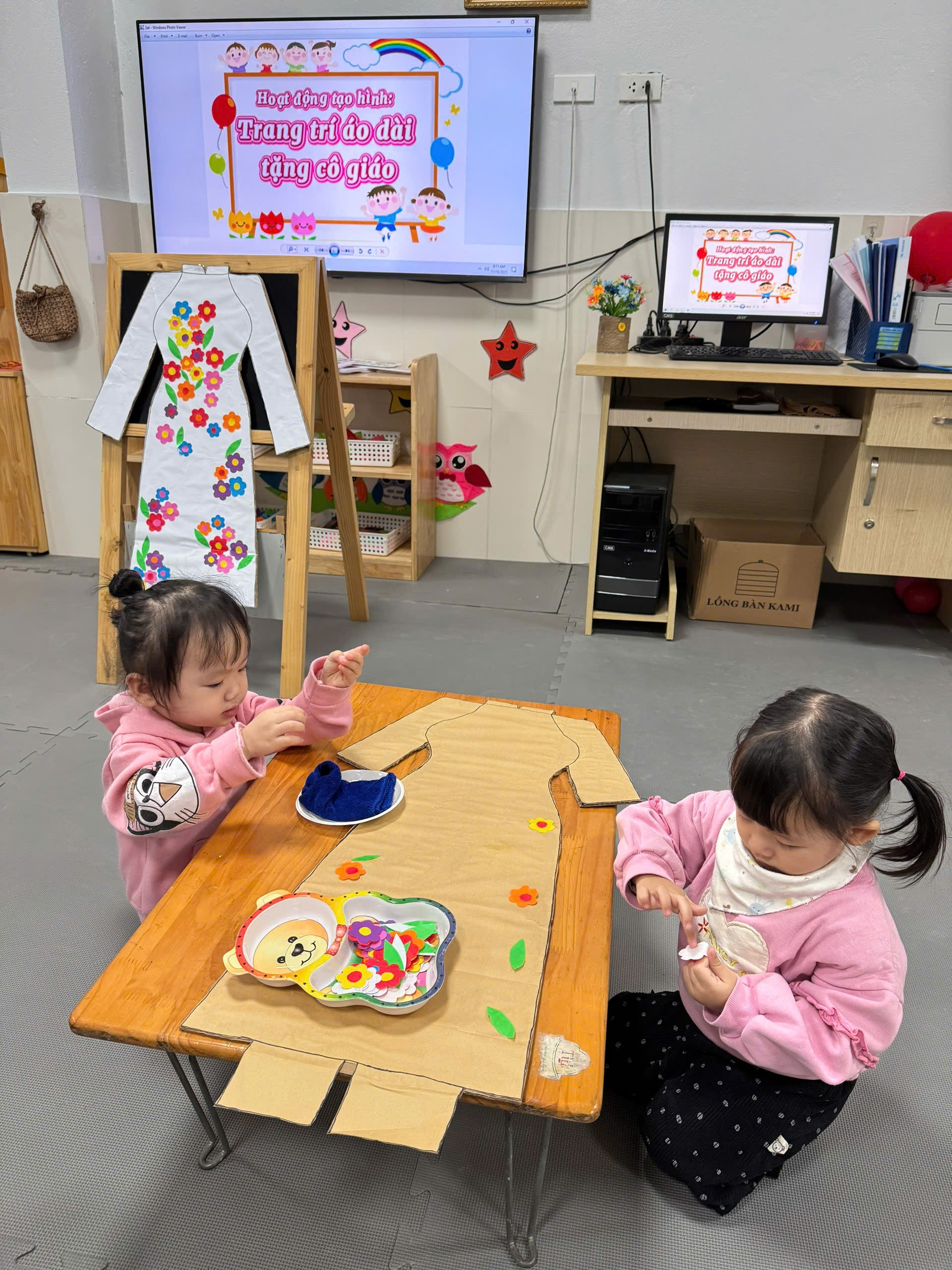 Với sự hướng dẫn và những bông hoa sắc màu được cô chuẩn bị sẵn, các bé hào hứng lựa chọn từng bông hoa mình thích rồi nhẹ nhàng chấm hồ dán lên chiếc áo dài giấy. Dưới đôi bàn tay nhỏ xinh, những chiếc áo dài trở nên rực rỡ hơn bao giờ hết: có áo thì điểm vài bông hoa đỏ nổi bật, có áo lại rải những bông hoa vàng – hồng thật dịu dàng.