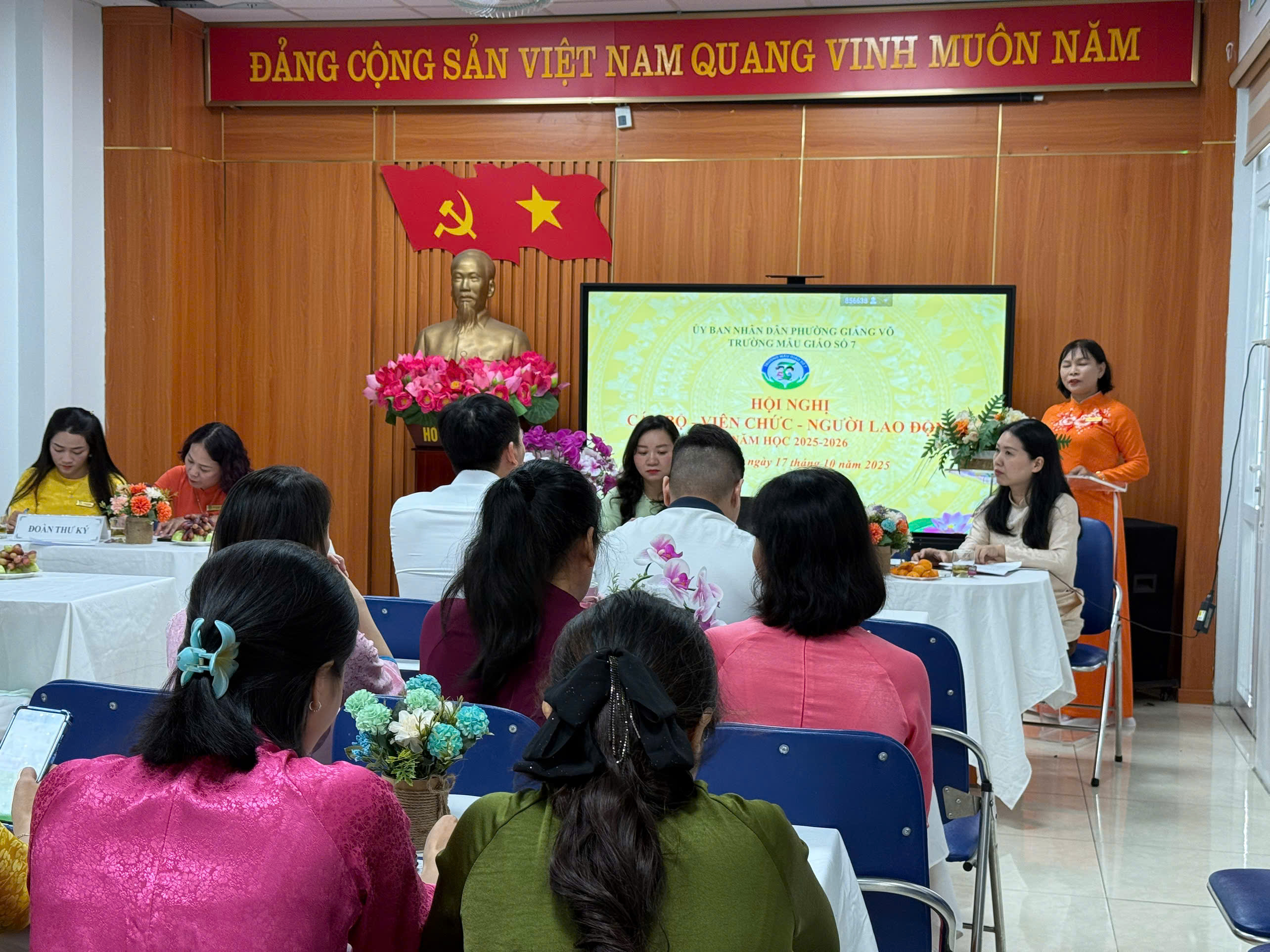 Không khí Hội nghị được lan tỏa bằng tinh thần đoàn kết, tin tưởng và khát vọng đổi mới – nơi mỗi cán bộ, giáo viên, nhân viên đều ý thức rõ vai trò, trách nhiệm của mình trong hành trình chung xây dựng “Trường Mẫu giáo số 7 – Xanh, An toàn, Hạnh phúc và Phát triển bền vững”.