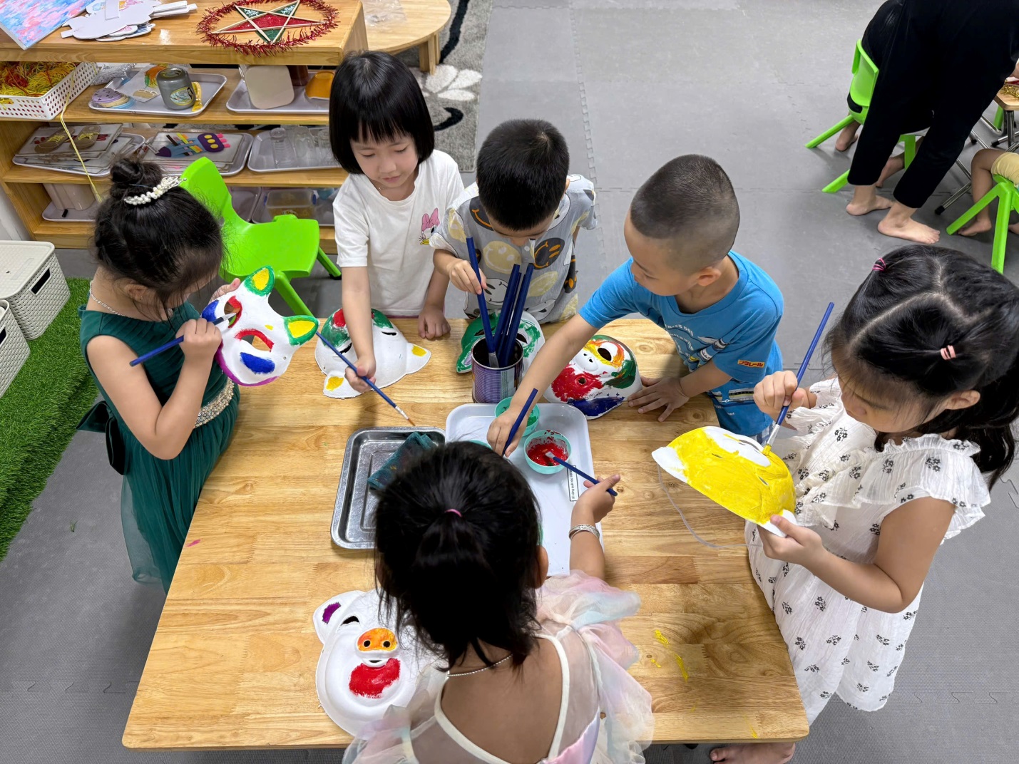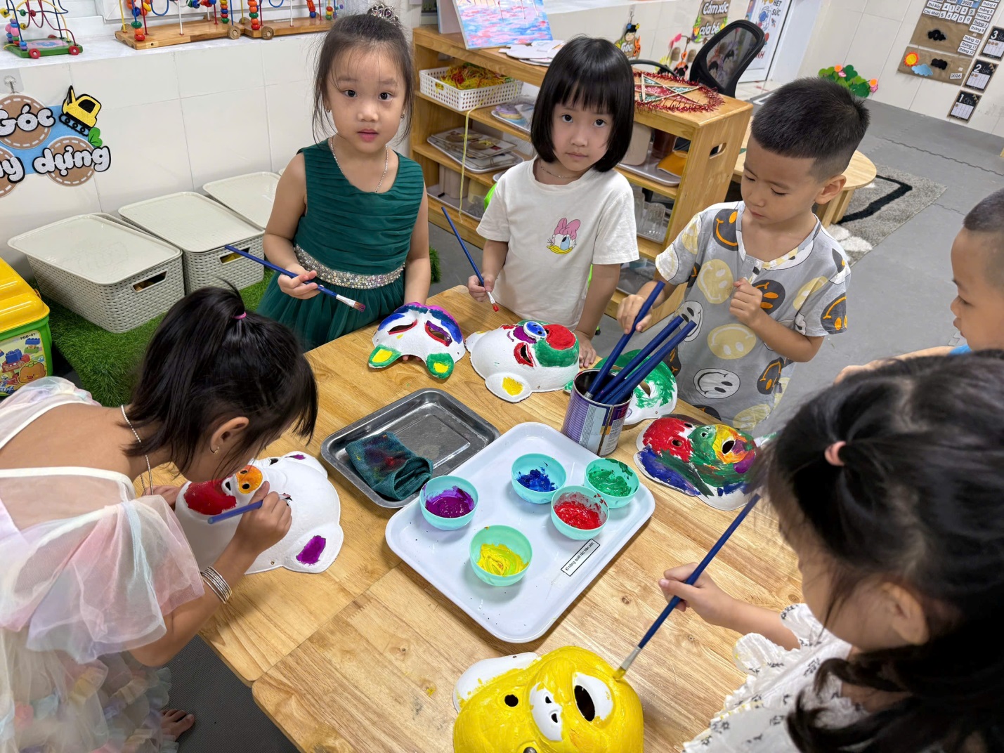 Song song đó, hoạt động trang trí mặt nạ cũng đem lại nhiều tiếng cười. Những chiếc mặt nạ bồi trắng được “biến hóa” thành nhiều màu sắc. Các con hào hứng khoe với bạn bè sản phẩm của mình, tạo nên một không gian vừa sáng tạo vừa tràn đầy niềm vui.