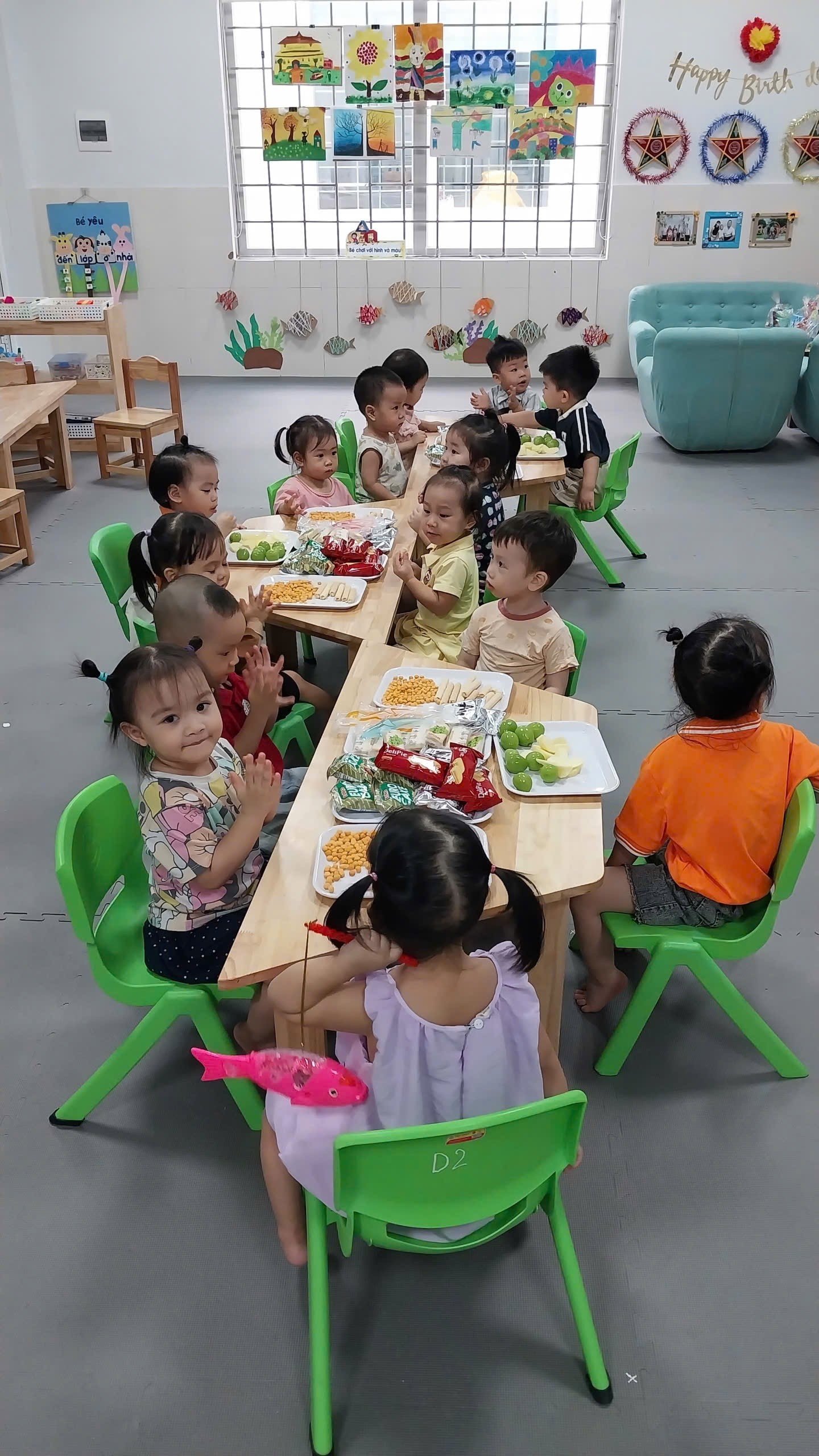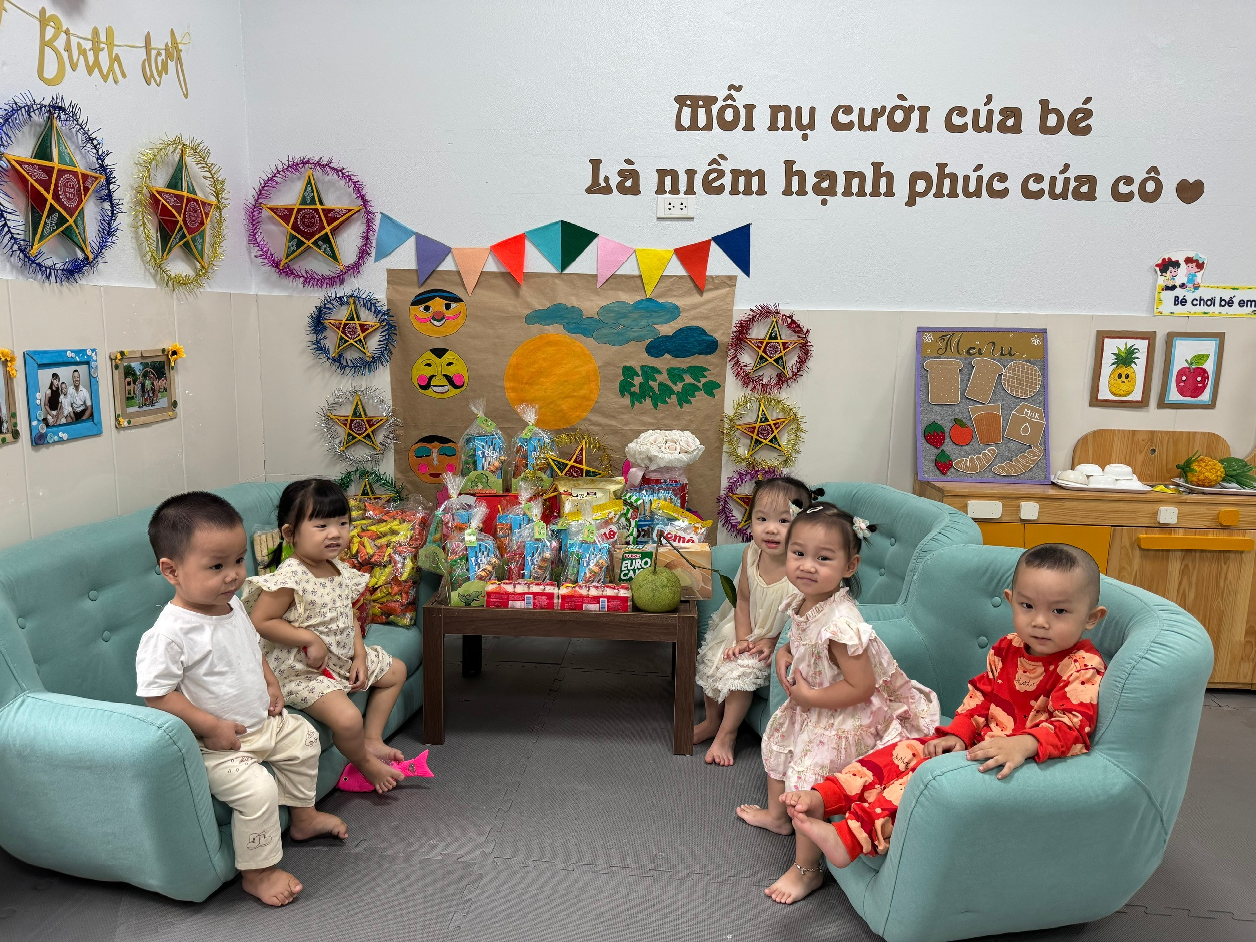 Kế tiếp đó một buổi liên hoan ấm áp và đầy niềm vui dưới sự chuẩn bị chu đáo của các cô giáo cùng sự đồng hành của phụ huynh khiến không gian lớp học trở nên lung linh, rực rỡ sắc màu đèn ông sao và mâm cỗ Trung thu.