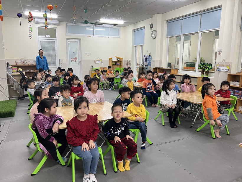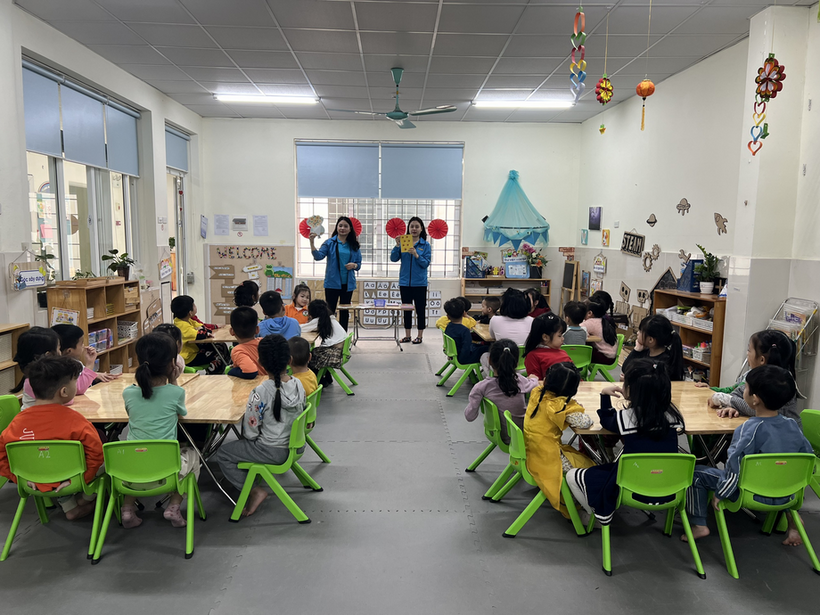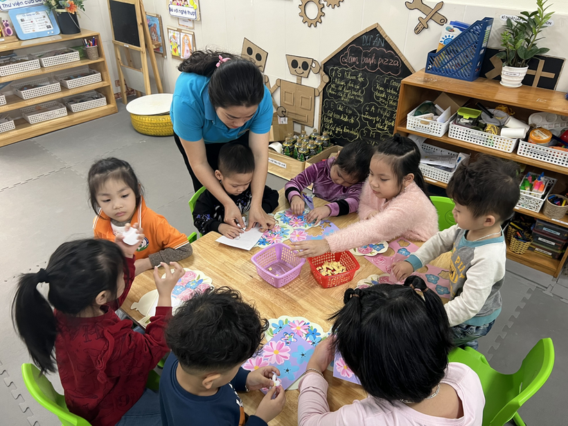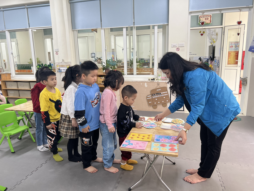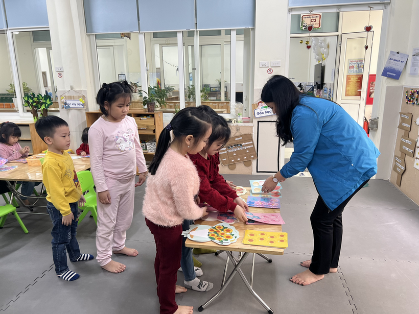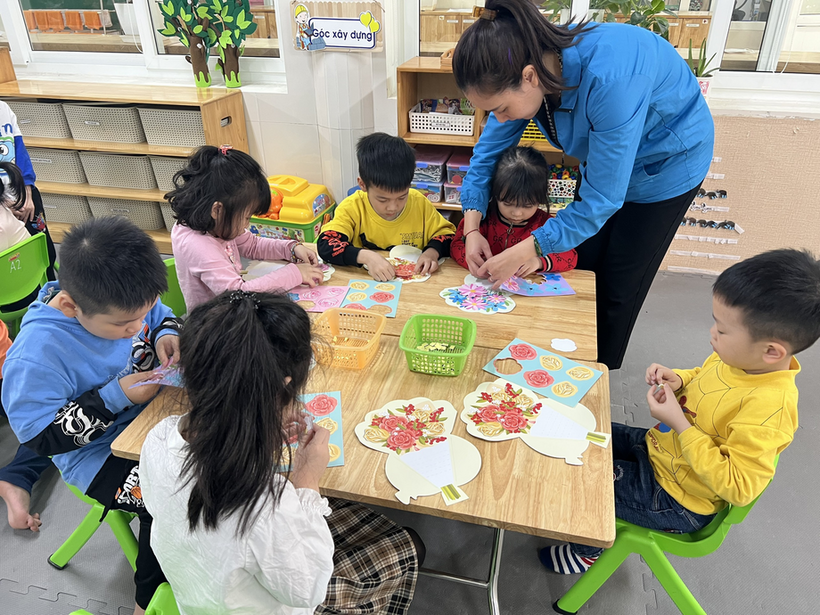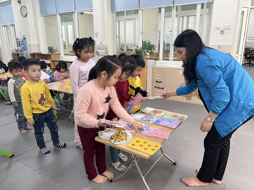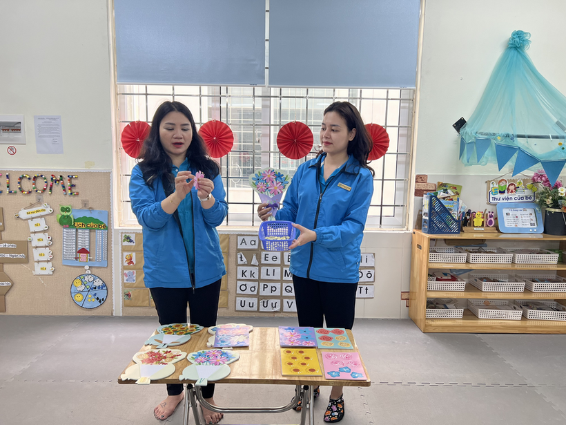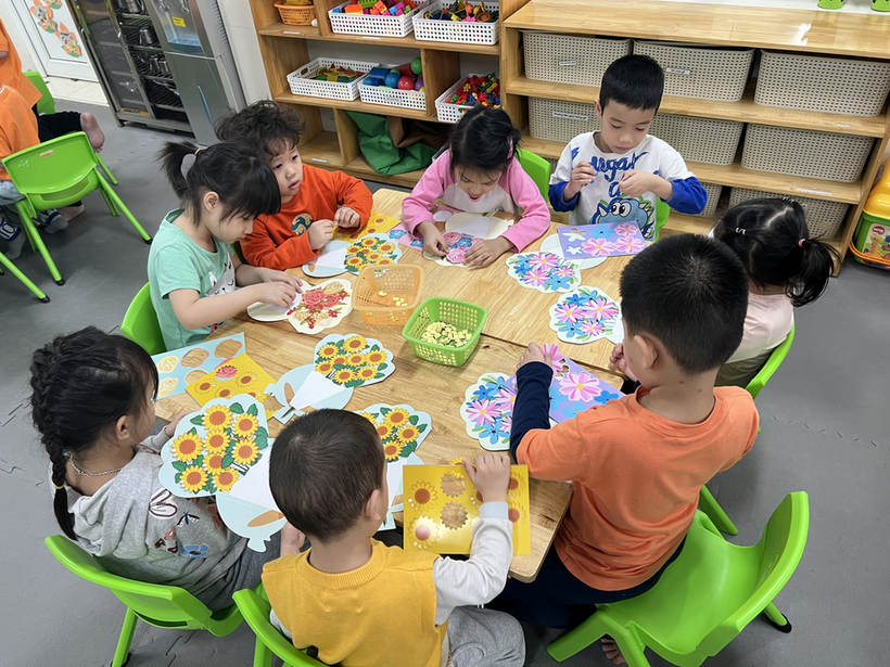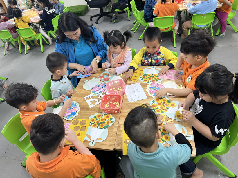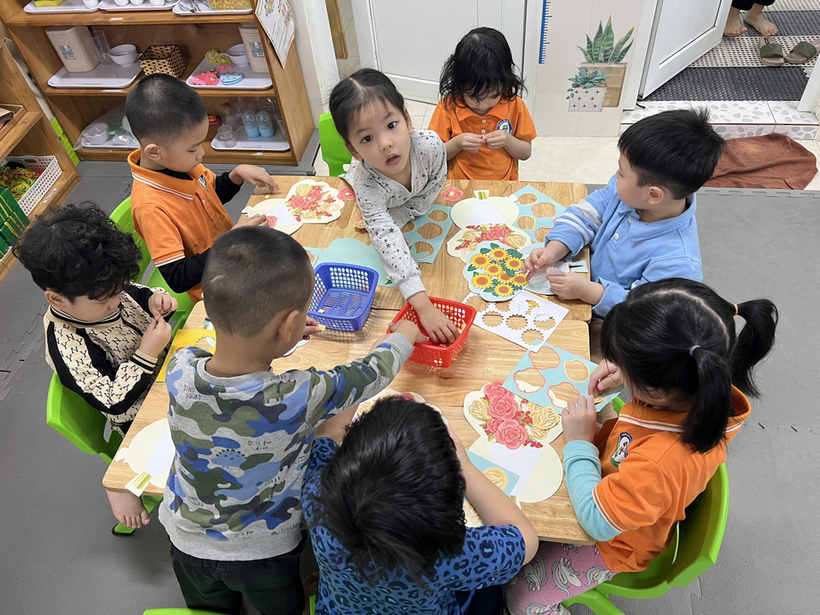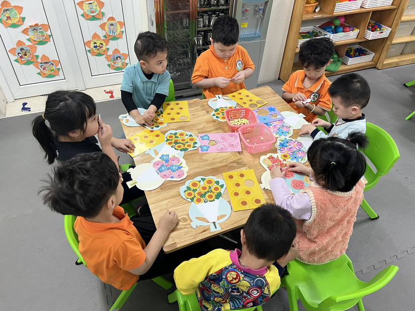 Đặc biệt hơn khi tham gia hoạt động giao lưu liên khối, các con lớp mẫu giáo lớn cũng đã biết cách hướng dẫn, giúp đỡ các em lớp mẫu giáo bé để cùng nhau tạo ra sản phẩm đẹp.