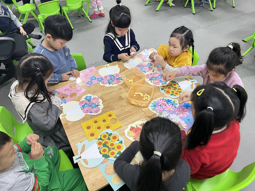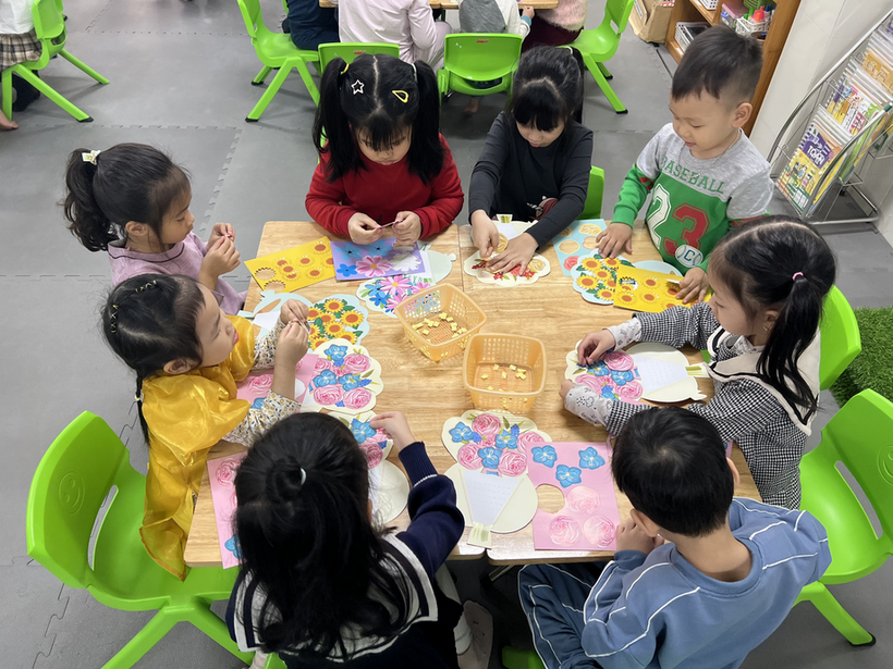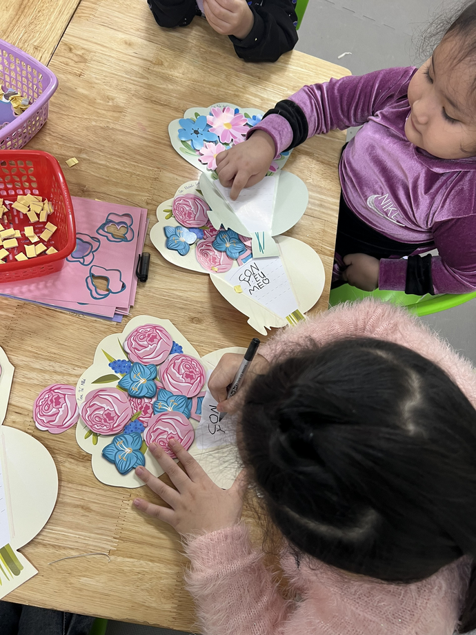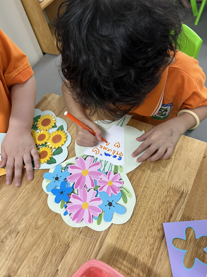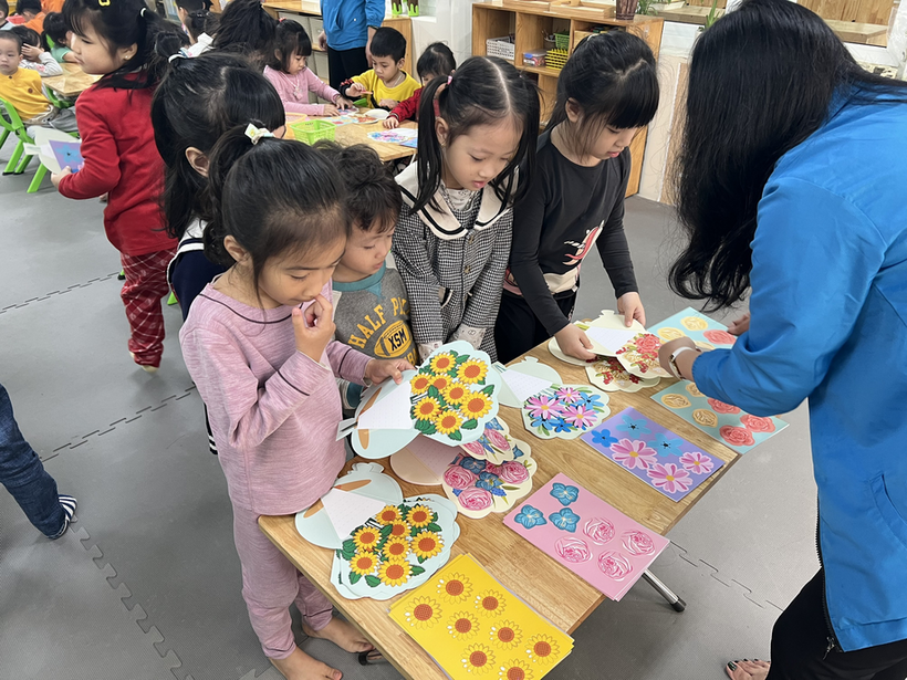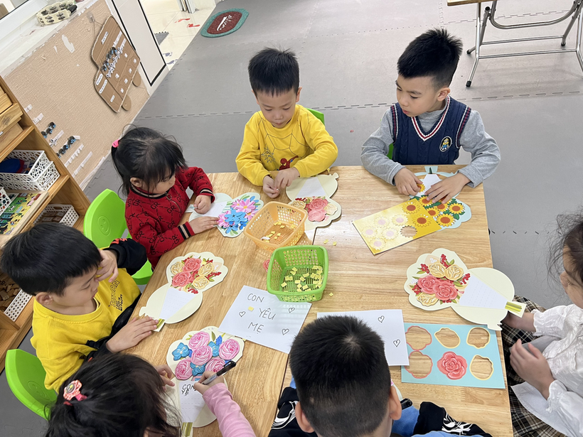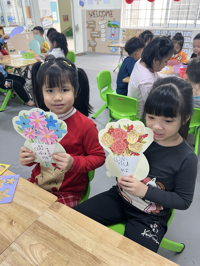 Dưới đây là một số hình ảnh các con đang tự tay làm những bông hoa thật đẹp lên bưu thiếp: