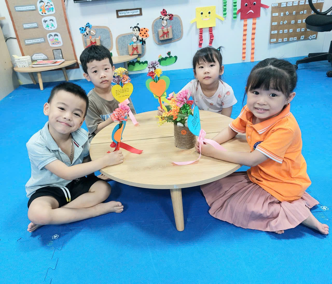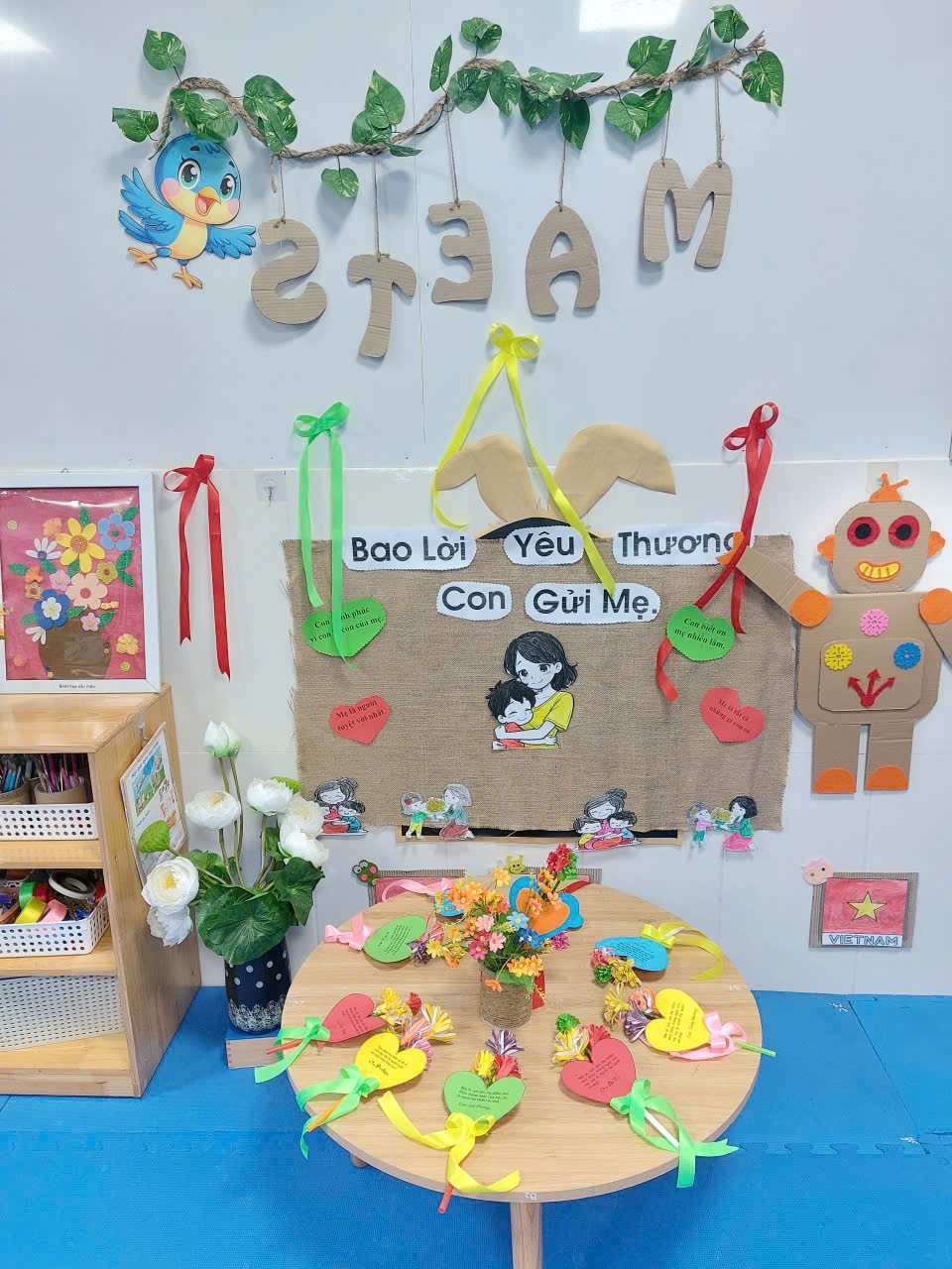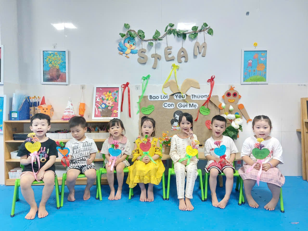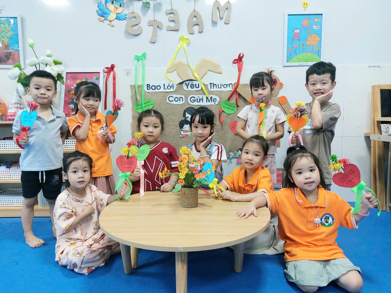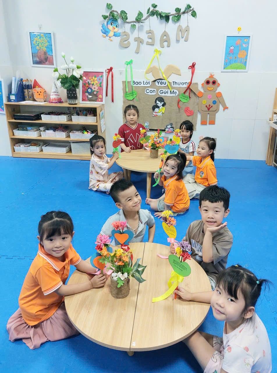 Sáng sớm, con dậy thật sớm đến lớp để chuẩn bị một món quà đặc biệt dành cho mẹ. Con cùng các cô tại lớp B2 tham gia buổi trải nghiệm làm thiệp hoa vô cùng vui vẻ và ý nghĩa. Dù không phải là đôi tay khéo và giỏi cắm hoa , bông hoa rất đơn giản cùng tấm thiệt với dòng chữ yêu thương con muốn gửi tới bà tới mẹ.