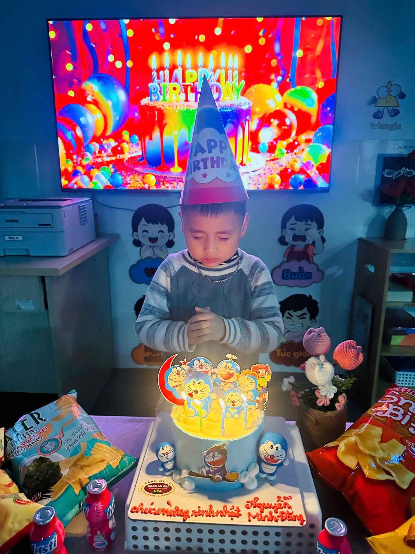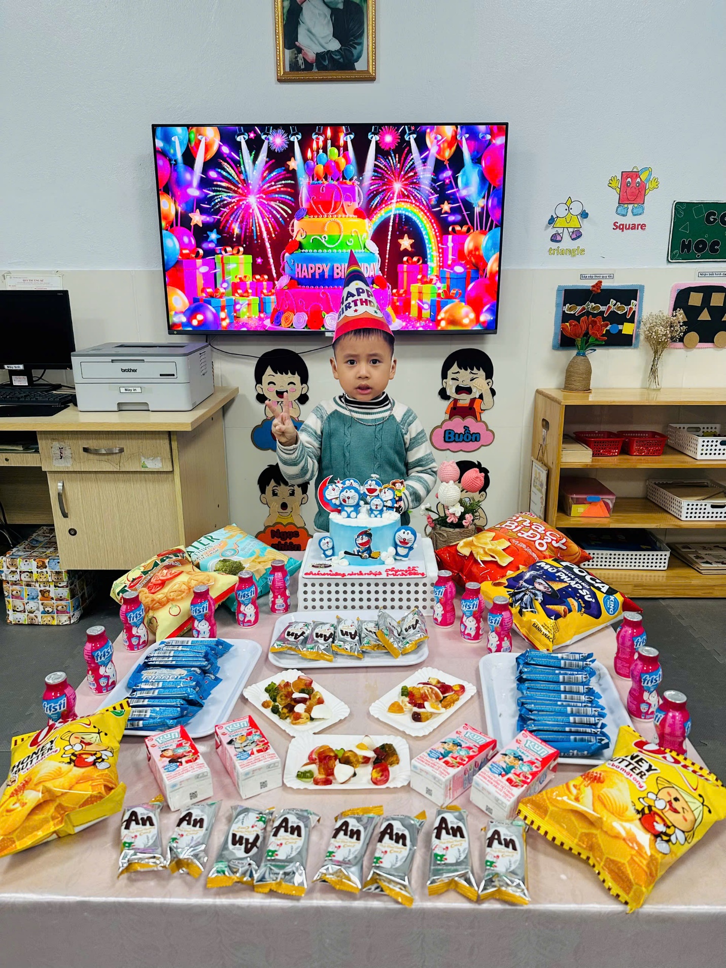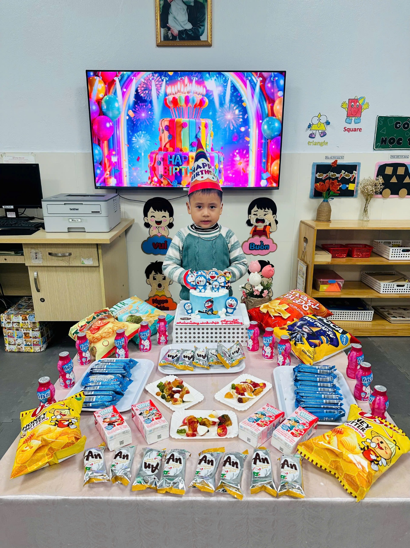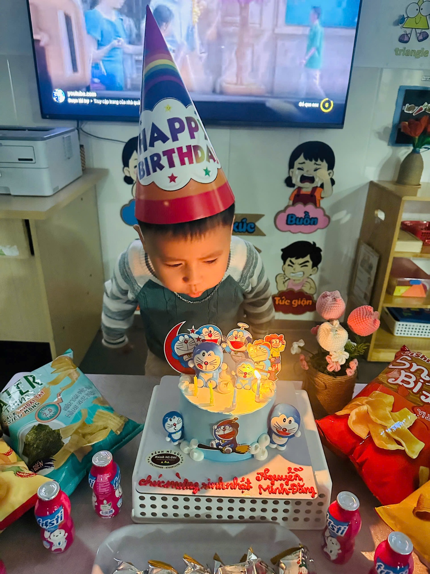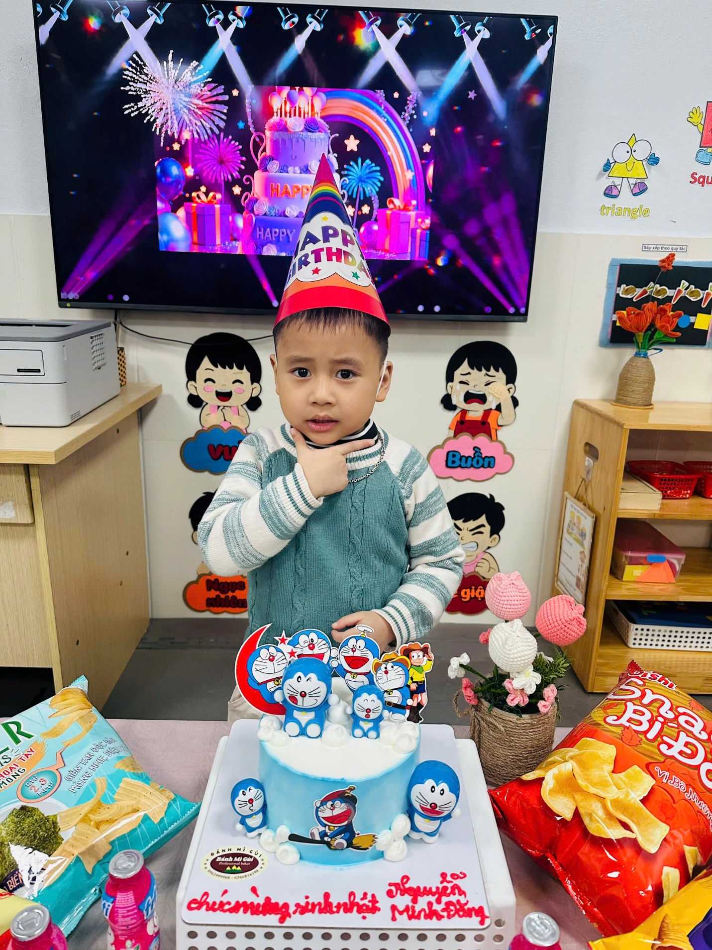 Buổi sinh nhật được diễn ra trong không gian thân thiện, ngập tràn tiếng cười với những lời chúc dễ thương, những tràng vỗ tay hào hứng và chiếc bánh sinh nhật xinh xắn dành riêng cho Minh Đăng. Con rất vui và hào hứng khi được đứng giữa vòng tay yêu thương của cô giáo và các bạn, cùng thổi nến và đón nhận những lời chúc tốt đẹp.