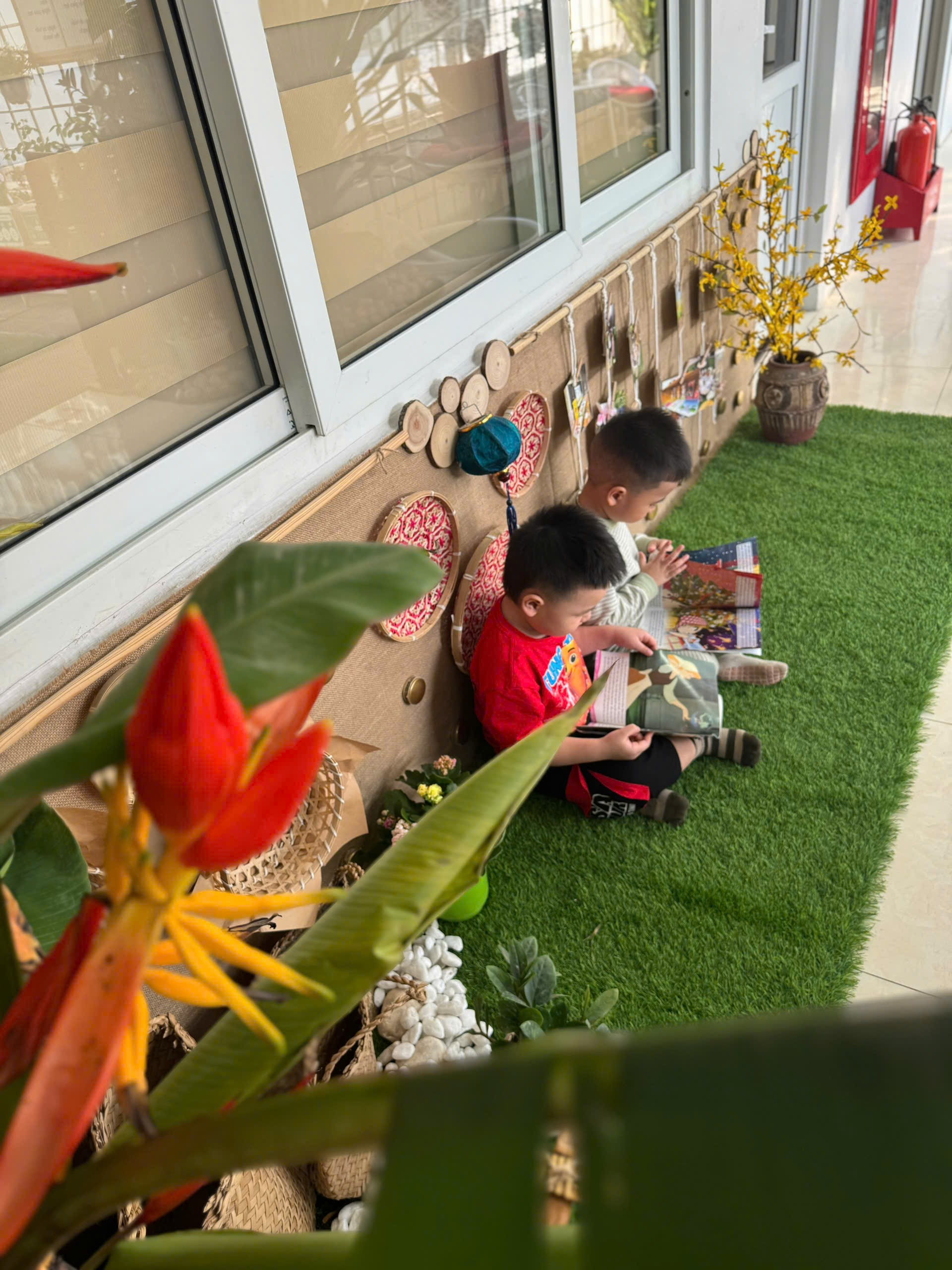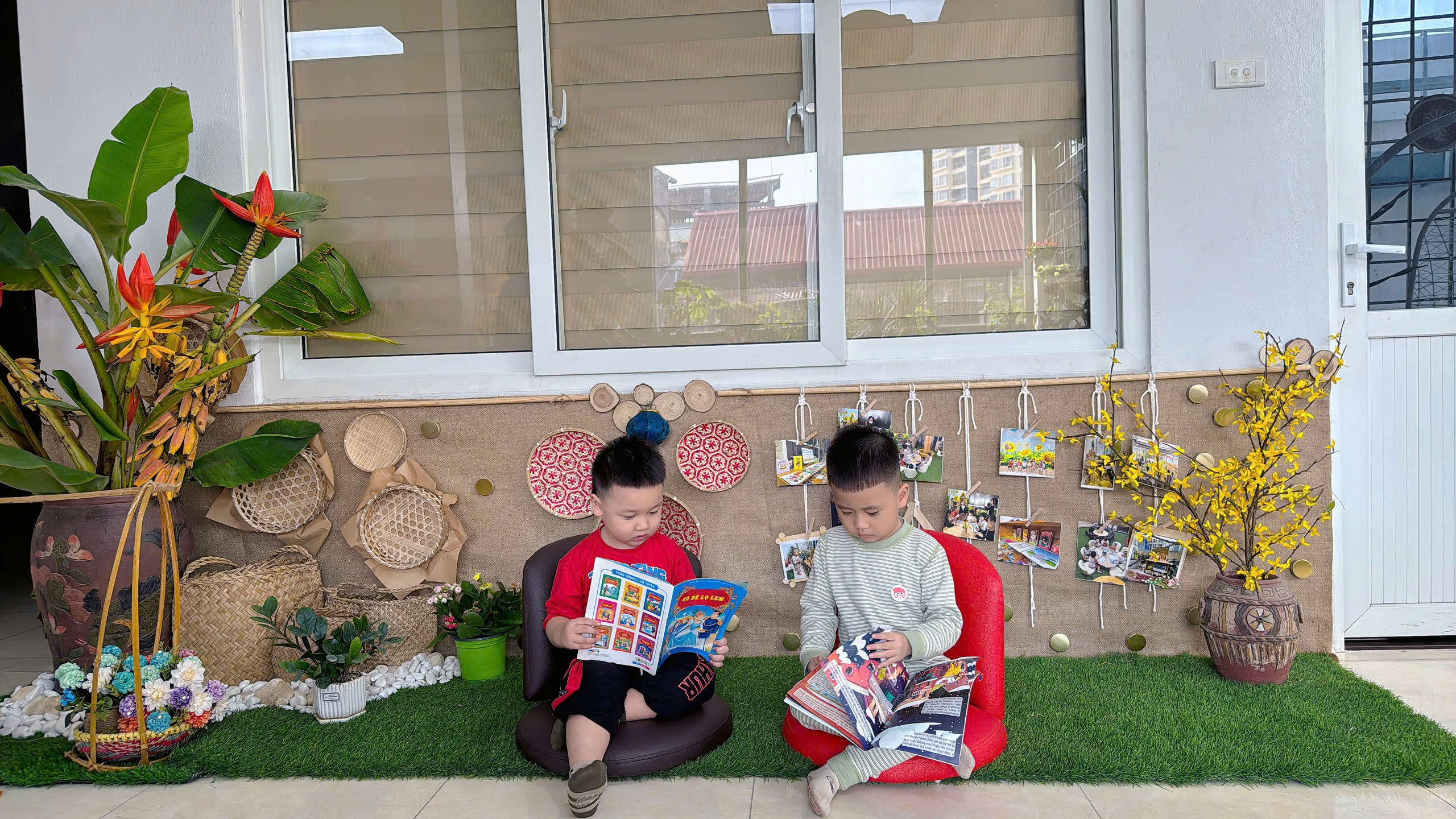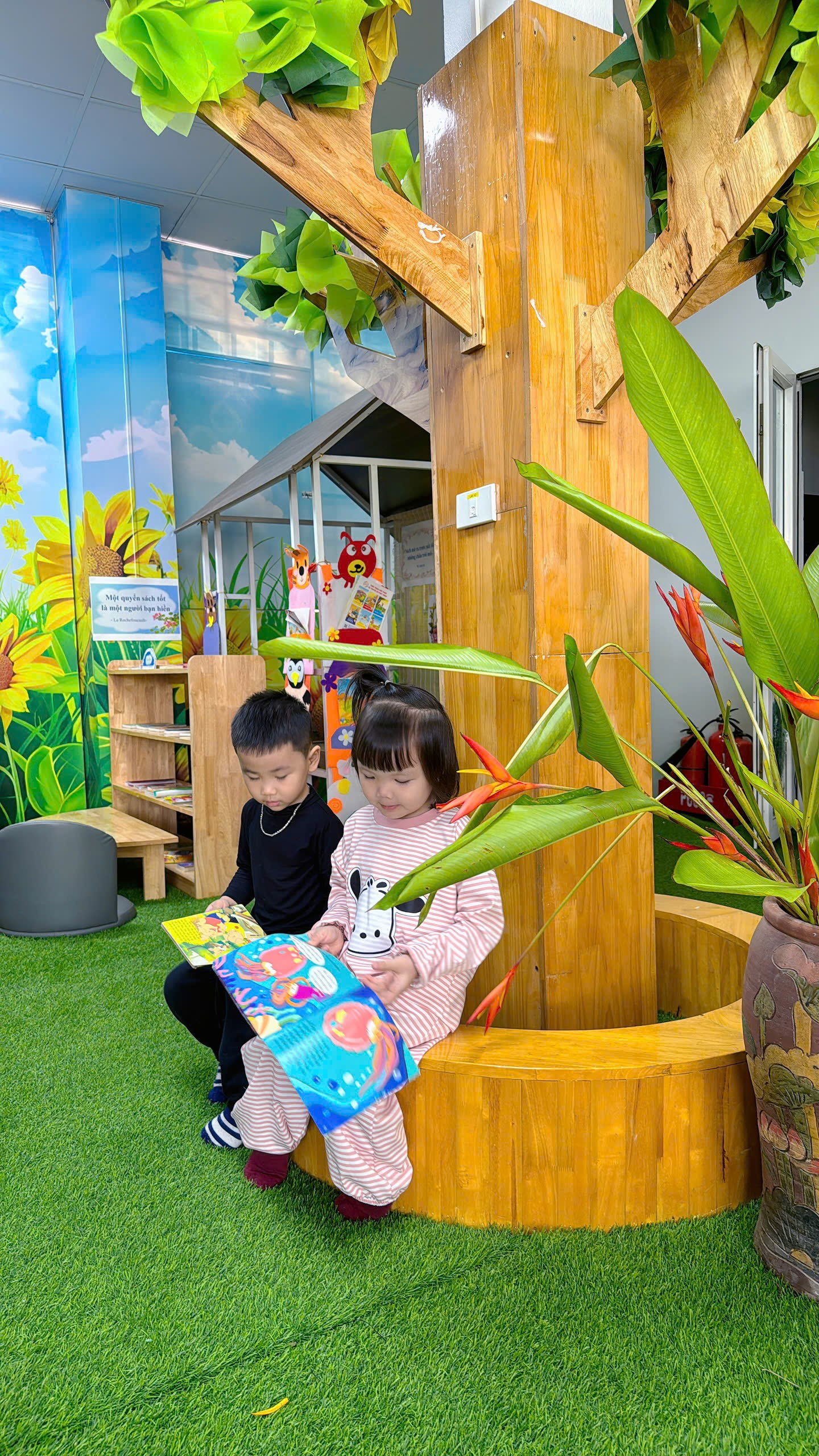 Thư viện được sắp xếp gần gũi, vừa tầm với trẻ. Những giá sách thấp, những chiếc ghế êm và vô vàn cuốn truyện tranh đầy màu sắc luôn sẵn sàng chào đón các con. Mỗi buổi đọc sách, cô giáo nhẹ nhàng hướng dẫn các con chọn sách, lật từng trang cẩn thận và cùng nhau khám phá những câu chuyện thú vị.