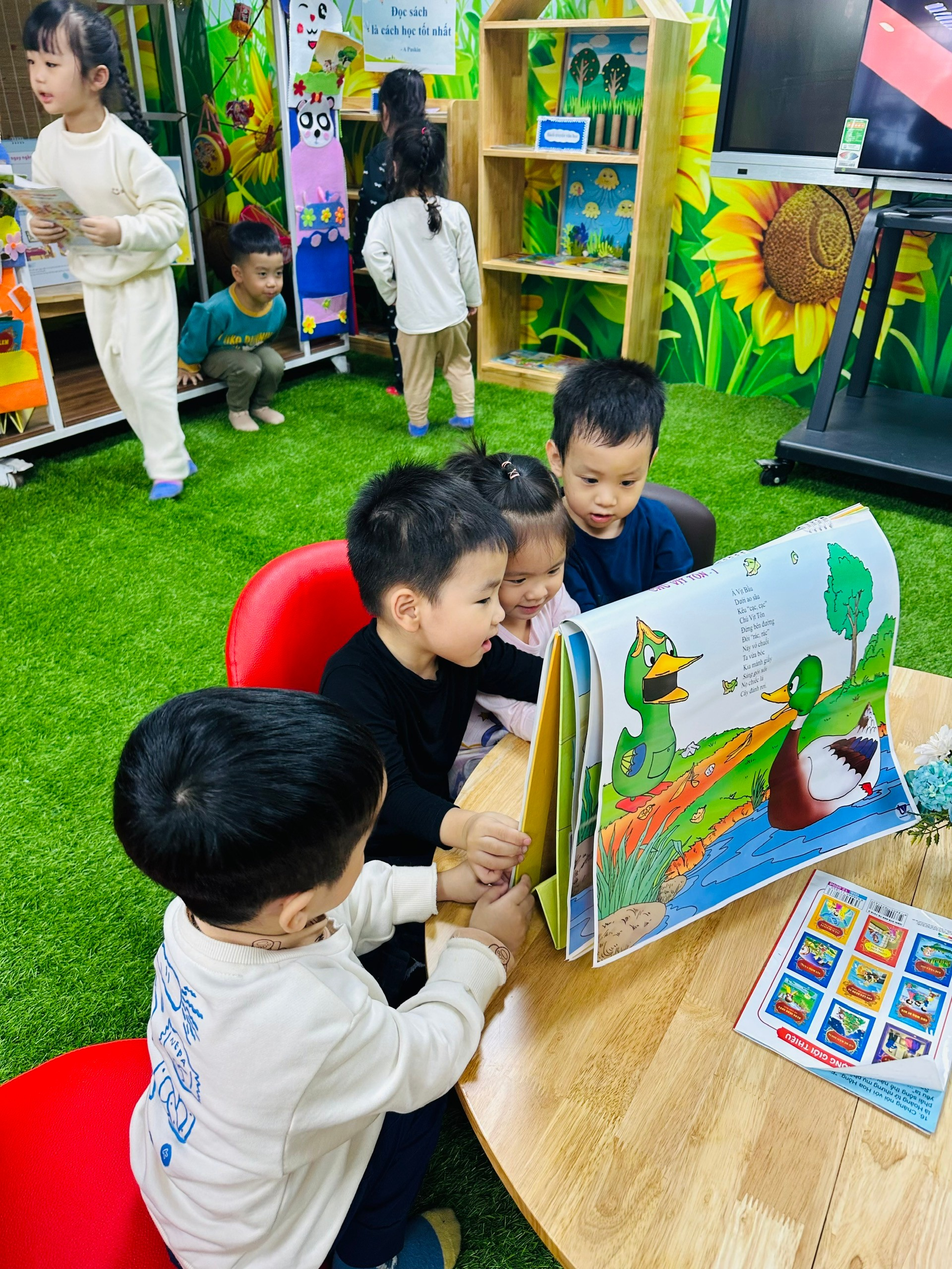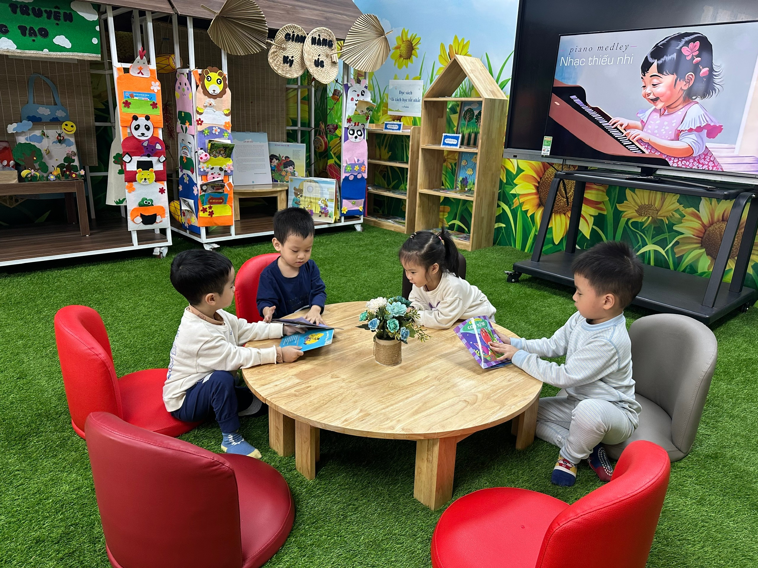 Thông qua hoạt động đọc sách hàng tuần, các con không chỉ được làm quen với chữ cái, hình ảnh mà còn phát triển vốn từ, khả năng diễn đạt và kỹ năng giao tiếp. Quan trọng hơn, các con dần hình thành thói quen yêu thích sách – một nền tảng quý giá cho hành trình học tập sau này.