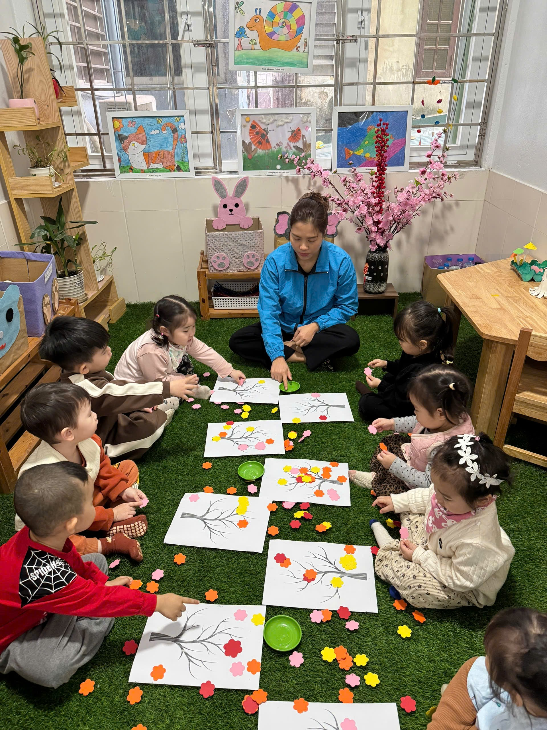 Hoạt động: “Dán hoa đào ngày tết” của các bé lớp Nhà trẻ