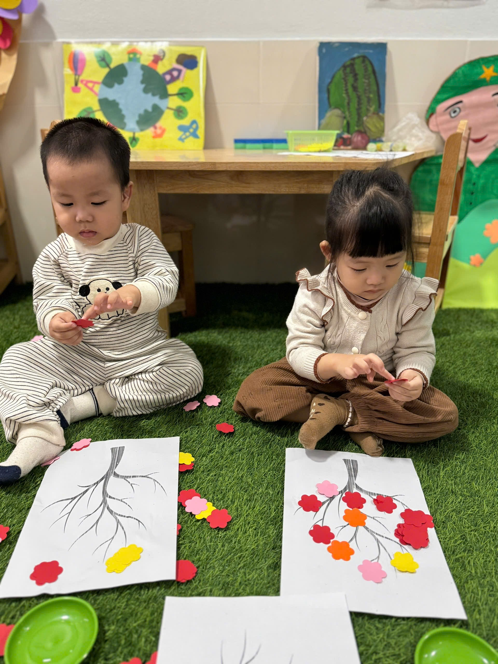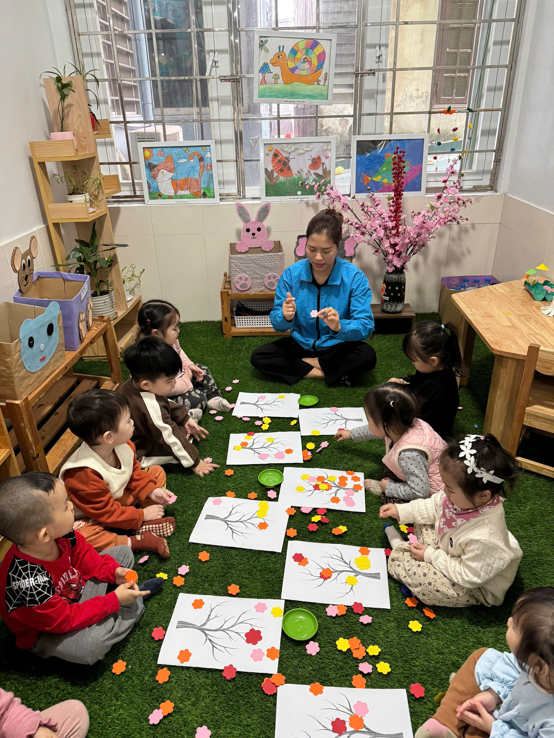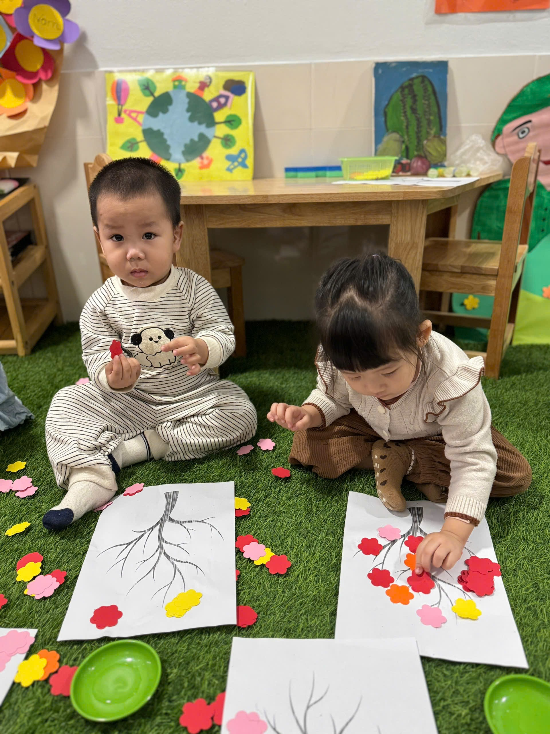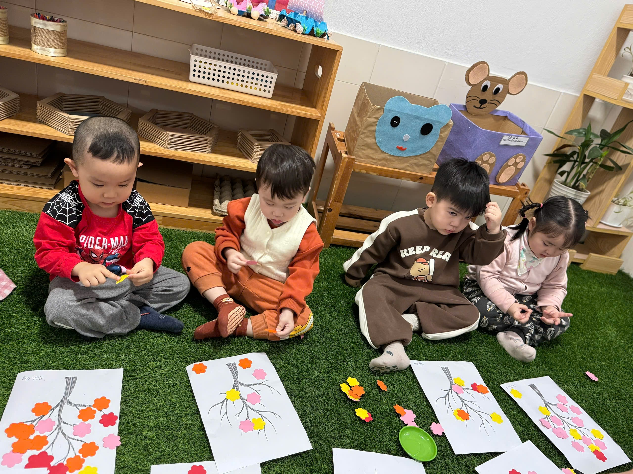 Dù đôi tay còn nhỏ xíu, thao tác còn vụng về, nhưng gương mặt bé nào cũng ánh lên niềm vui và sự hào hứng. Hoạt động dán hoa đào không chỉ giúp các bé rèn luyện kỹ năng vận động tinh, phát triển khả năng quan sát mà còn giúp các con làm quen với không khí ngày Tết, biết thêm về hình ảnh hoa đào – biểu tượng của mùa xuân. Qua đó, các bé cảm nhận được niềm vui, sự ấm áp và yêu thích những nét đẹp truyền thống của dân tộc.