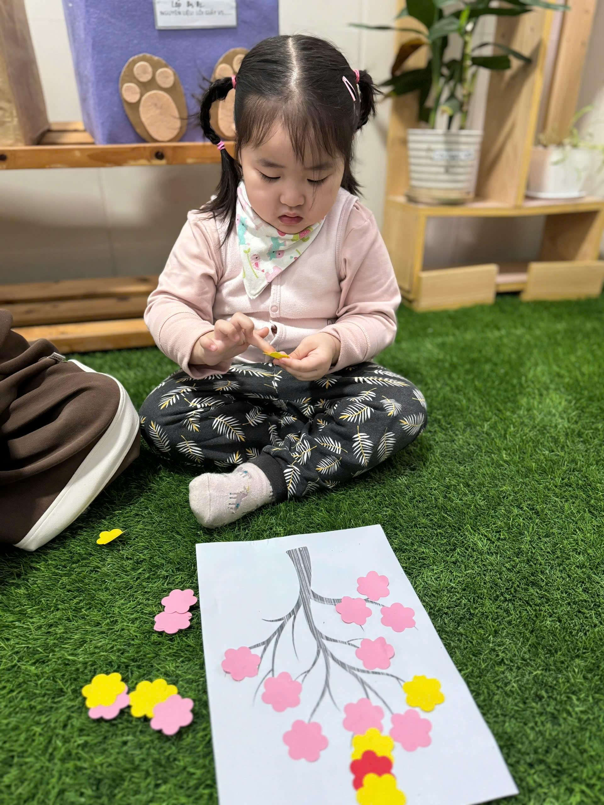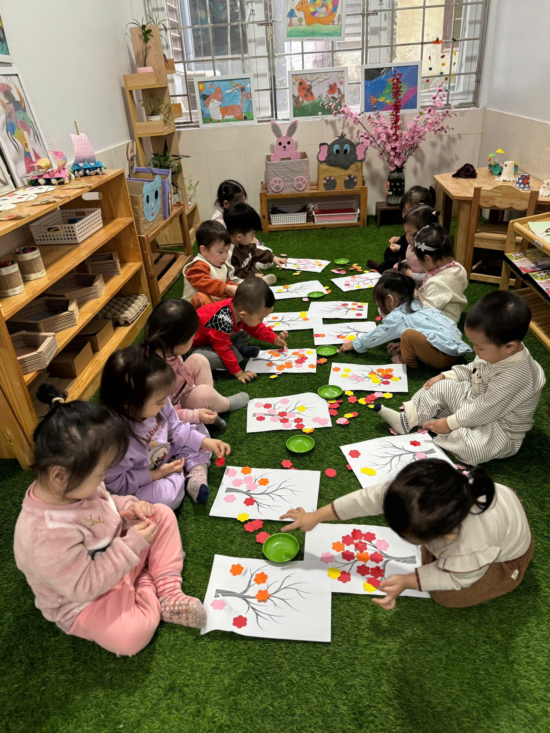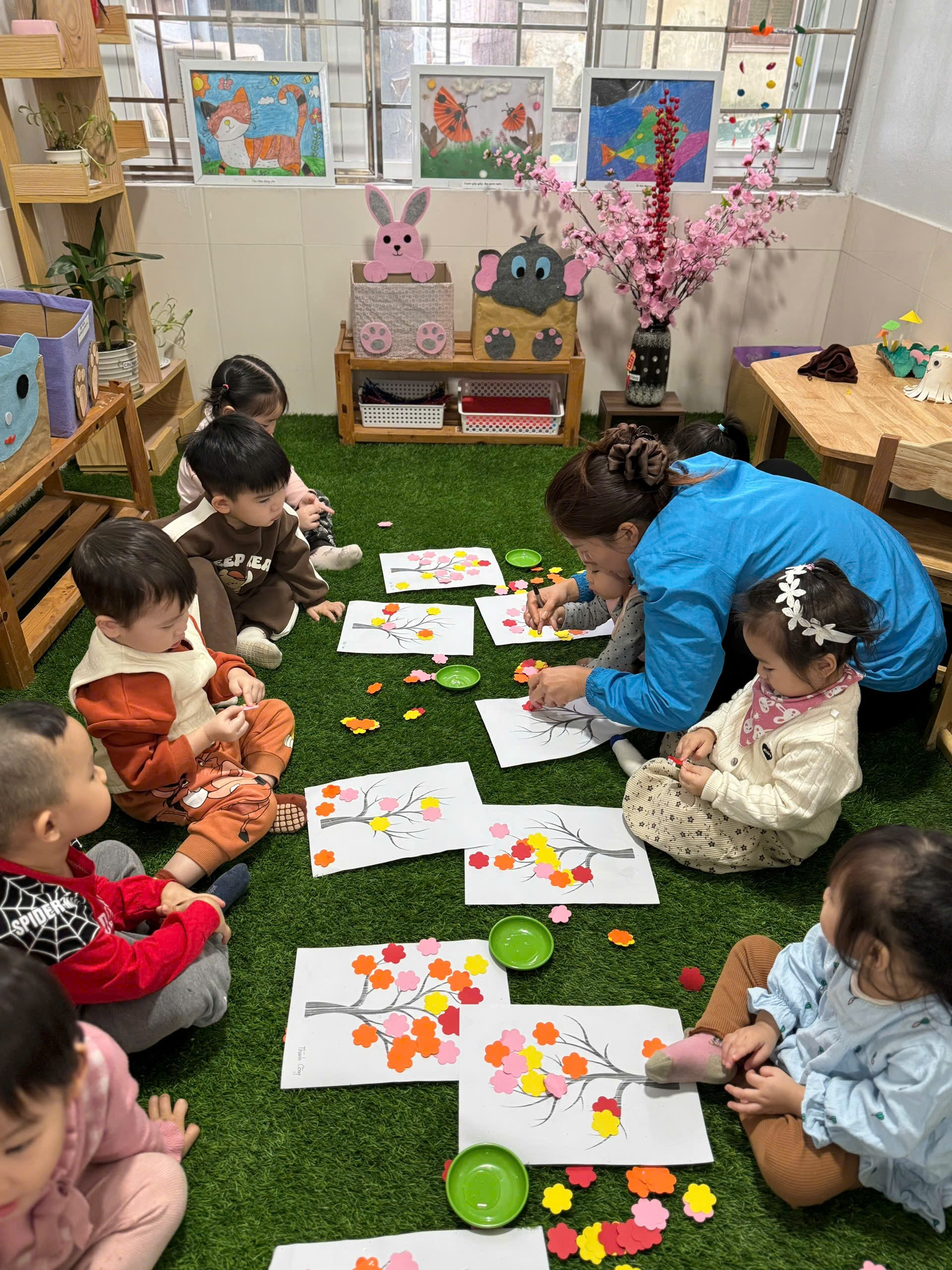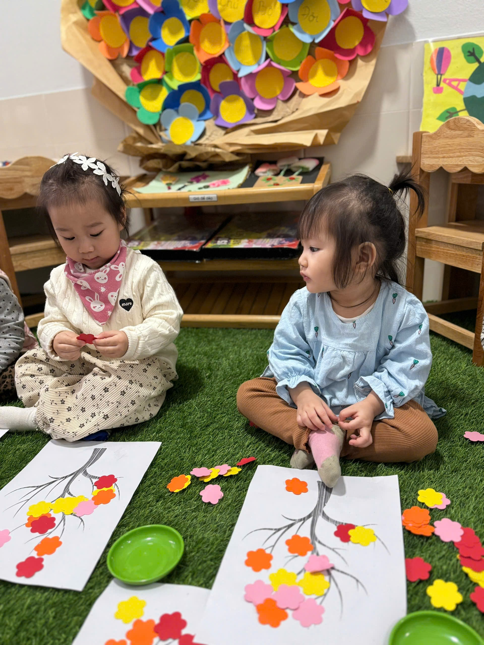 Trong hoạt động, các bé được cô chuẩn bị những bông hoa đào nhiều màu sắc rực rỡ. Dưới sự hướng dẫn nhẹ nhàng của cô giáo, các con biết cách cầm hồ dán, lựa chọn hoa và dán lên cành đào theo ý thích của mình.