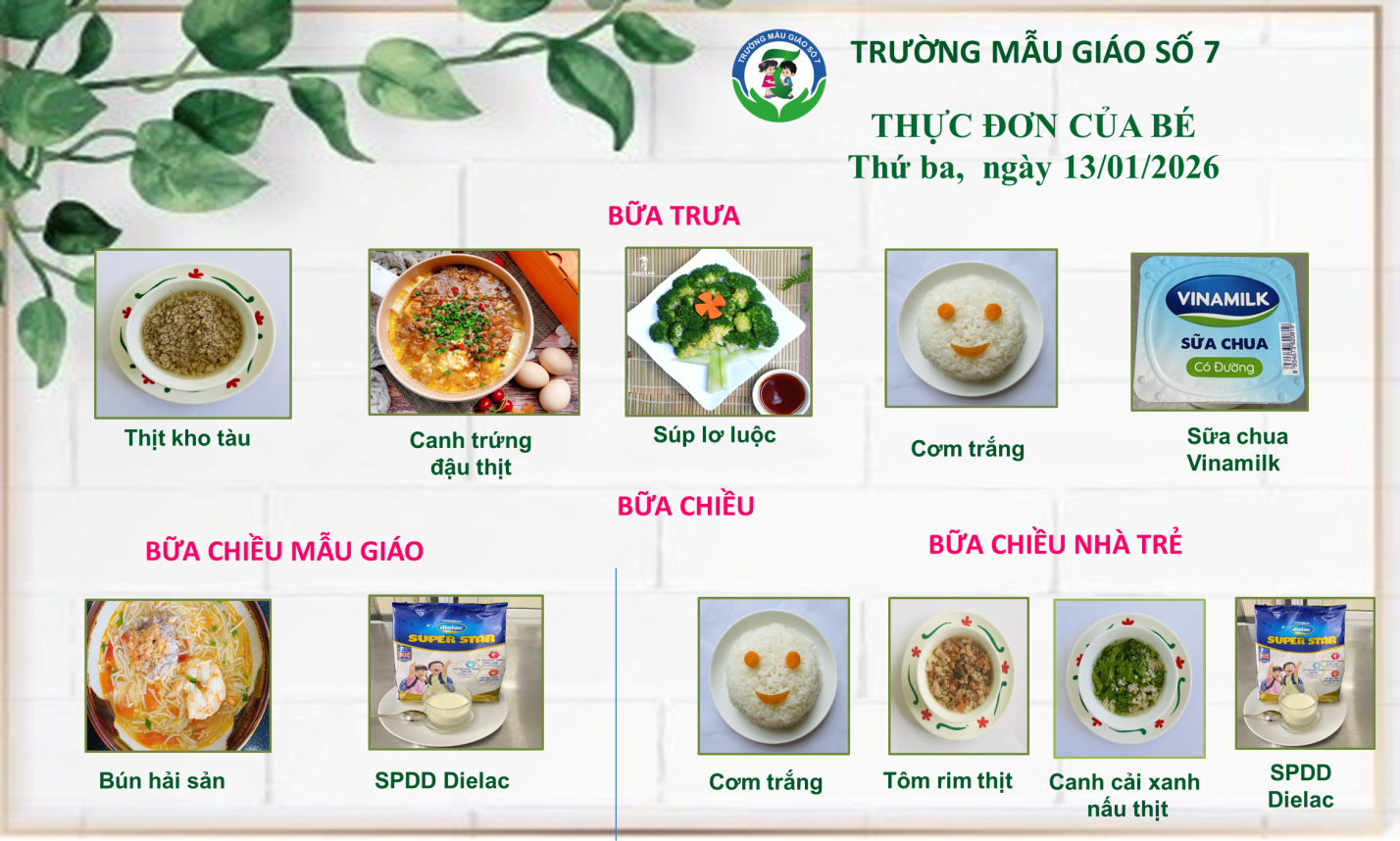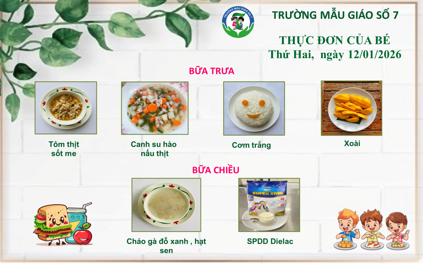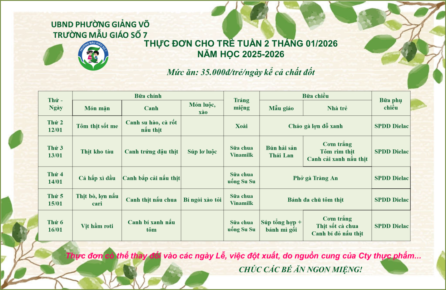 Trường Mẫu giáo Số 7 kính gửi đến Quý Phụ huynh thực đơn của bé tuần 2 tháng 01/2026 (từ ngày 12/01 đến ngày 16/01/2026)