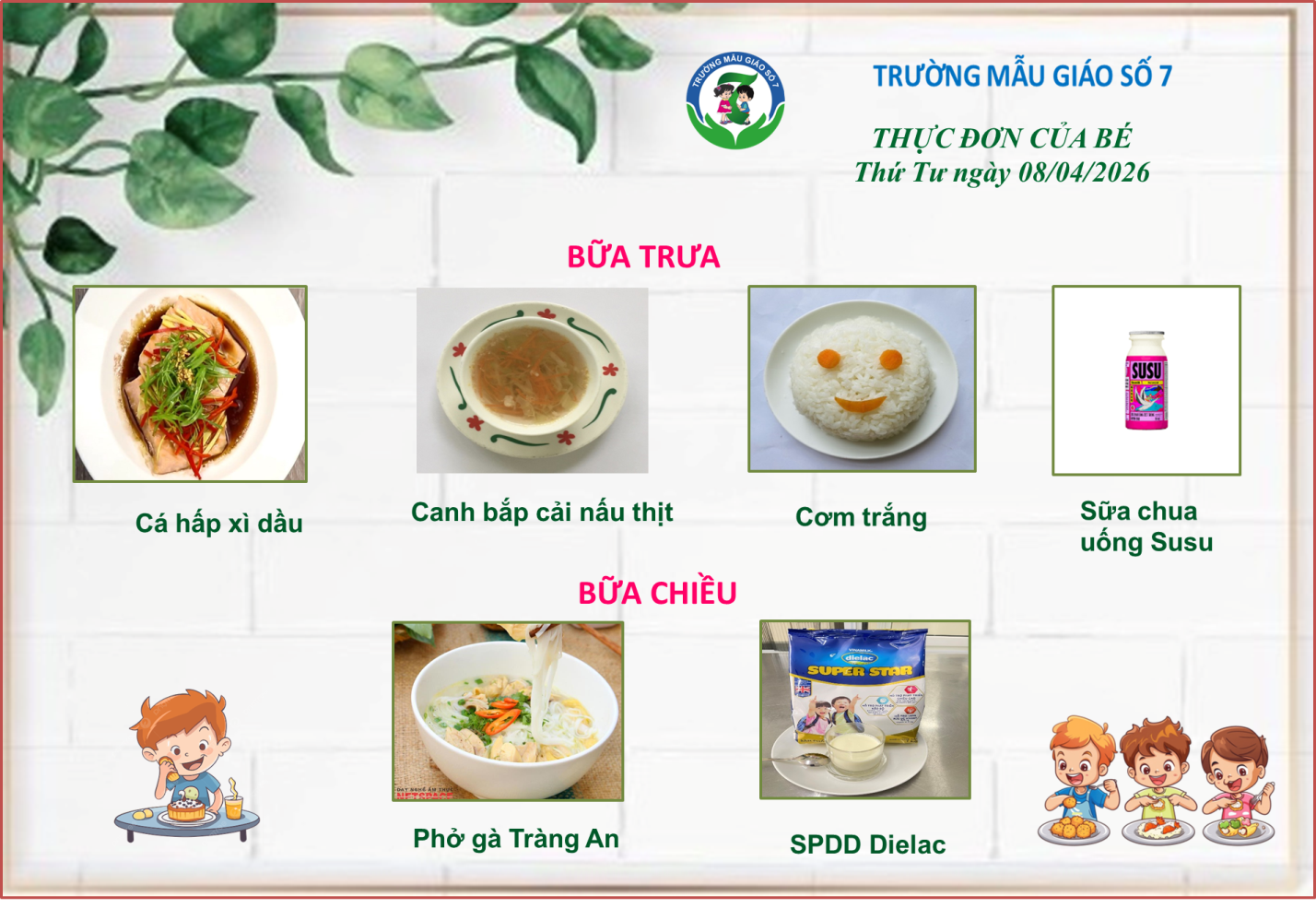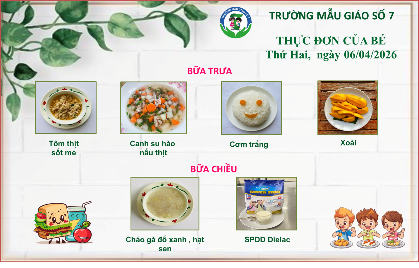 Thực đơn của các bé có thể được điều chỉnh tùy thuộc vào nguồn cung ứng thực phẩm.