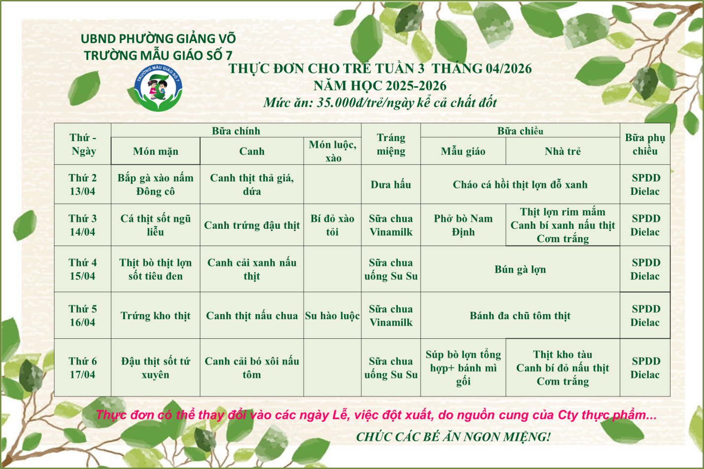Dưới đây là thực đơn của bé tuần 3 tháng 04/2026
