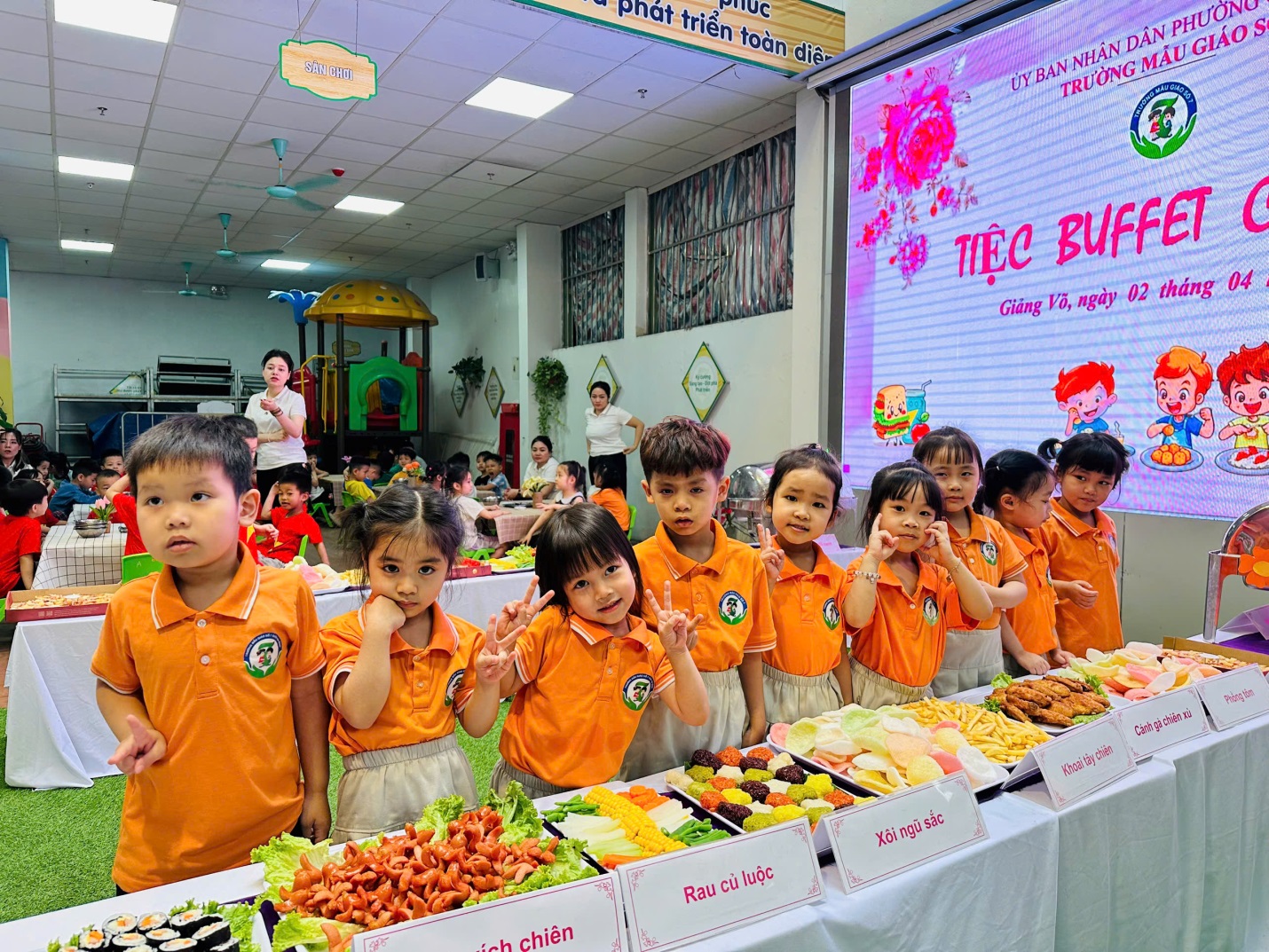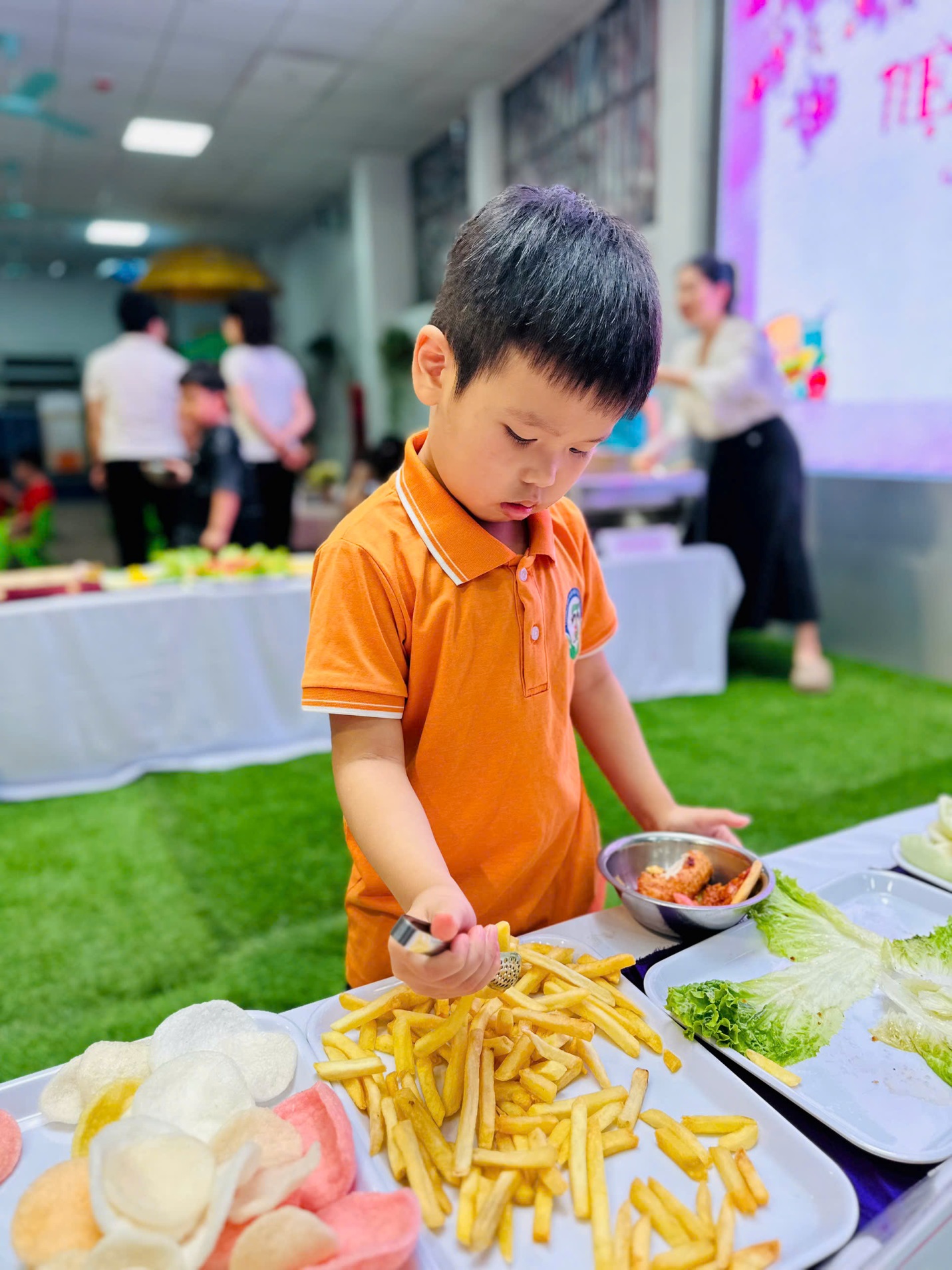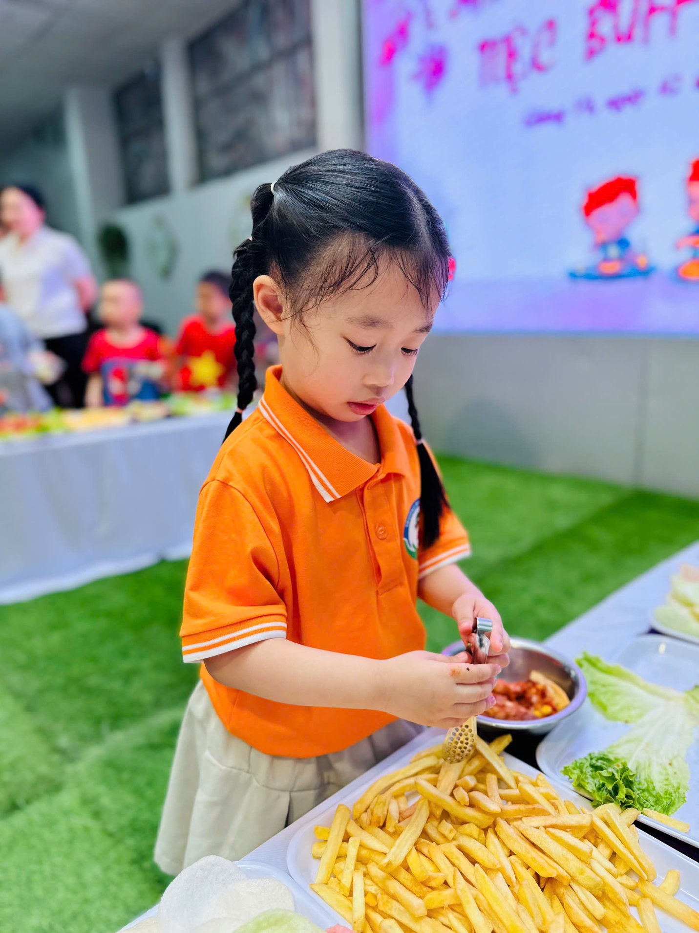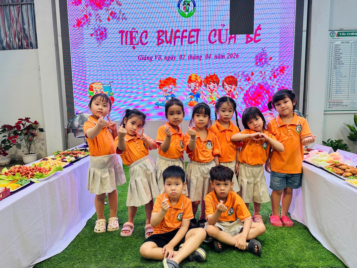 Liên hoan Buffet cho trẻ mẫu giáo là một hoạt động thú vị và bổ ích, giúp các bé vừa được thưởng thức nhiều món ăn hấp dẫn vừa rèn luyện kỹ năng tự phục vụ. Trong không gian trang trí sinh động, các bé được tự chọn những món mình yêu thích như bánh piza,mì Ý, xôi ngũ sắc, gà rán, xúc xích, khoai chiên... hay các món ăn nhẹ phù hợp với lứa tuổi. Dưới sự hướng dẫn của cô giáo, trẻ học cách xếp hàng, lấy thức ăn vừa đủ và giữ gìn vệ sinh khi ăn uống. Không chỉ mang lại niềm vui, buổi liên hoan còn giúp các bé mạnh dạn hơn, biết chia sẻ và hòa đồng với bạn bè, tạo nên những kỷ niệm đẹp trong những năm tháng đầu đời.