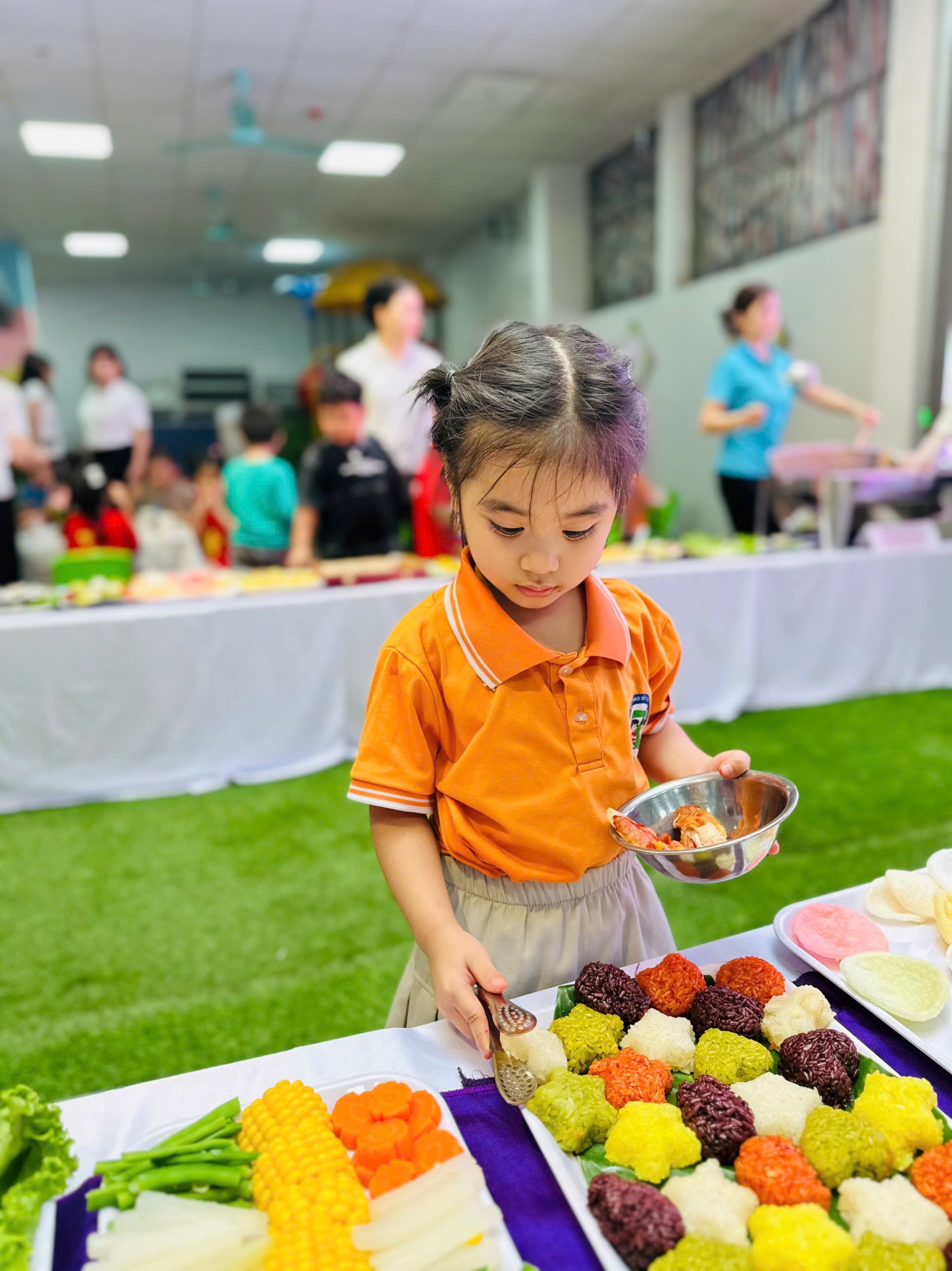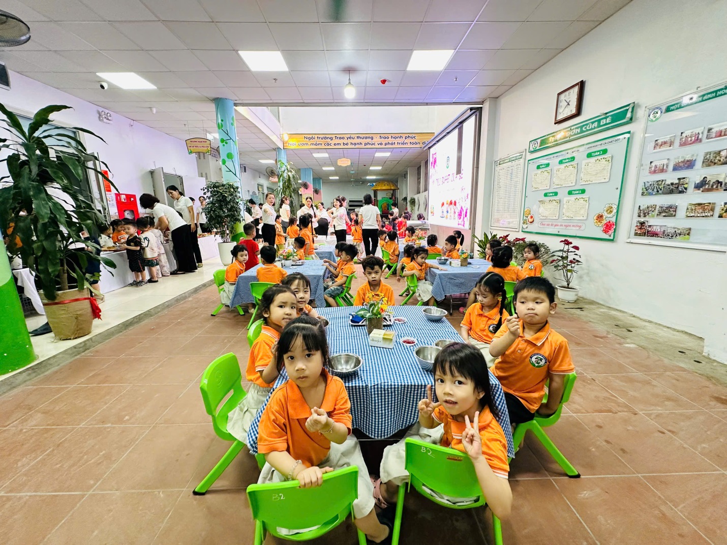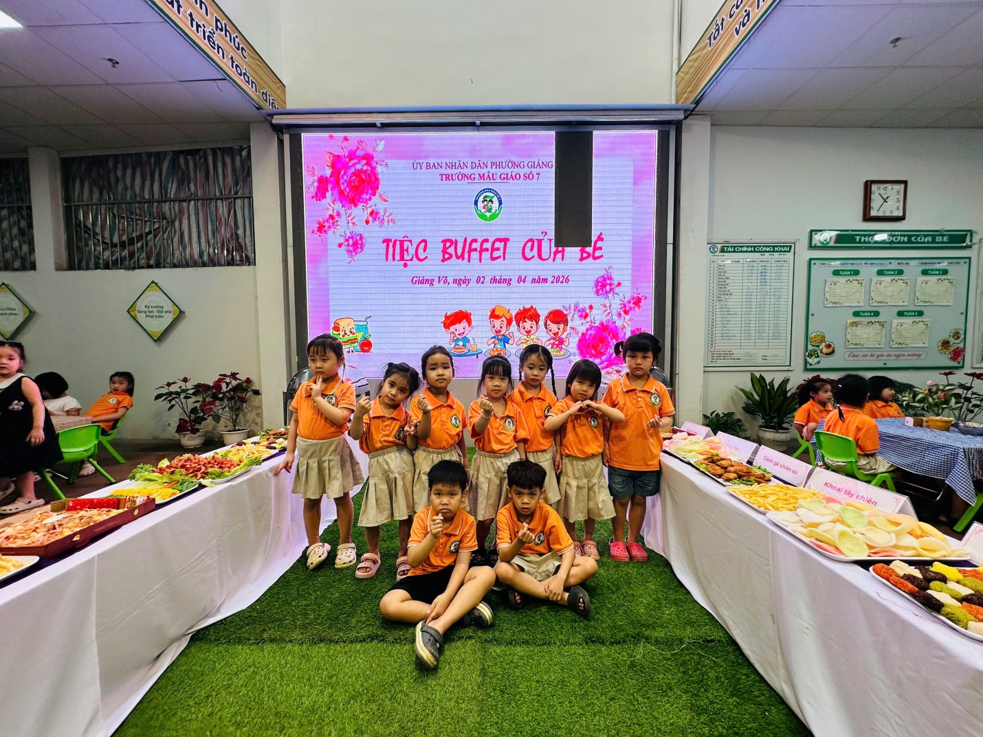 Liên hoan Buffet cho trẻ mẫu giáo là một hoạt động thú vị và bổ ích, giúp các bé vừa được thưởng thức nhiều món ăn hấp dẫn vừa rèn luyện kỹ năng tự phục vụ. Trong không gian trang trí sinh động, các bé được tự chọn những món mình yêu thích như bánh piza,mì Ý, xôi ngũ sắc, gà rán, xúc xích, khoai chiên... hay các món ăn nhẹ phù hợp với lứa tuổi. Dưới sự hướng dẫn của cô giáo, trẻ học cách xếp hàng, lấy thức ăn vừa đủ và giữ gìn vệ sinh khi ăn uống. Không chỉ mang lại niềm vui, buổi liên hoan còn giúp các bé mạnh dạn hơn, biết chia sẻ và hòa đồng với bạn bè, tạo nên những kỷ niệm đẹp trong những năm tháng đầu đời.