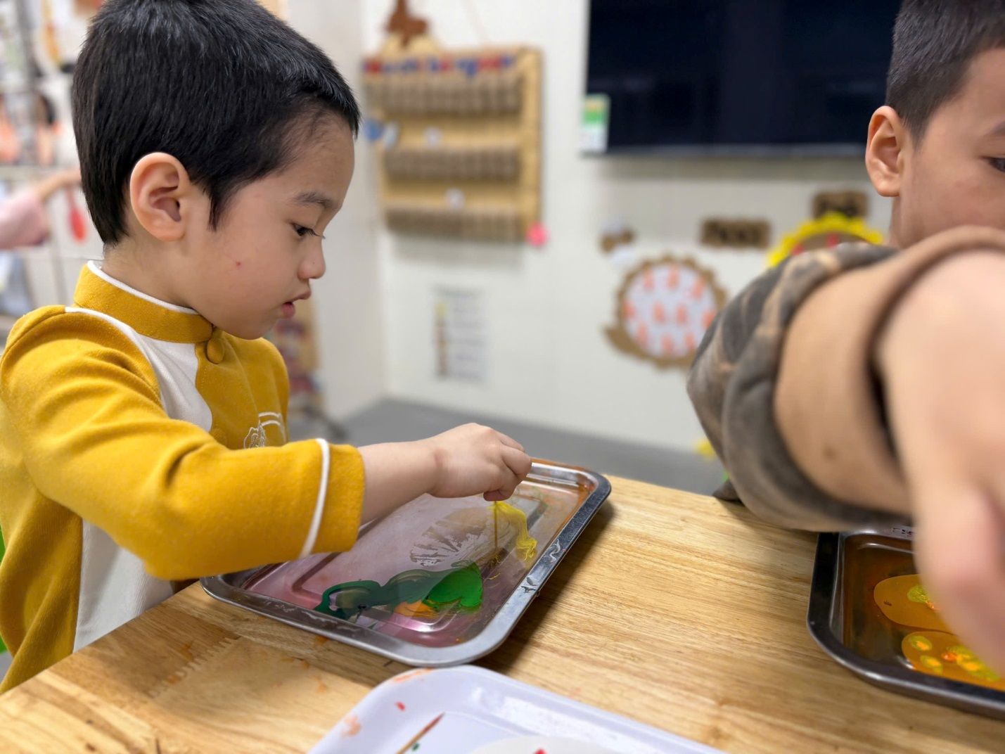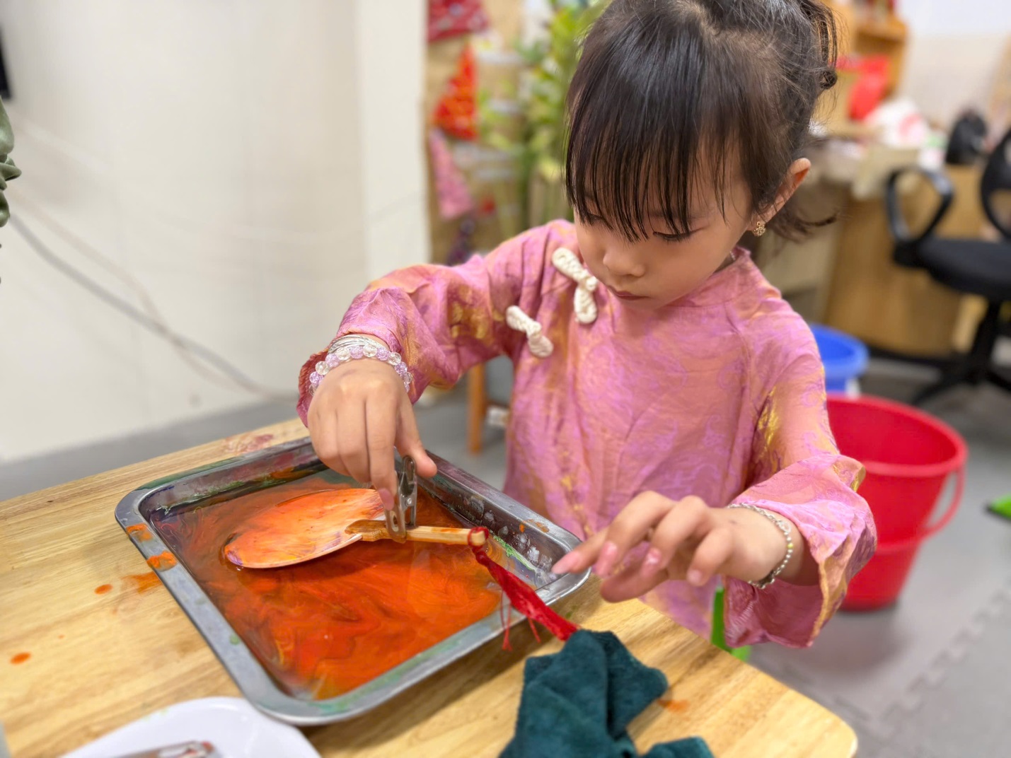 Lần đầu tiên, các con được tiếp xúc với bộ môn Thủy ấn (Ebru Art) – vẽ tranh trên mặt nước. Thay vì dùng cọ vẽ trực tiếp lên giấy, các "nghệ sĩ nhí" lớp A1 đã: