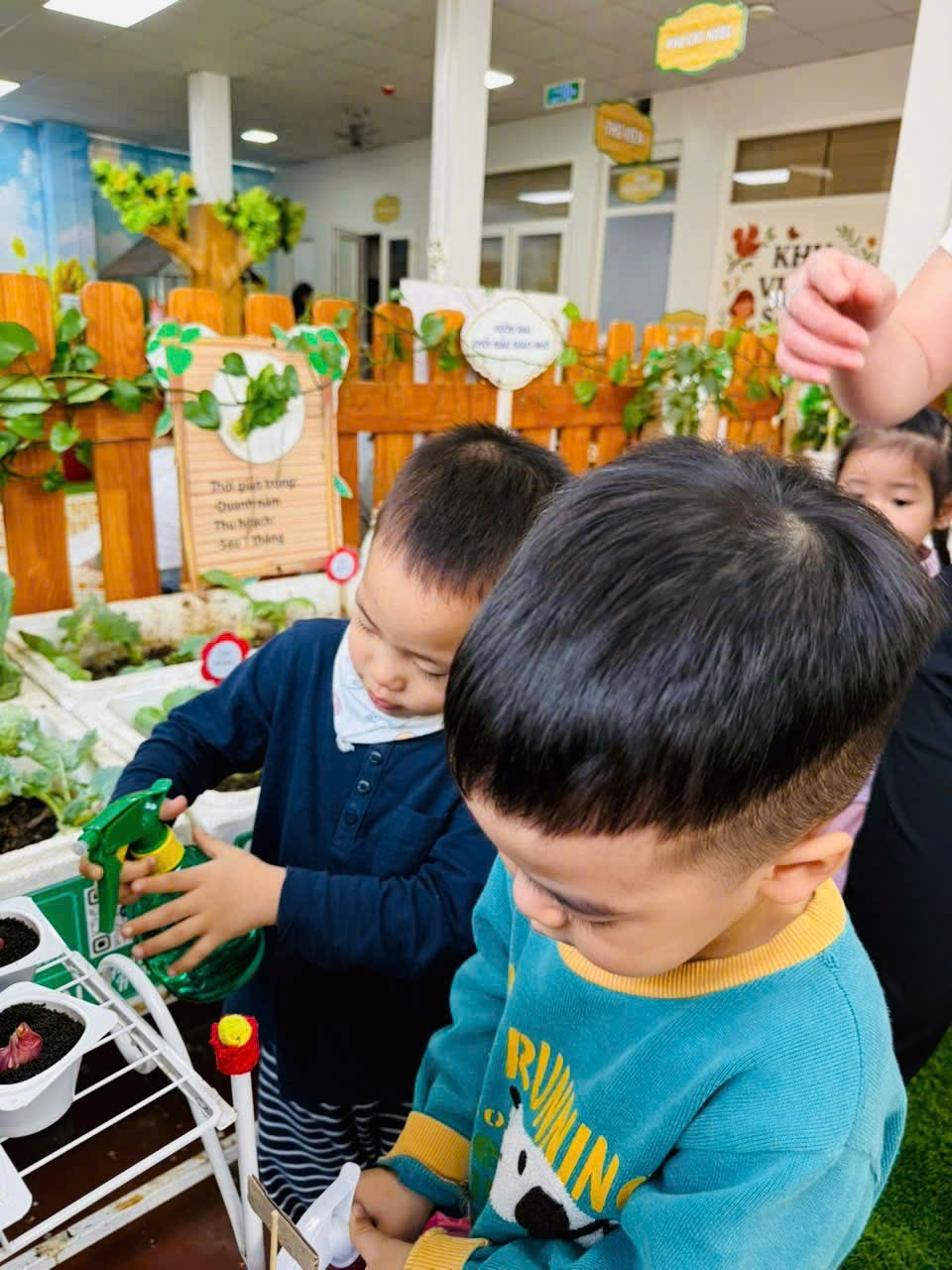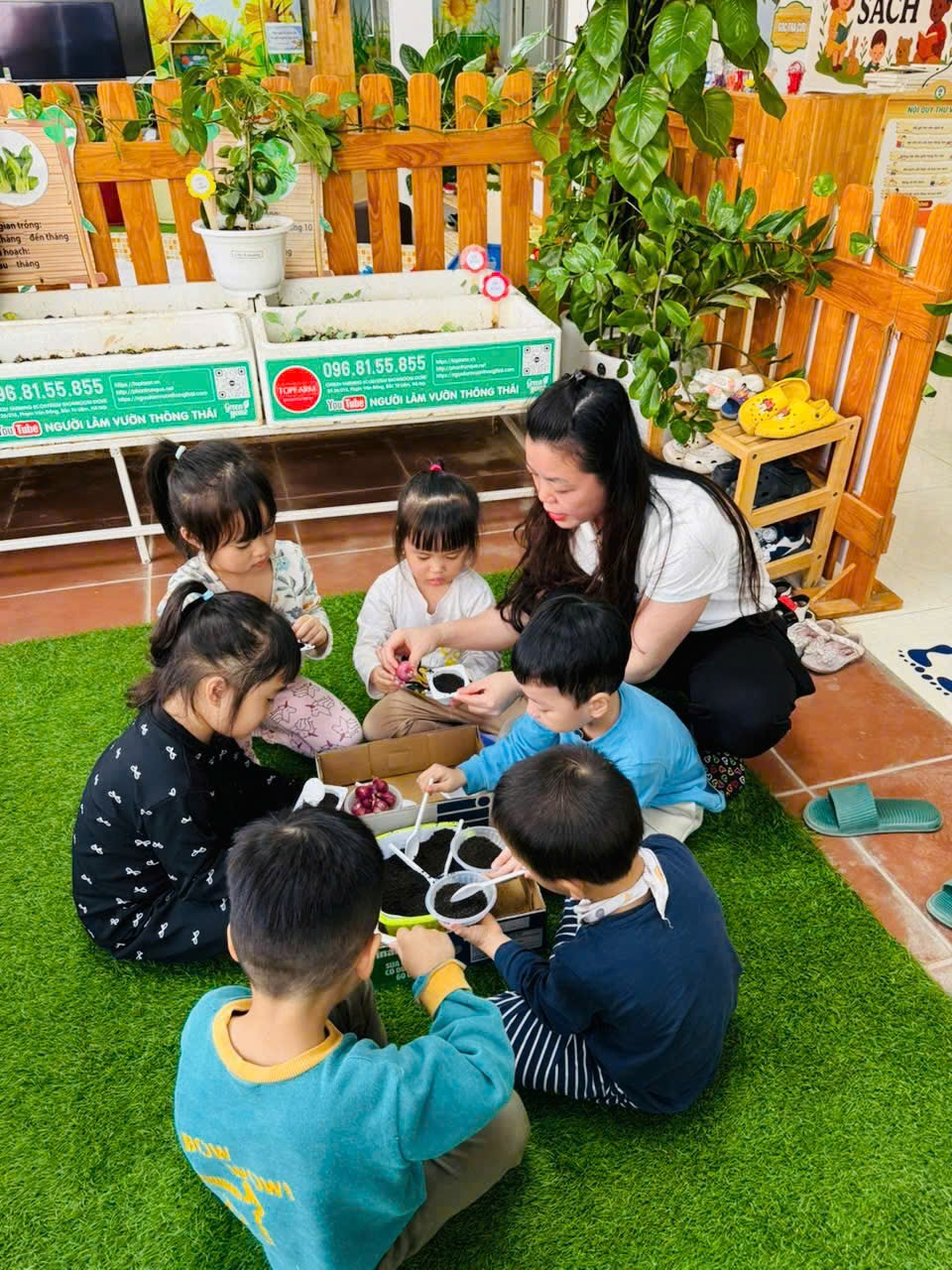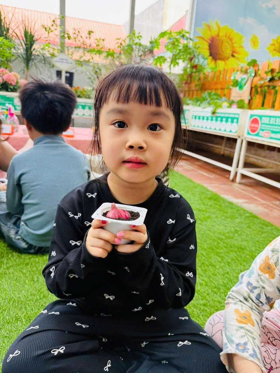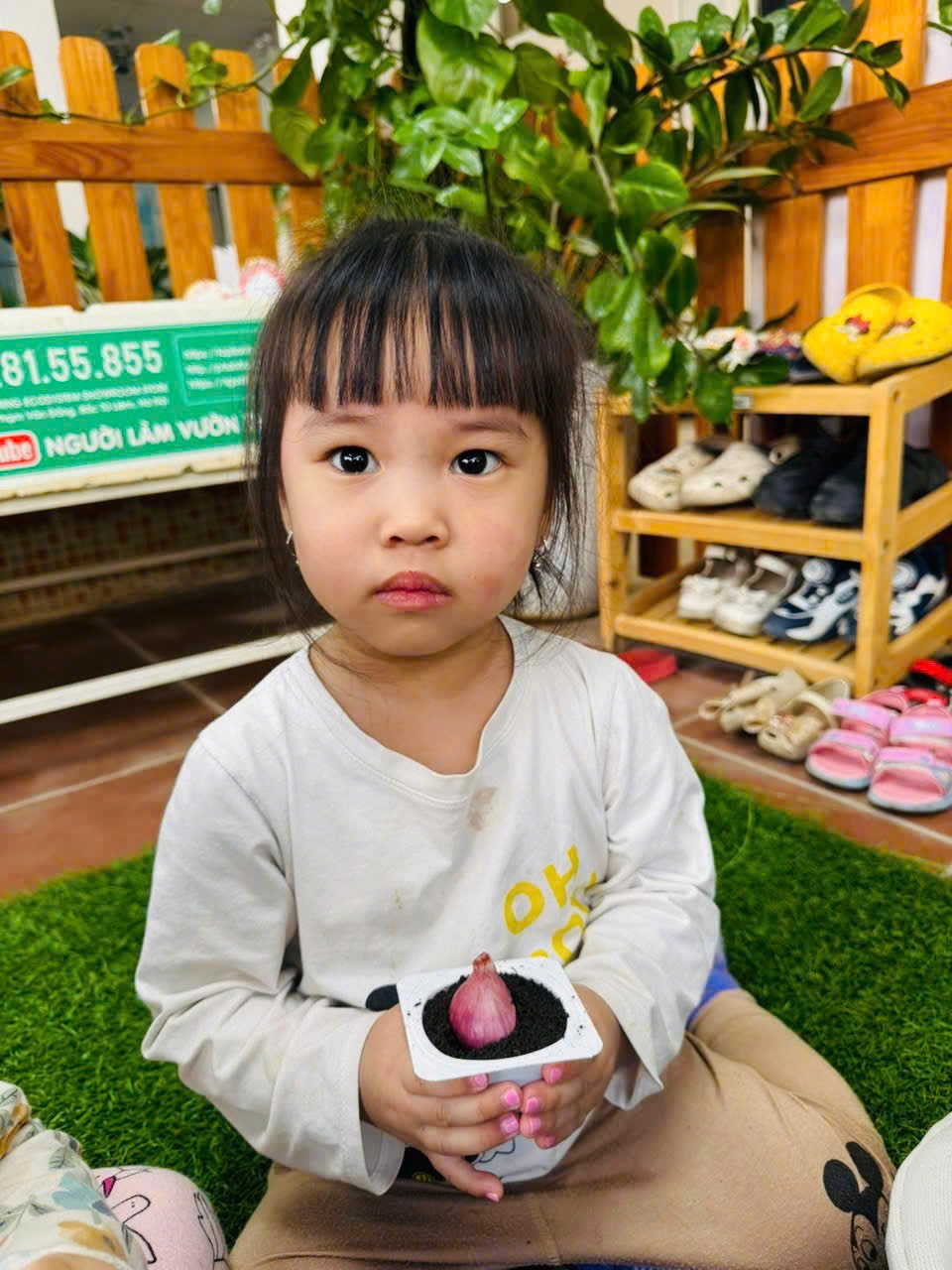 Các bé rất hào hứng khi tự tay đặt củ hành xuống đất, lấp đất và tưới nước cho cây. Qua hoạt động này, trẻ không chỉ rèn luyện sự khéo léo của đôi tay mà còn học được cách chăm sóc cây xanh, biết yêu thiên nhiên và hình thành ý thức bảo vệ môi trường.