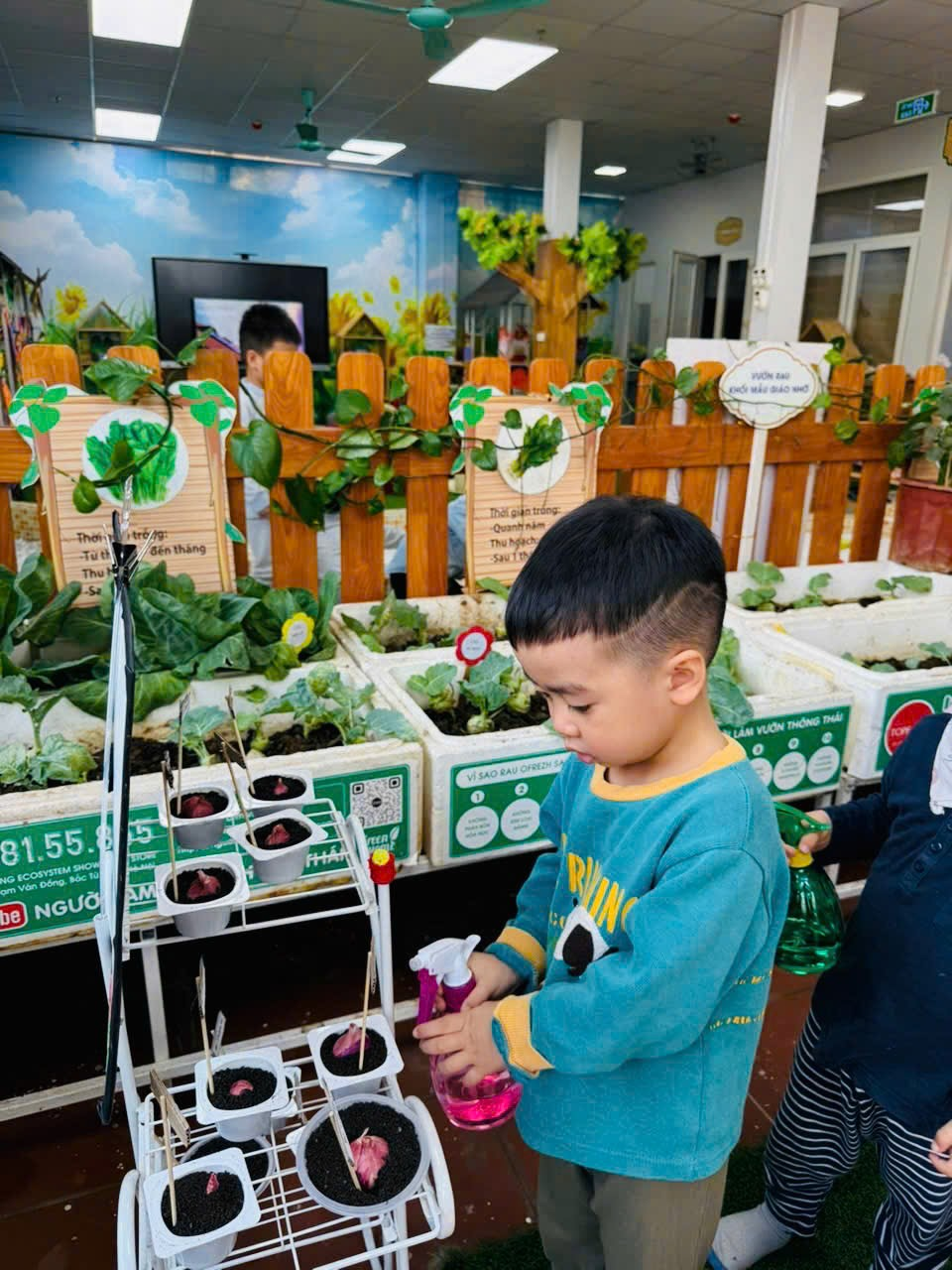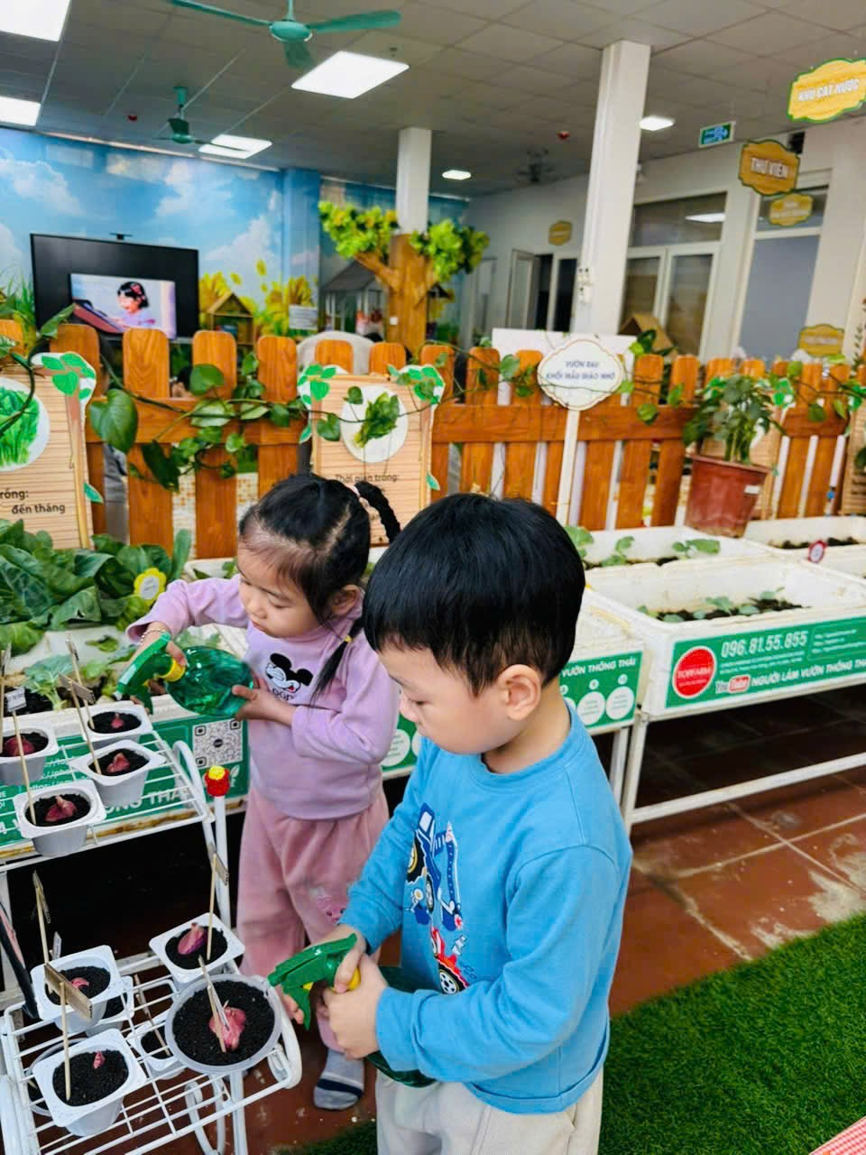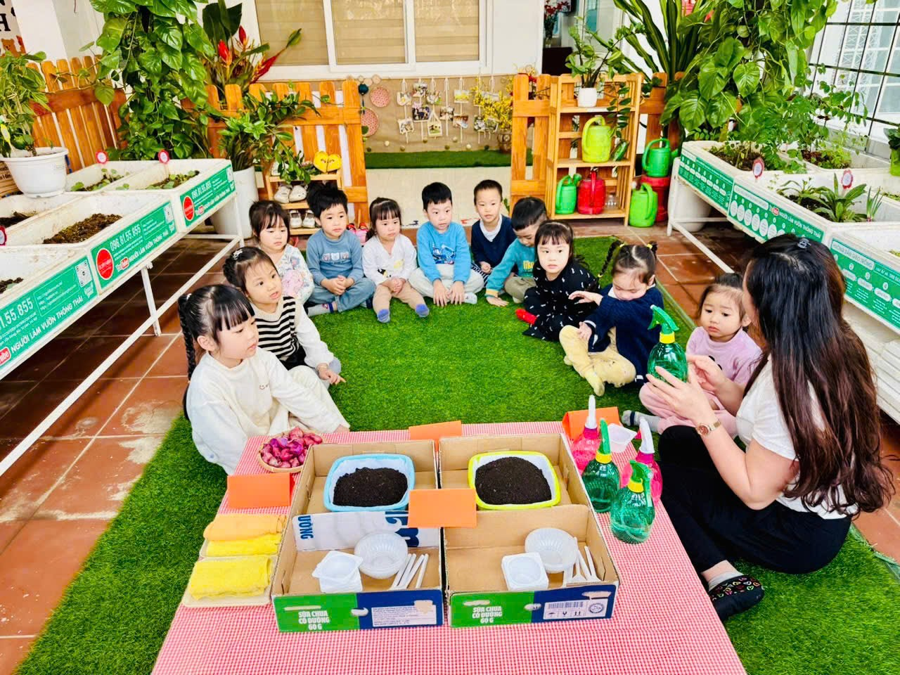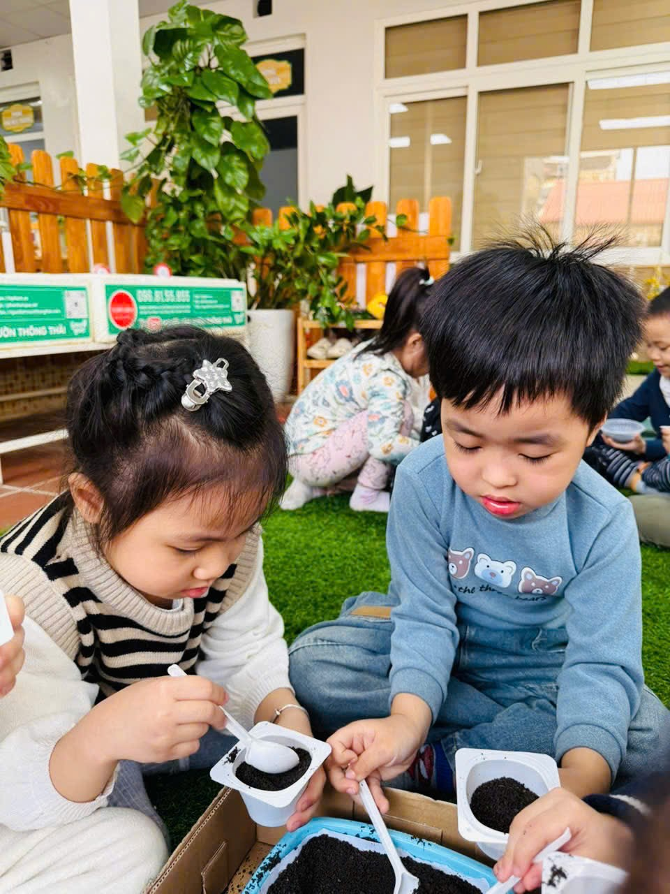 Các bé rất hào hứng khi tự tay đặt củ hành xuống đất, lấp đất và tưới nước cho cây. Qua hoạt động này, trẻ không chỉ rèn luyện sự khéo léo của đôi tay mà còn học được cách chăm sóc cây xanh, biết yêu thiên nhiên và hình thành ý thức bảo vệ môi trường.