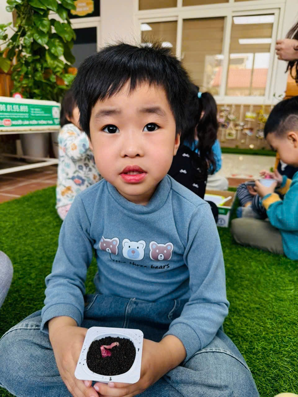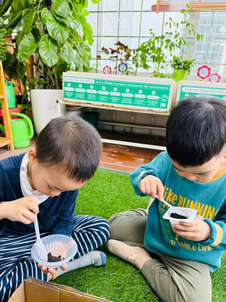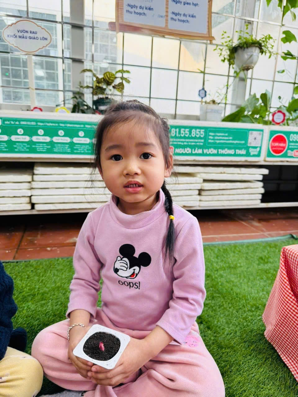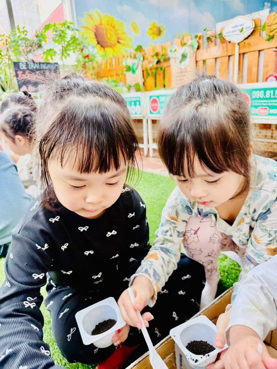 Các bé rất hào hứng khi tự tay đặt củ hành xuống đất, lấp đất và tưới nước cho cây. Qua hoạt động này, trẻ không chỉ rèn luyện sự khéo léo của đôi tay mà còn học được cách chăm sóc cây xanh, biết yêu thiên nhiên và hình thành ý thức bảo vệ môi trường.
